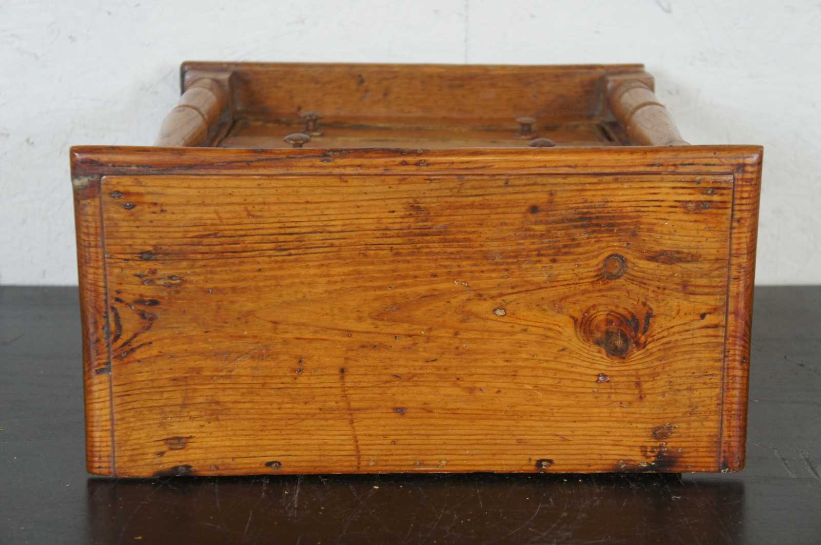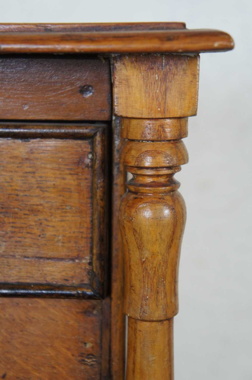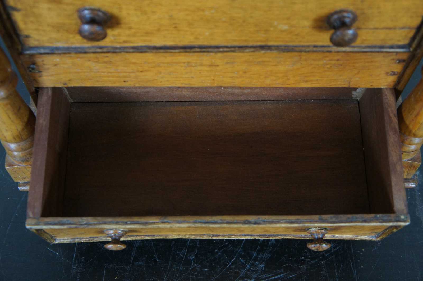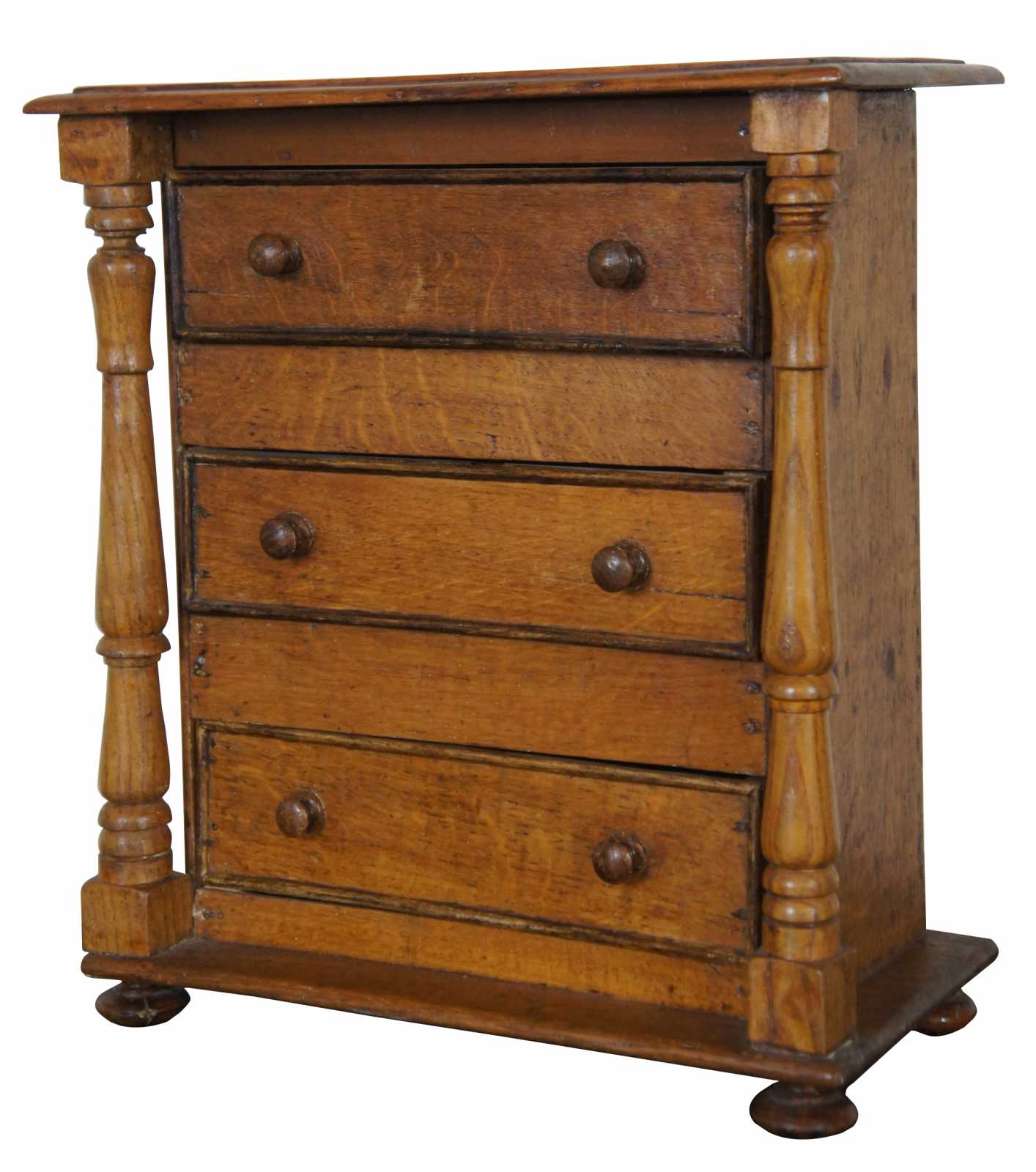 Circa 1850s American Empire miniature salesman sample tallboy chest of drawers. Made from quartersawn oak and pine with three drawers, turned posts and bun feet.