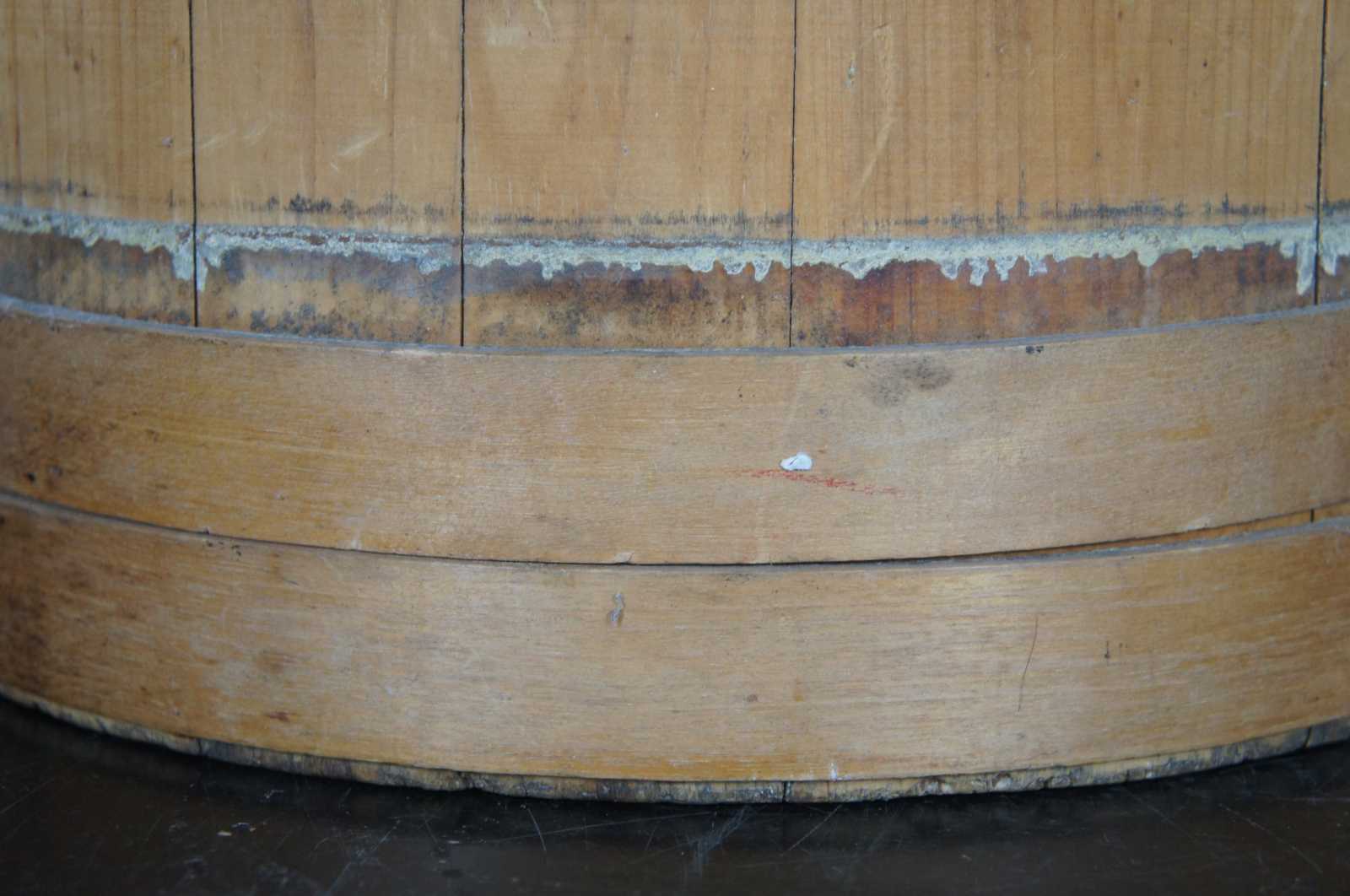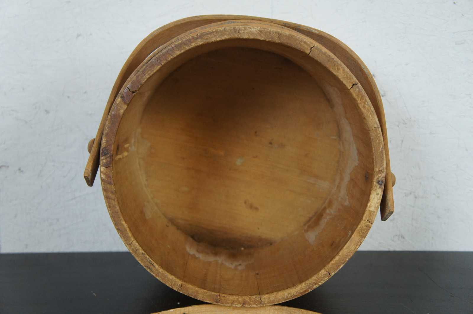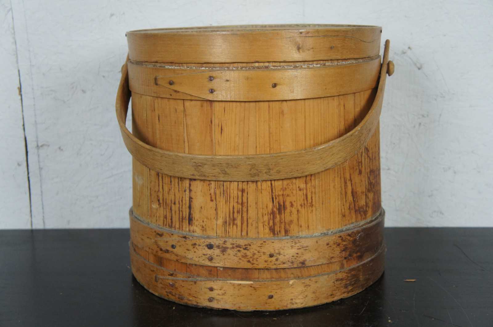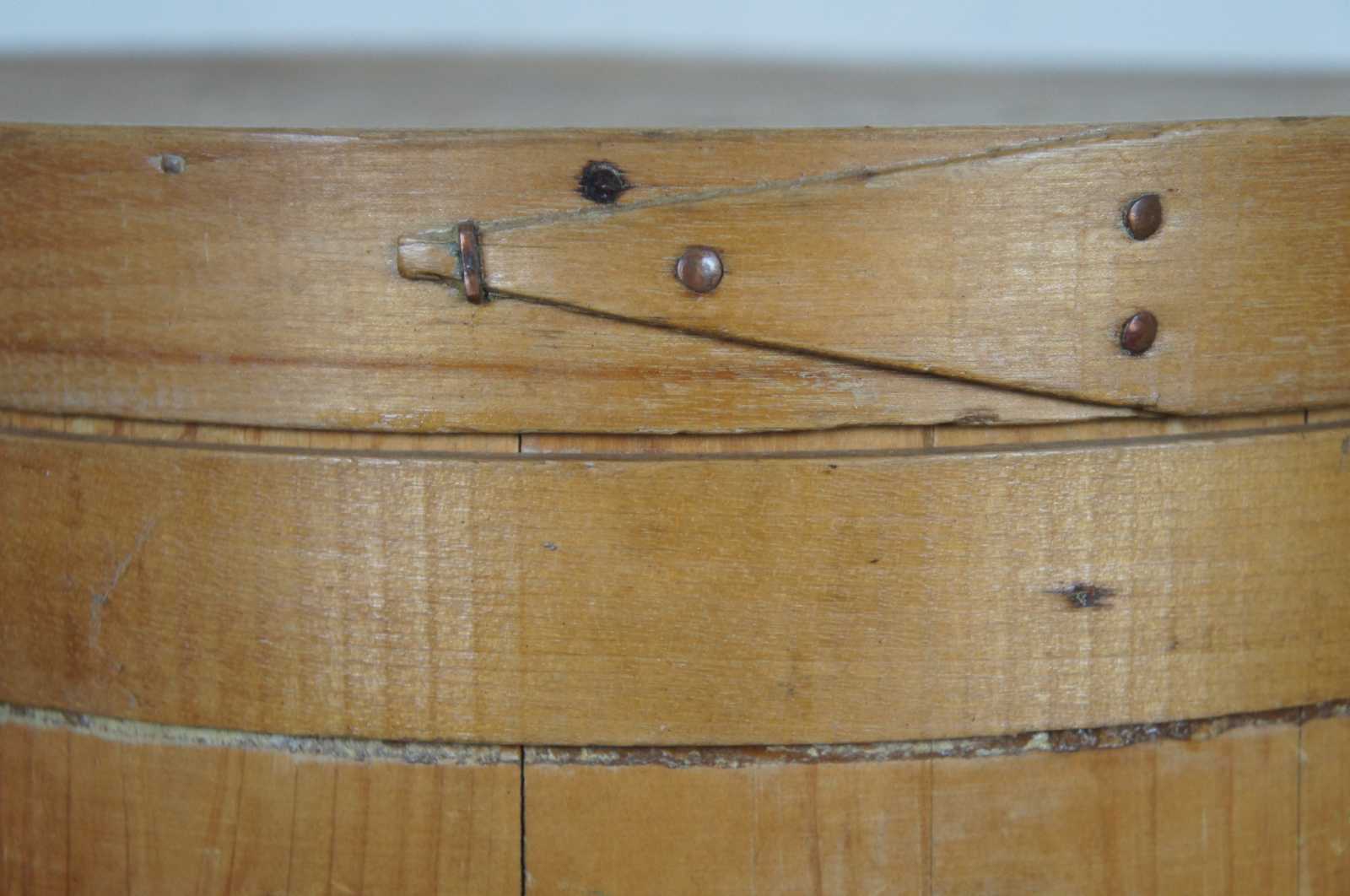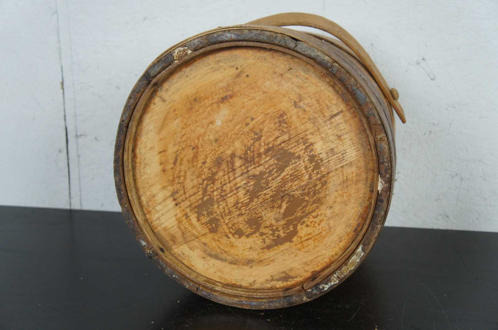Antique 19th century wooden firkin or sugar bucket with rotating handle and lid.