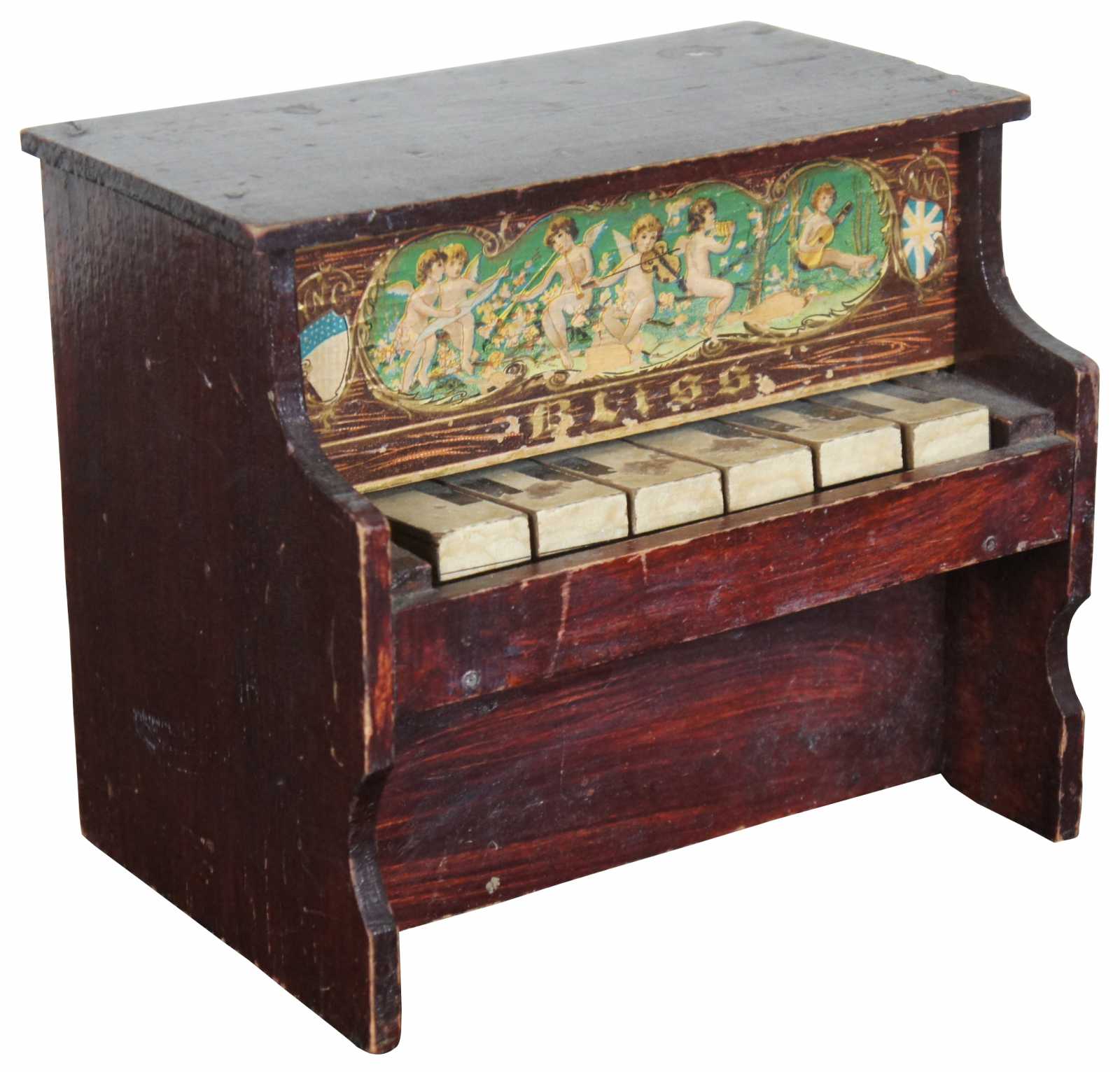 Antique German Bliss toy piano with a six note glockenspiel and lithograph image of cherubs playing instruments.