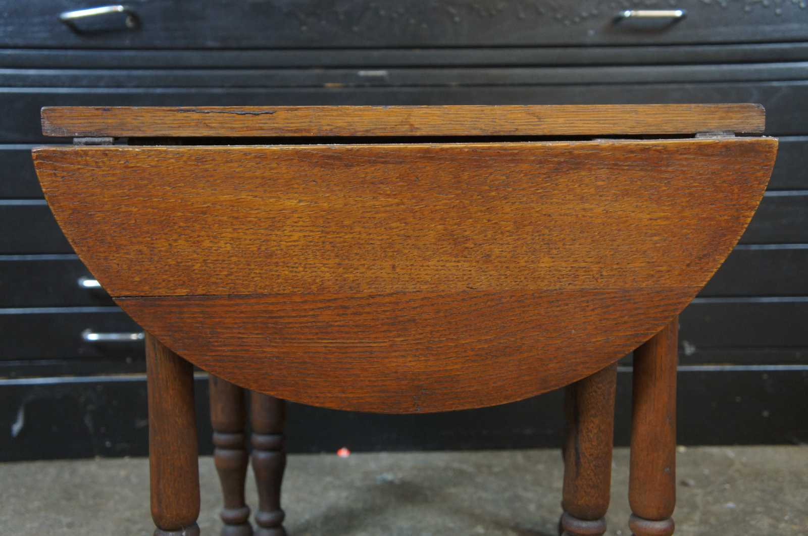 Early 20th century antique Victorian miniature salesman sample drop leaf gateleg dining table. Features a plank top with oval gateleg extensions.