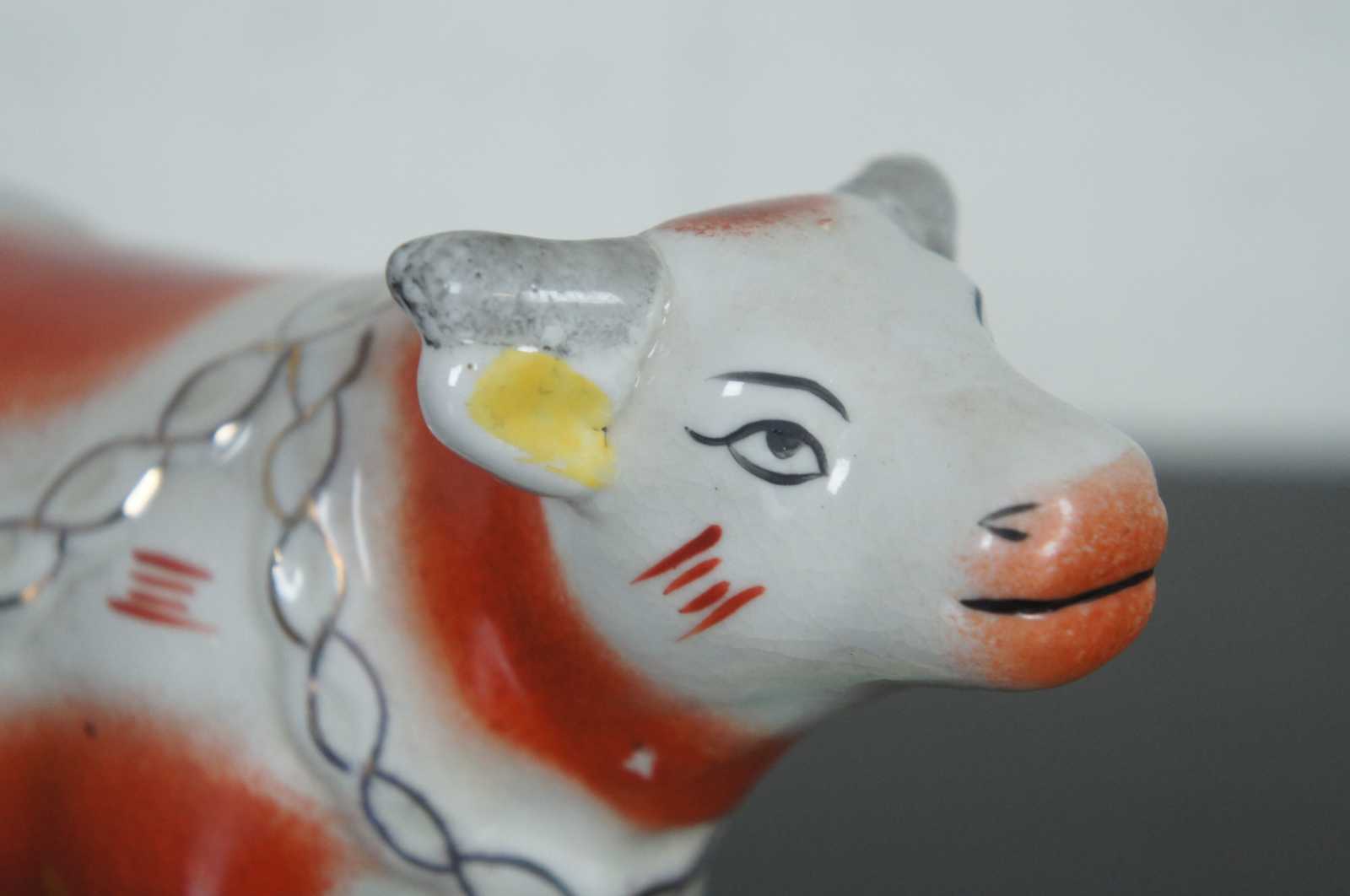 Antique 19th century Staffordshire pottery red and white dairy cow figurine standing on a grassy field with a golden chain draped around the neck.