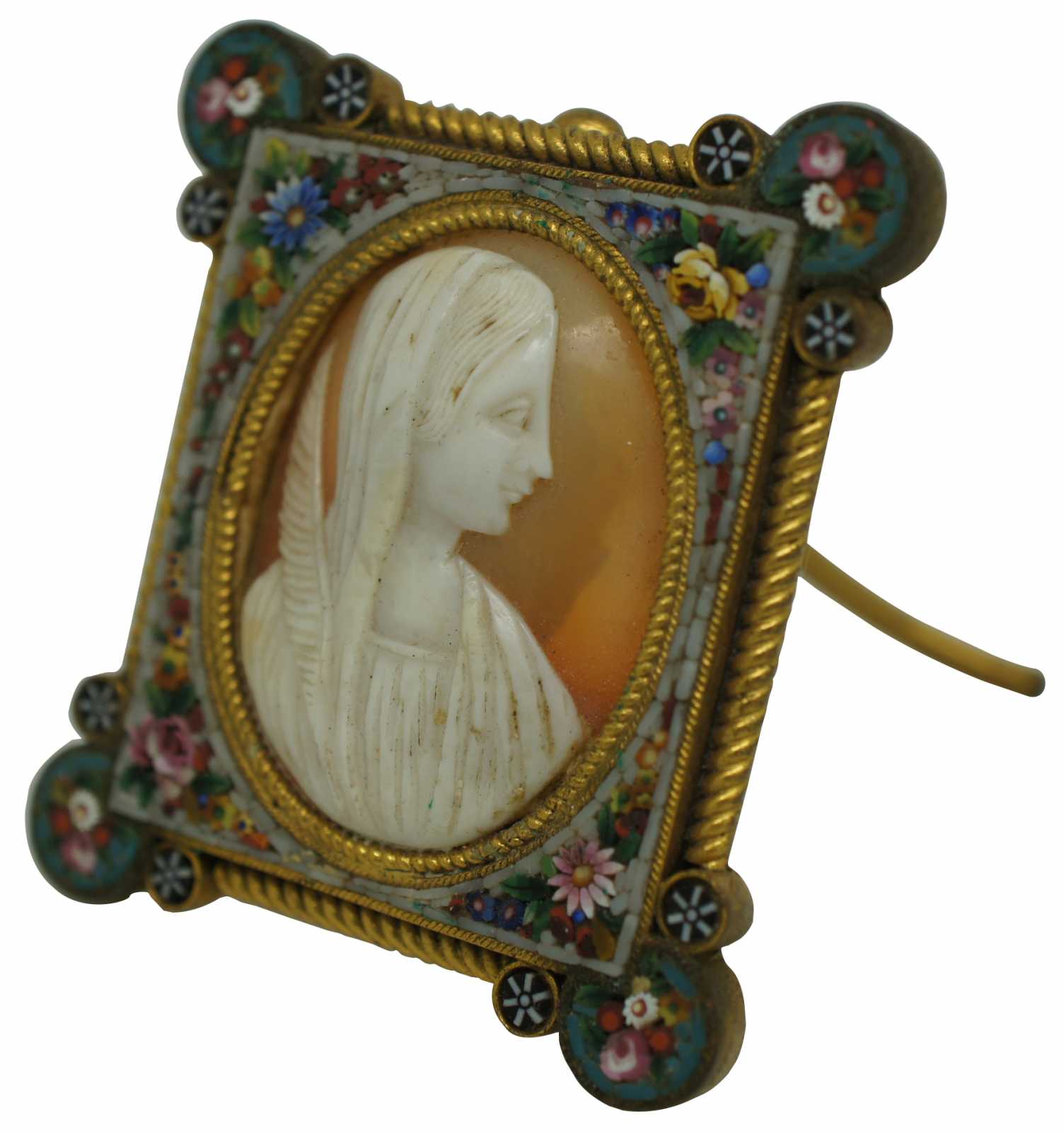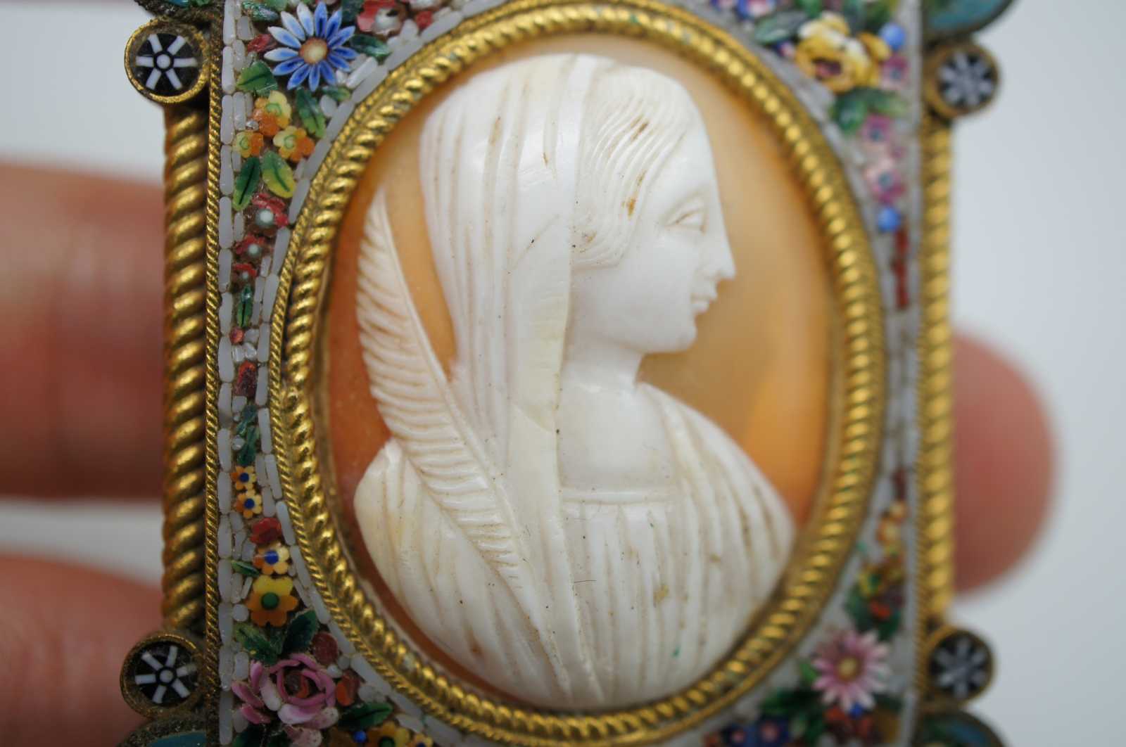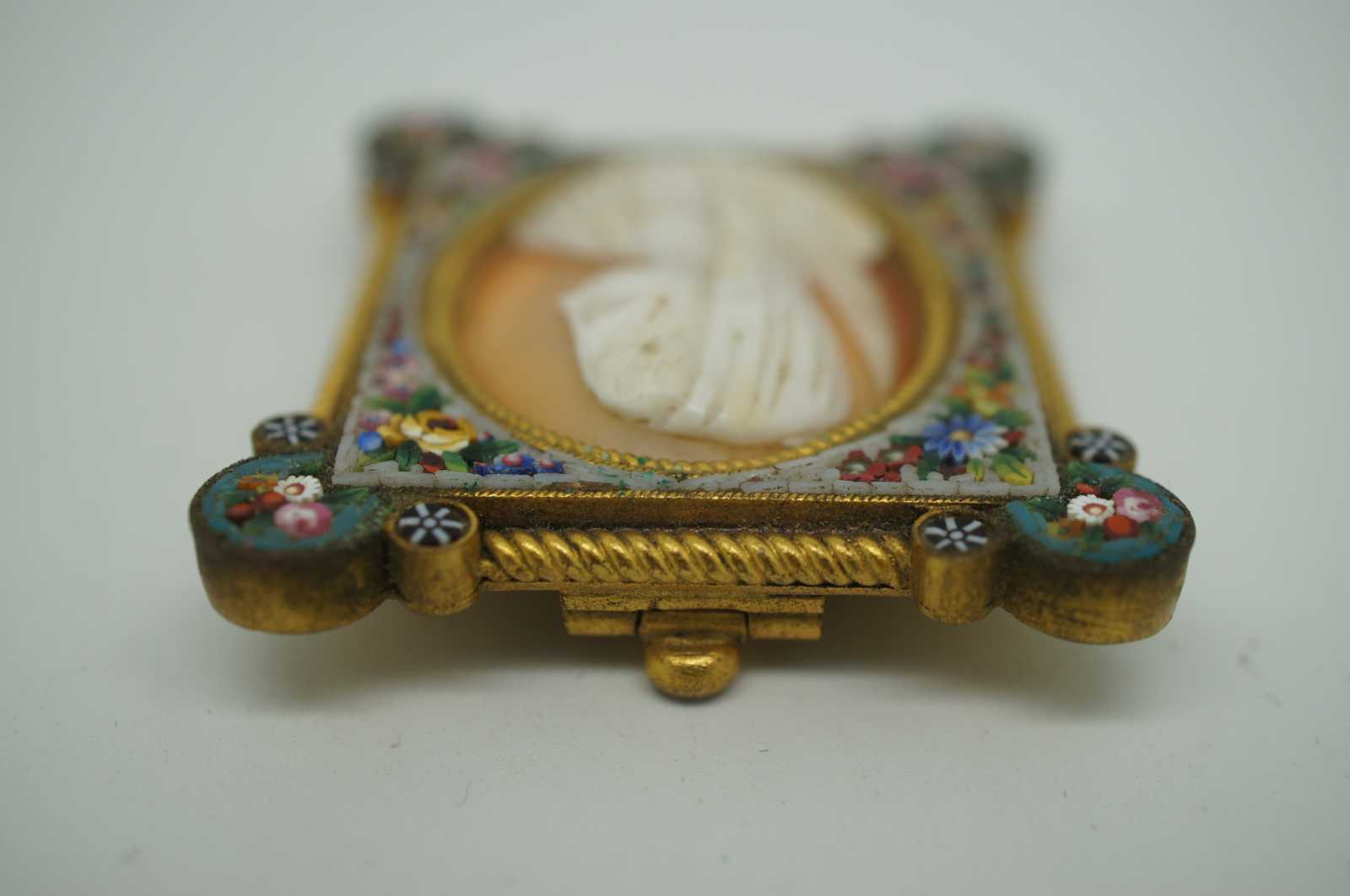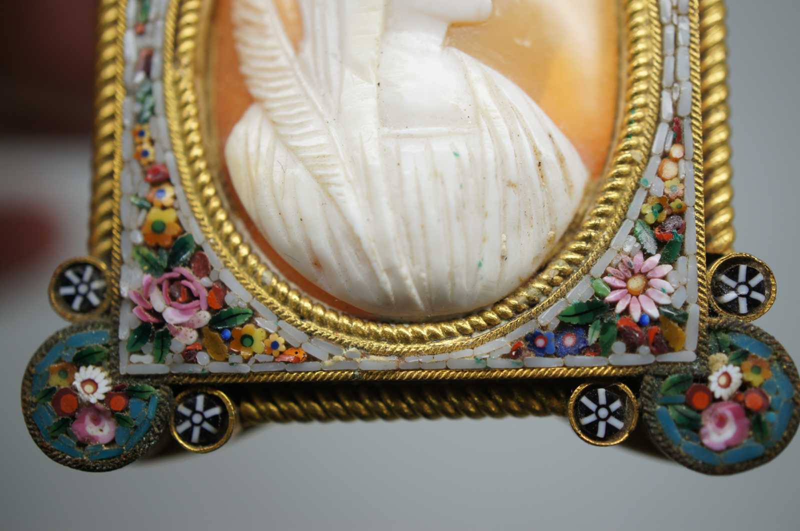 Fabbrica Angelo Pessar Exquisite antique floral micro mosaic and gold tone frame marked FAP with a folding kick stand, surrounding a peachy-orange and white shell cameo featuring a neoclassical veiled woman holding a feather, attributed to the Virgin Mary.