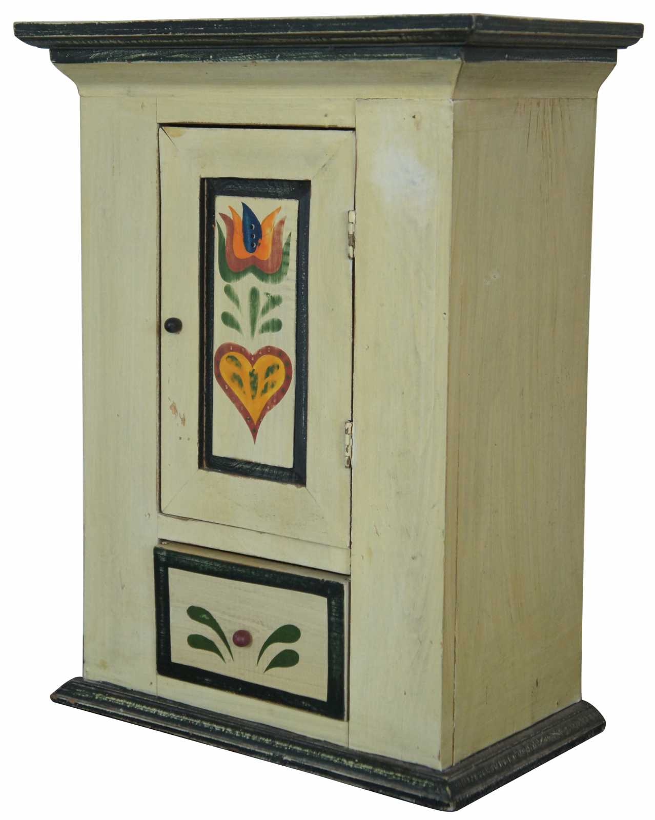 Vintage folk art hand painted miniature cabinet with two shelves and one drawer.