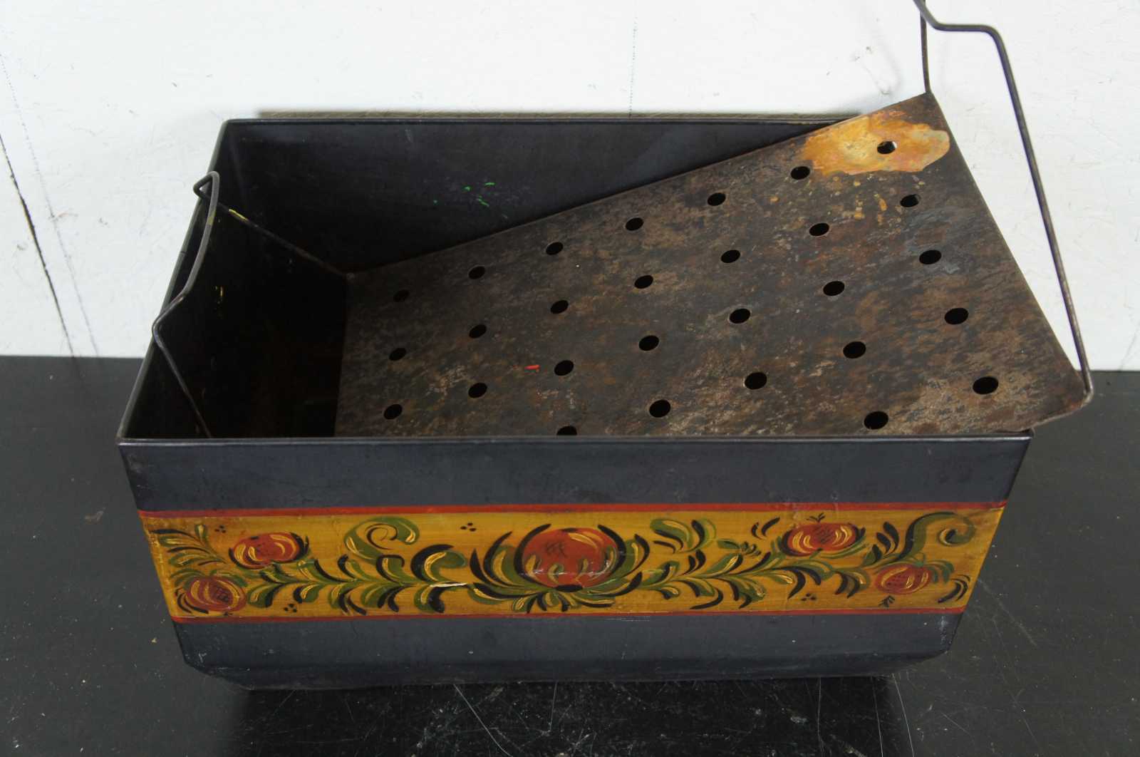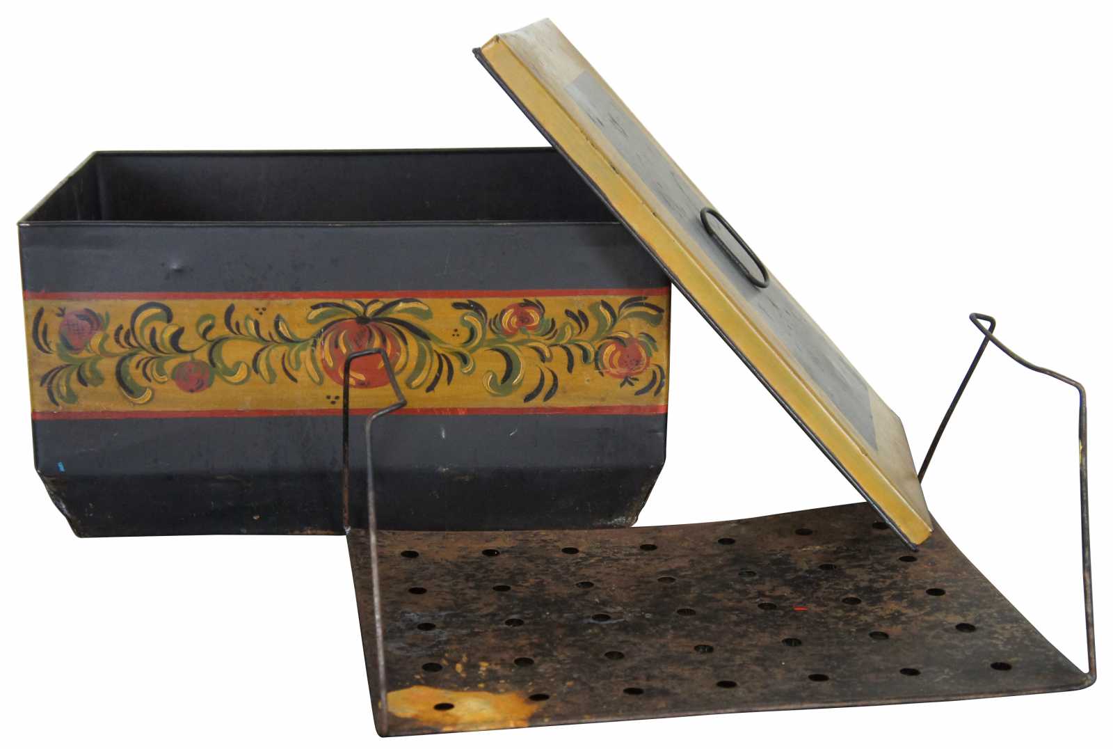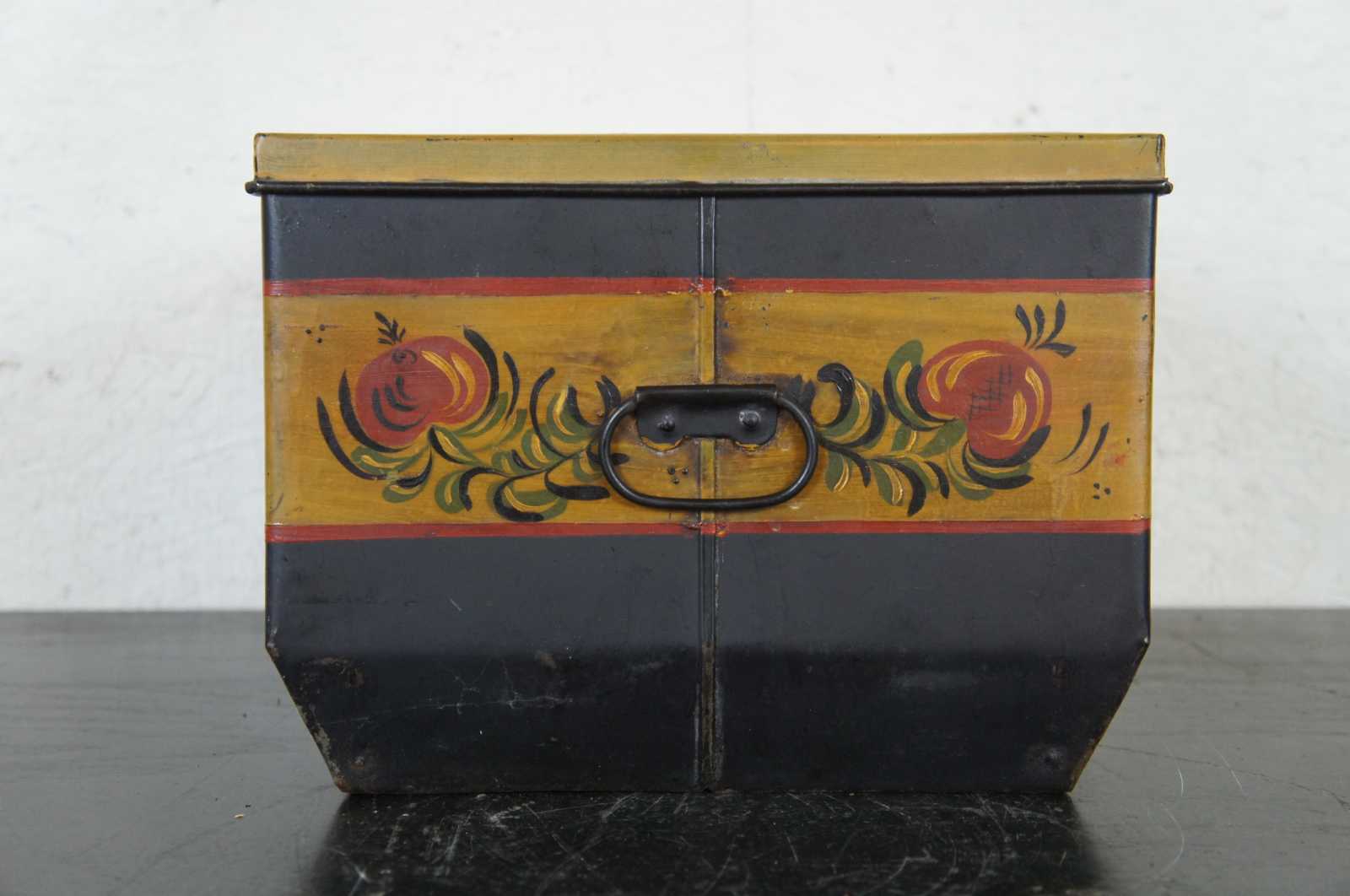 Antique painted toleware bread box by the Central Manufacturing Co, decorated with red tomatoes. The interior tray is removable and pierced with ventilation holes for airflow.