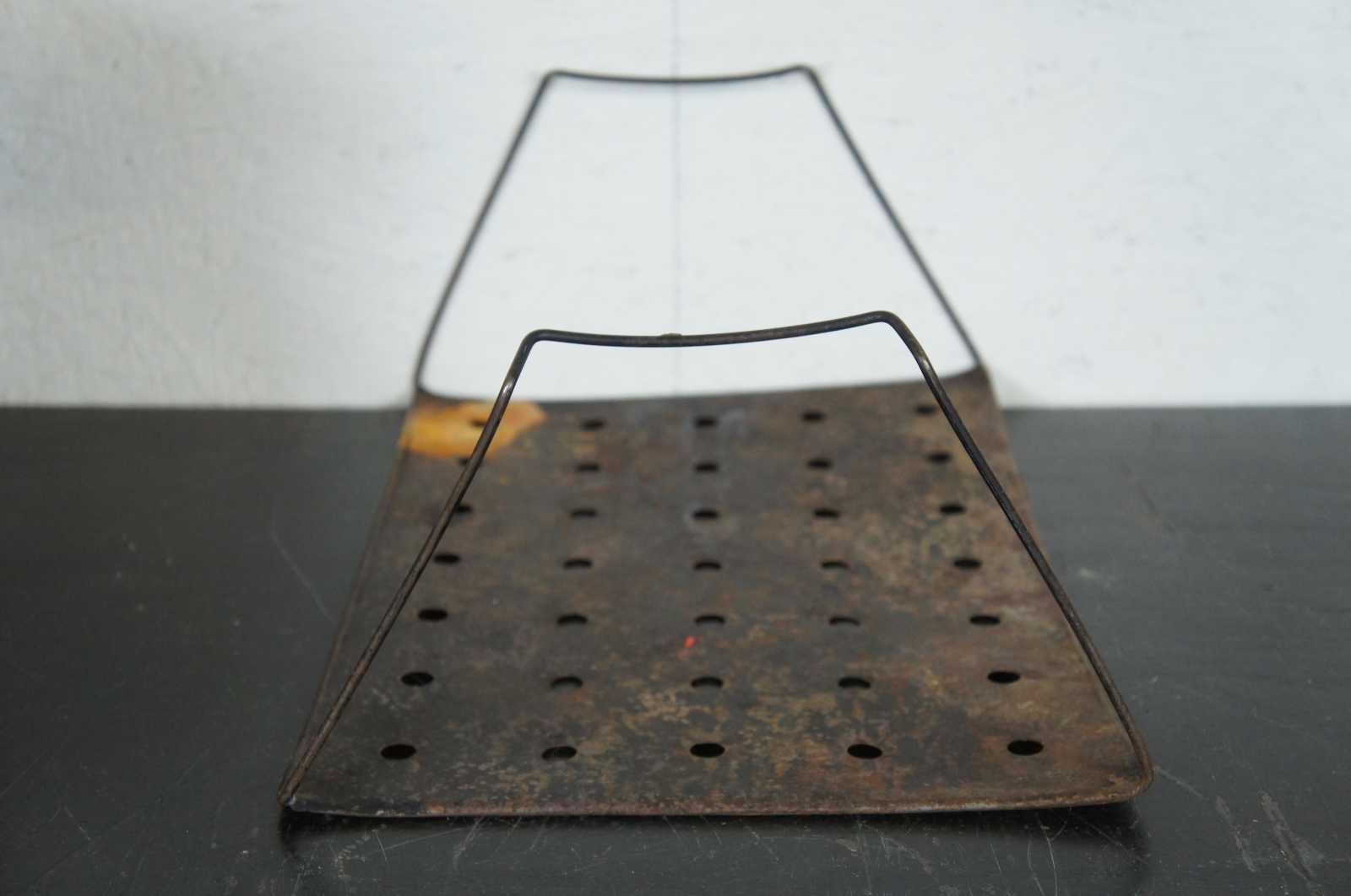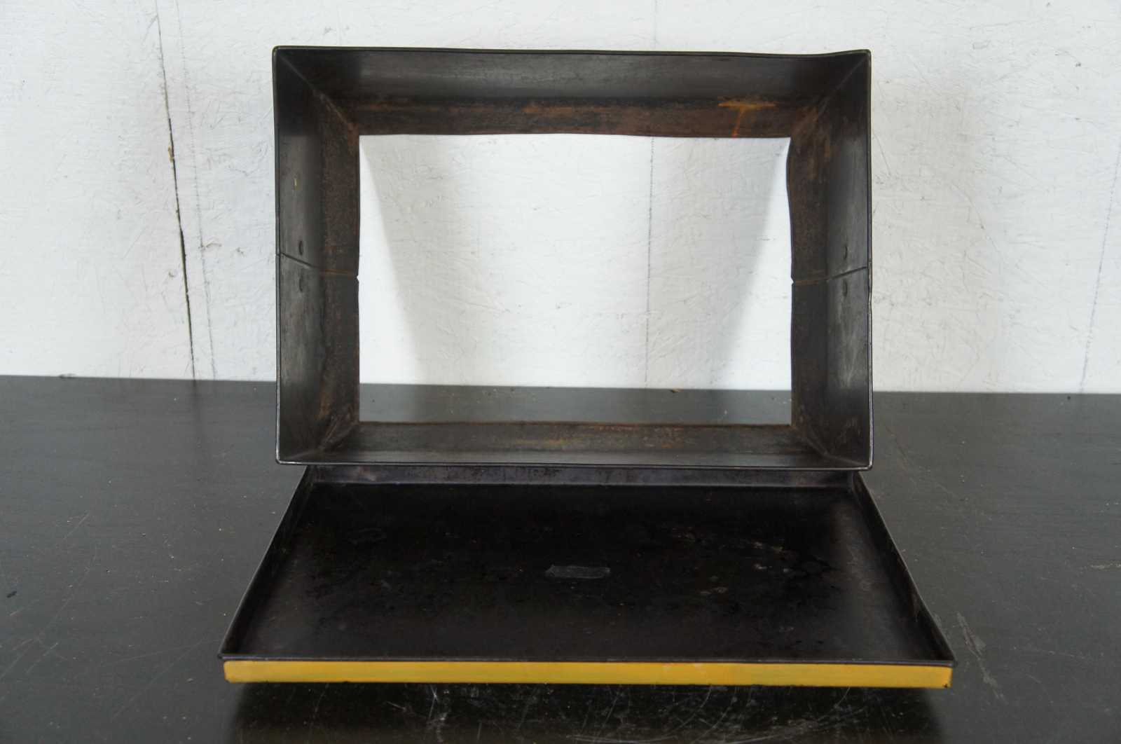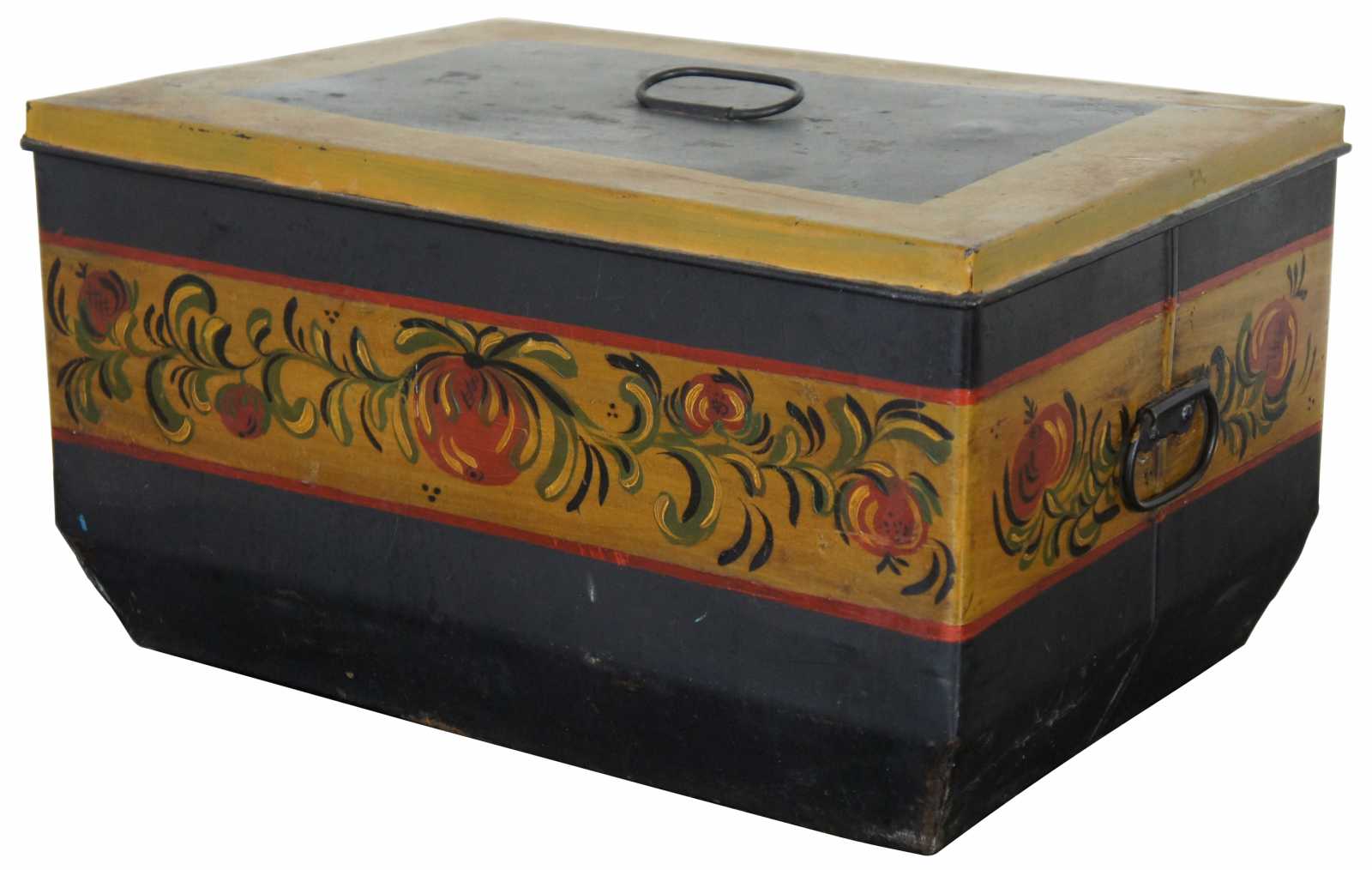 Antique painted toleware bread box by the Central Manufacturing Co, decorated with red tomatoes. The interior tray is removable and pierced with ventilation holes for airflow.