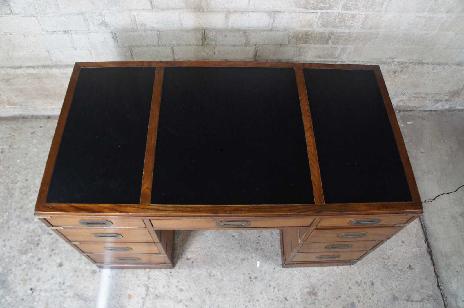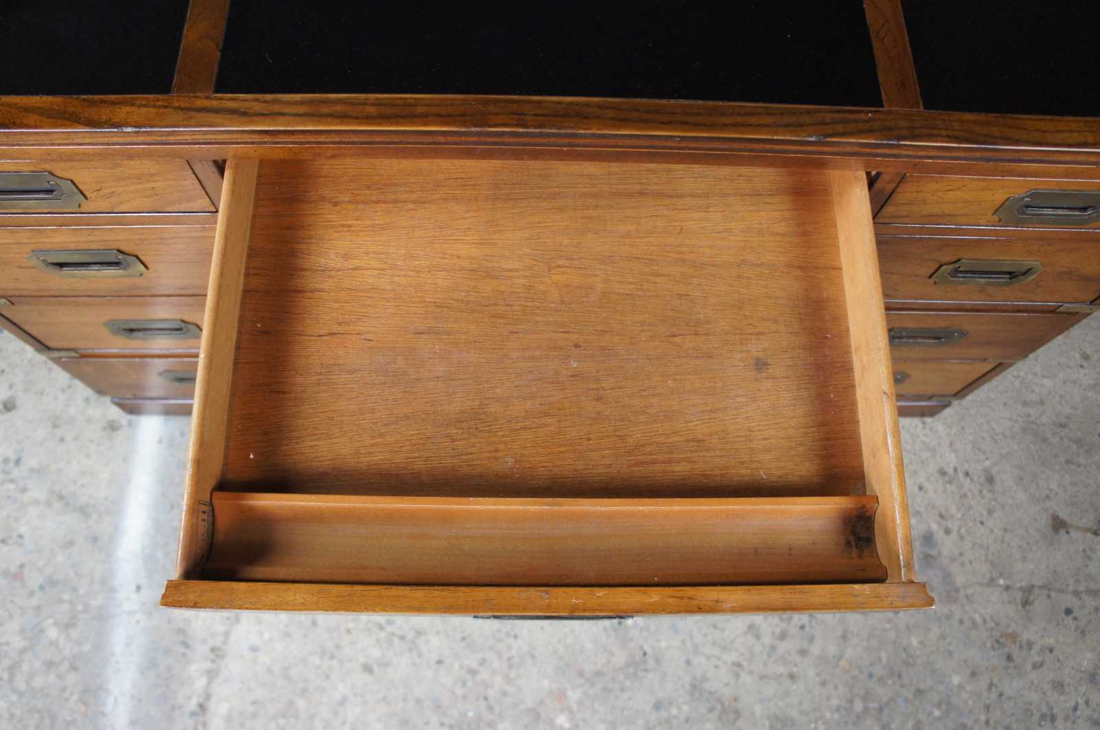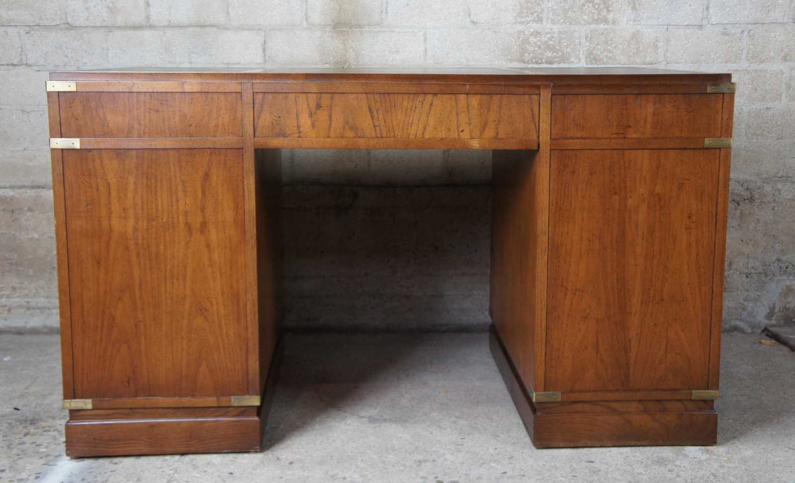 Sligh oak and leather top writing desk. Made in August of 1975. Features campaign styling with brass applied mounts and handles. Opens to seven standard drawers in addition to one file drawer.
