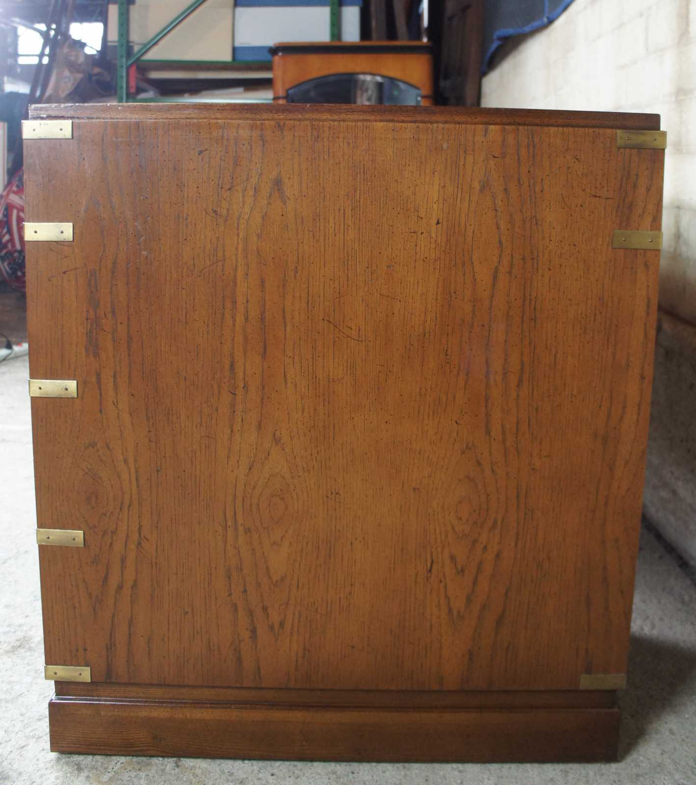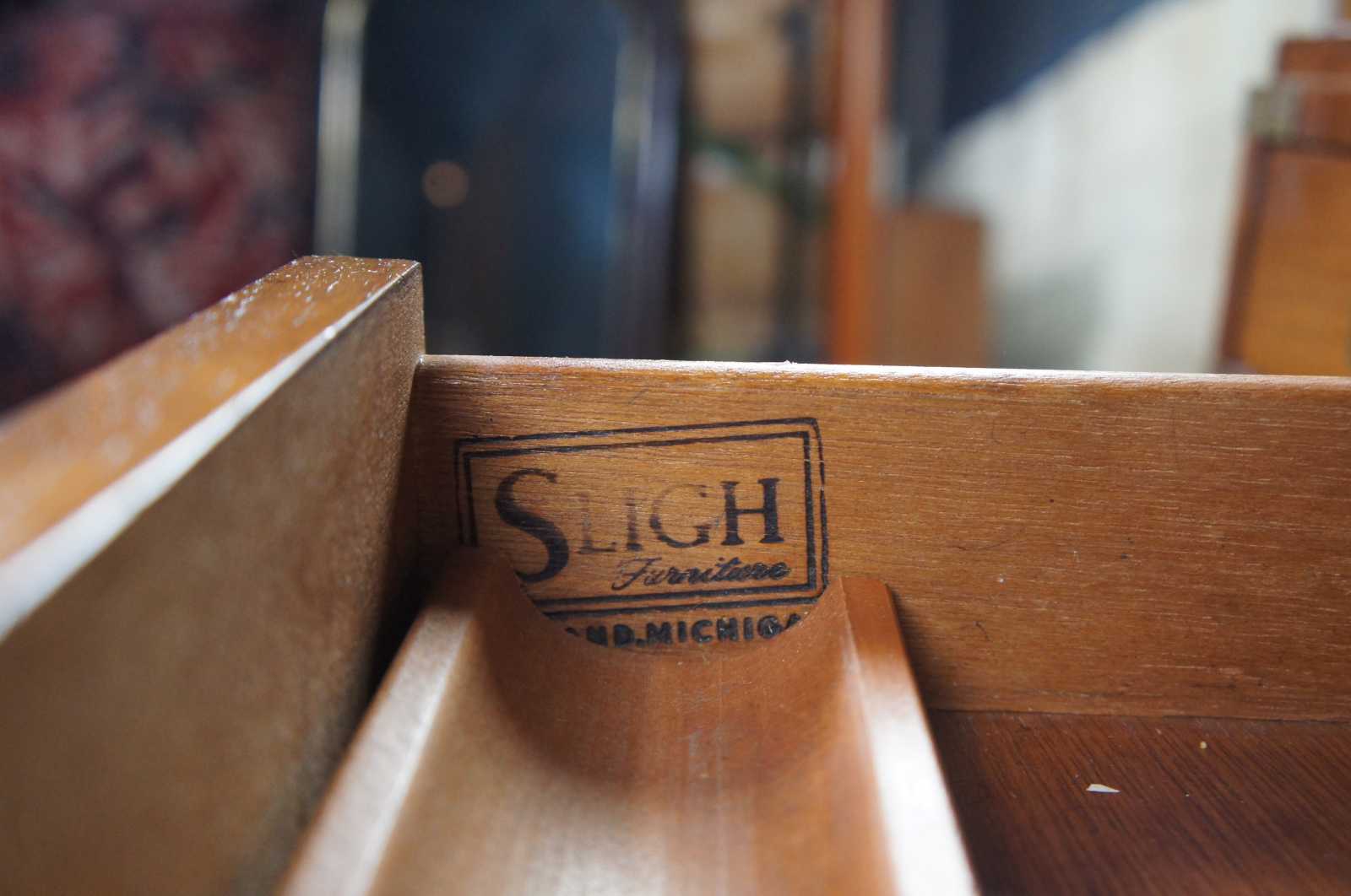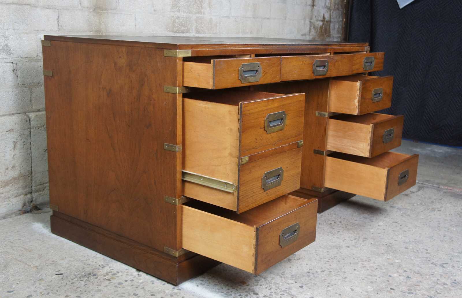 Sligh oak and leather top writing desk. Made in August of 1975. Features campaign styling with brass applied mounts and handles. Opens to seven standard drawers in addition to one file drawer.
