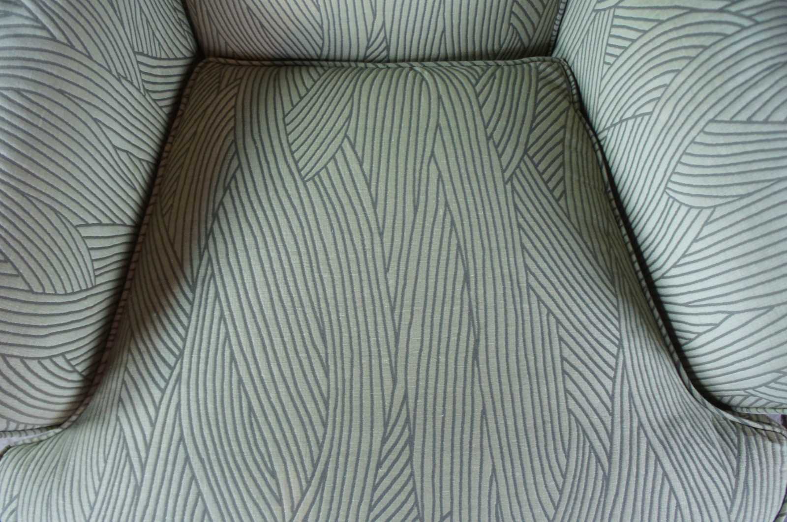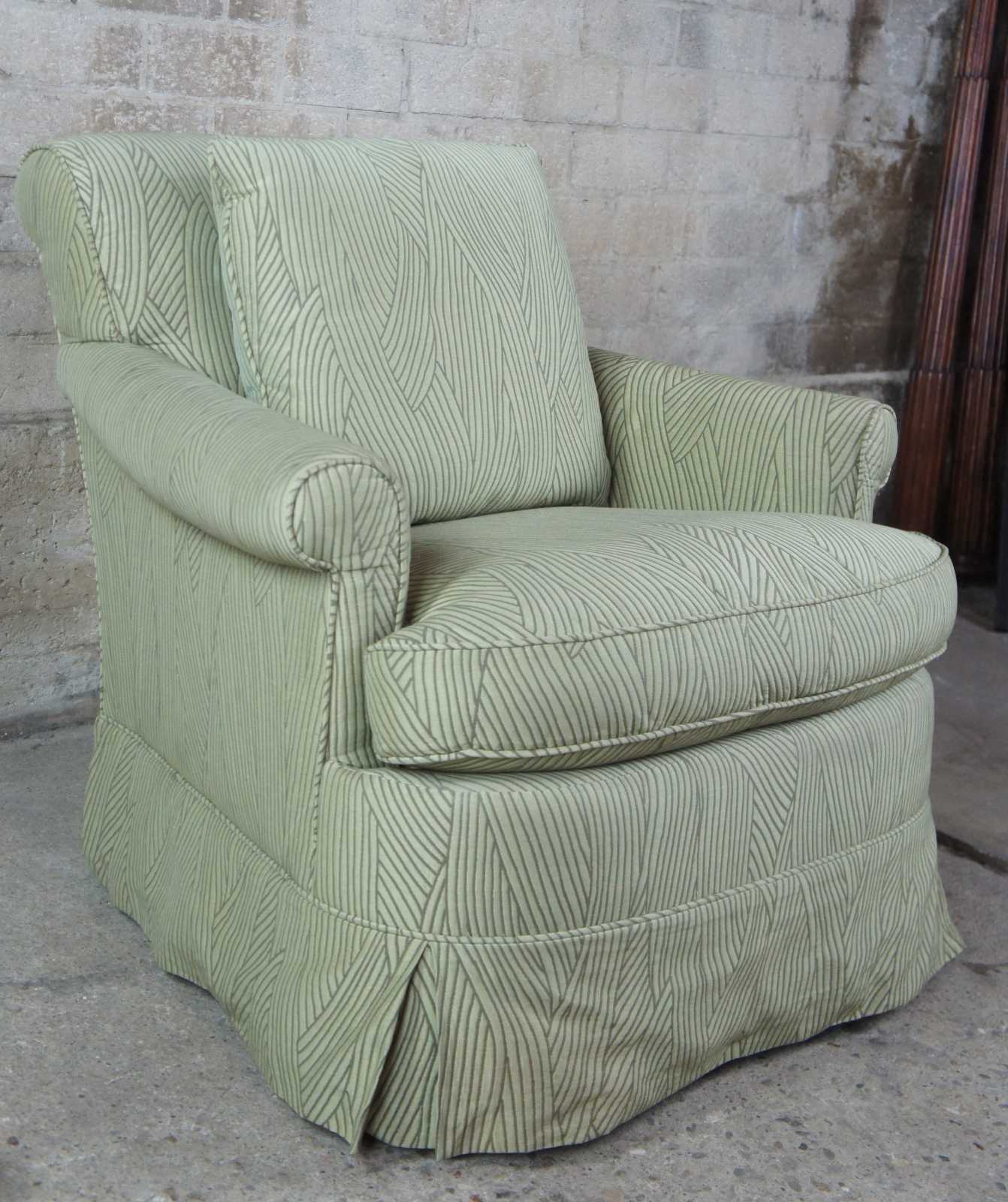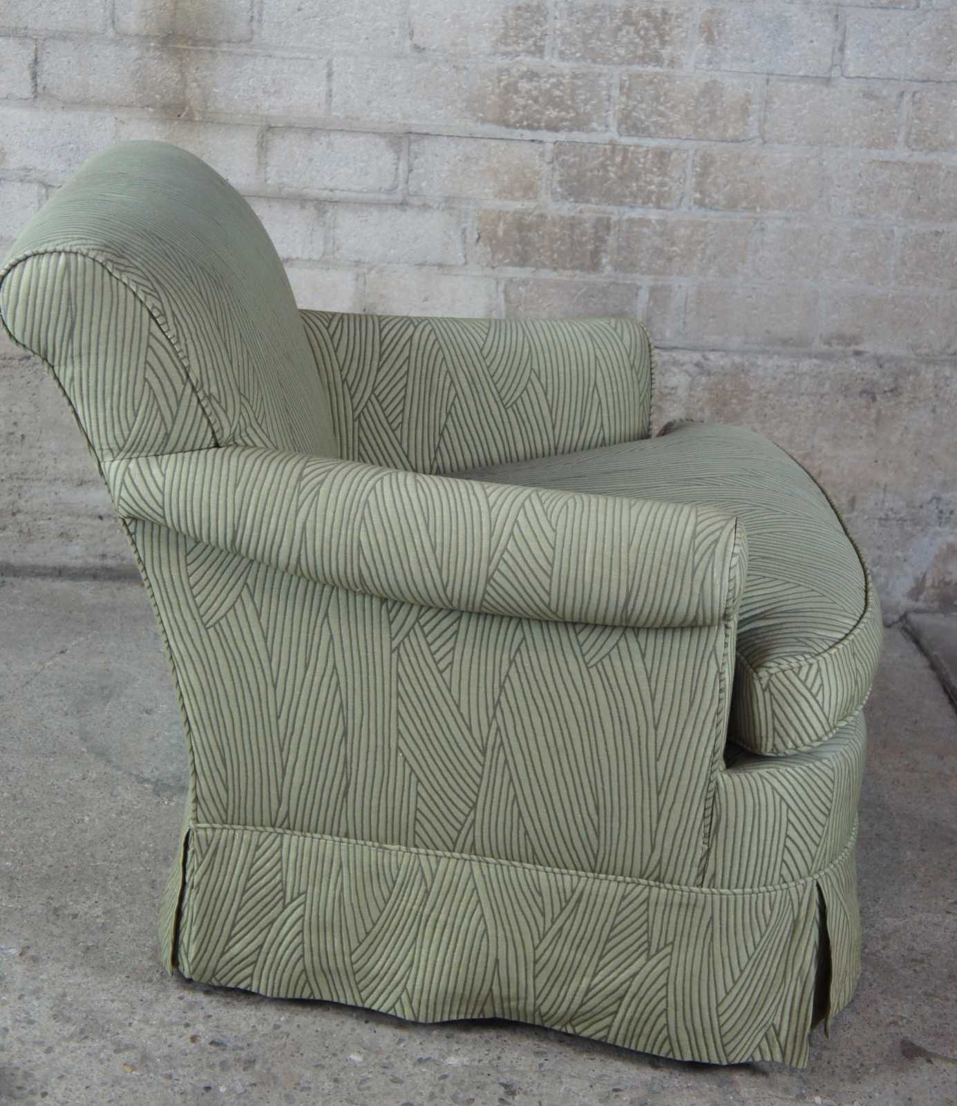 Pair of two Mason-Art 8908 Swivel lounge chairs. Featuring a geometric upholstery with earthy woven leaf like design, and rolled arms that lead to a skirted base. Swivels for comfort. Since 1913, Mason-Art has been making bench made, workroom quality, custom upholstery. Made in the USA in Pennsylvania factories by quality American craftsmen.