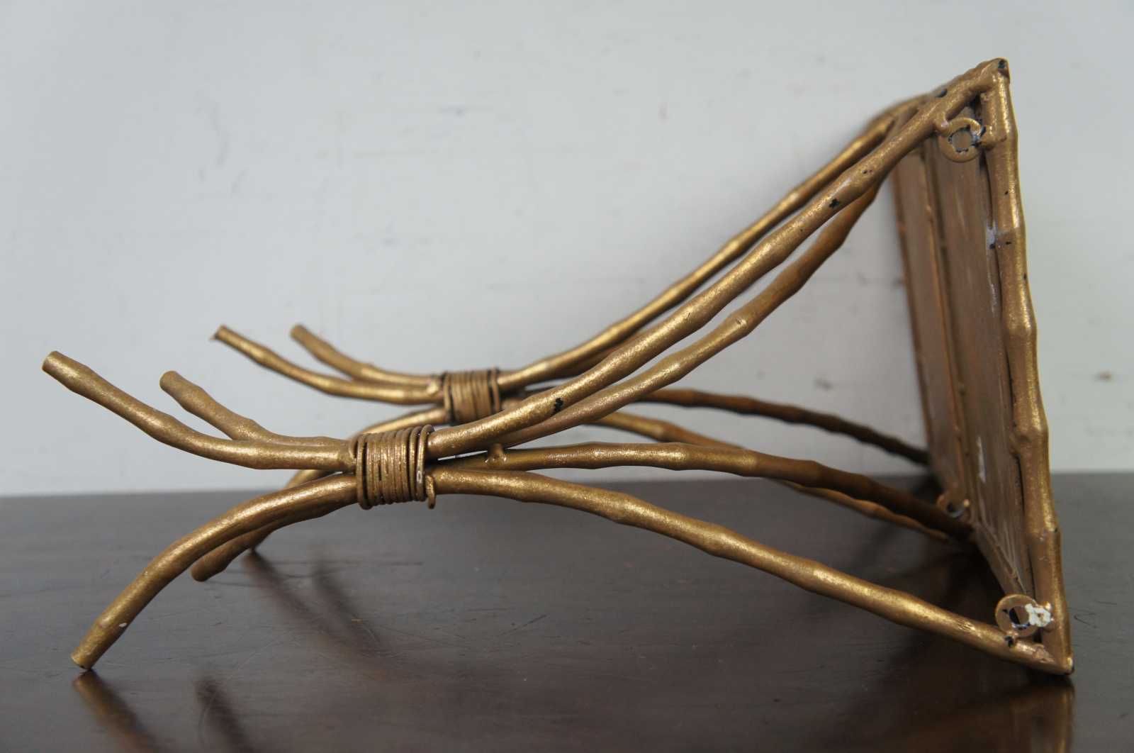 Two gold painted wall shelf sconces, molded to resemble bent bamboo with a mirrored top surface.