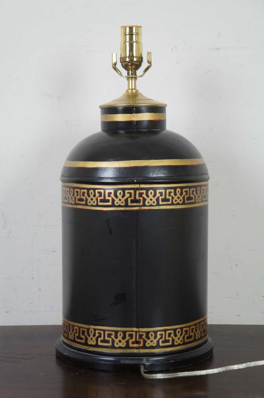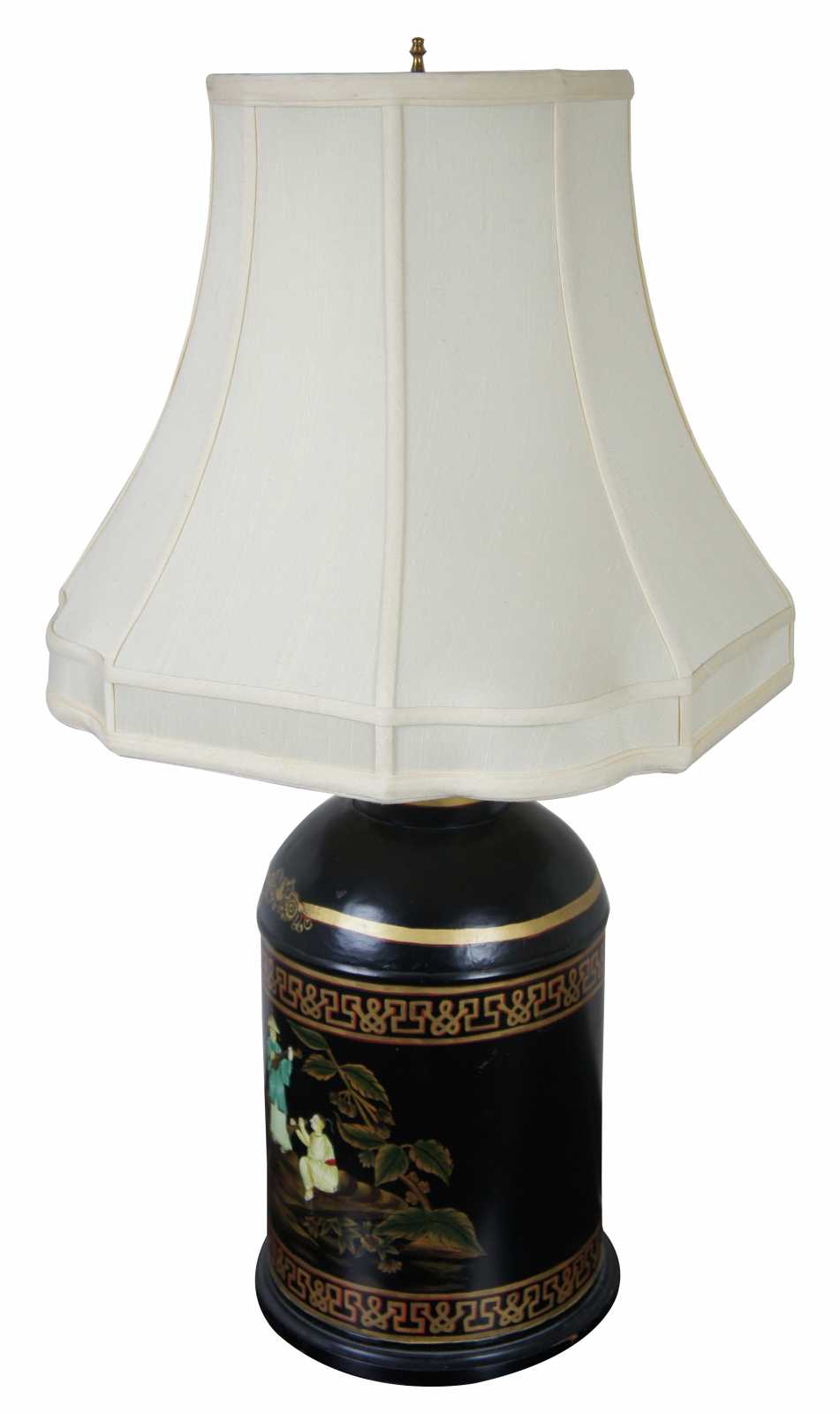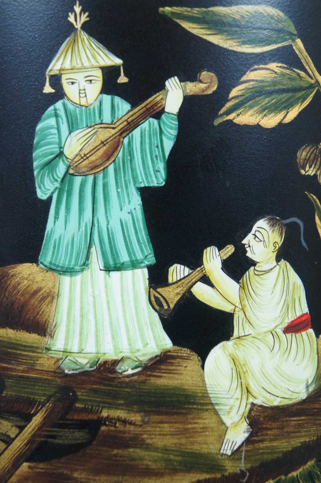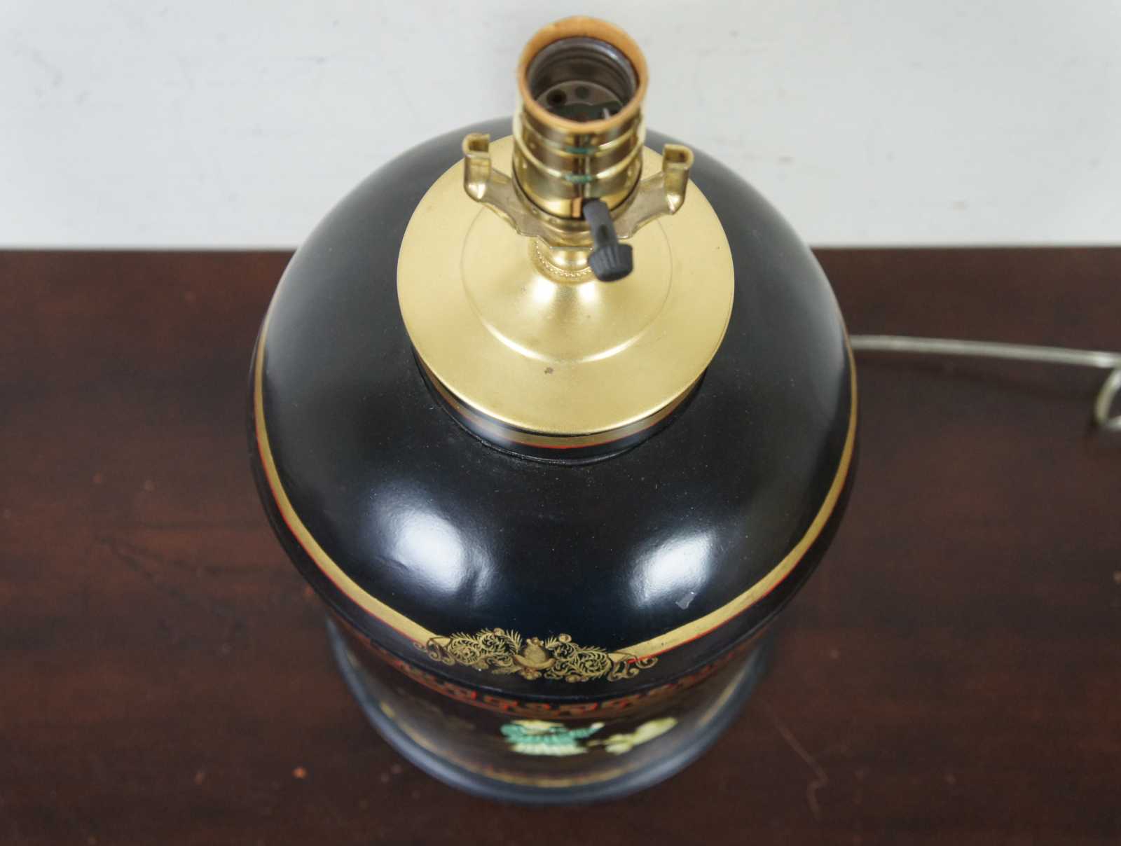 Vintage toleware tea canister lamp painted black and gold with an Asian scene with two figures playing instruments.