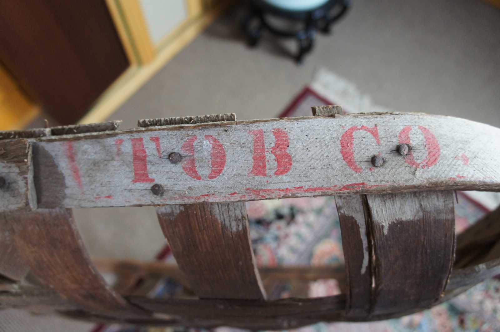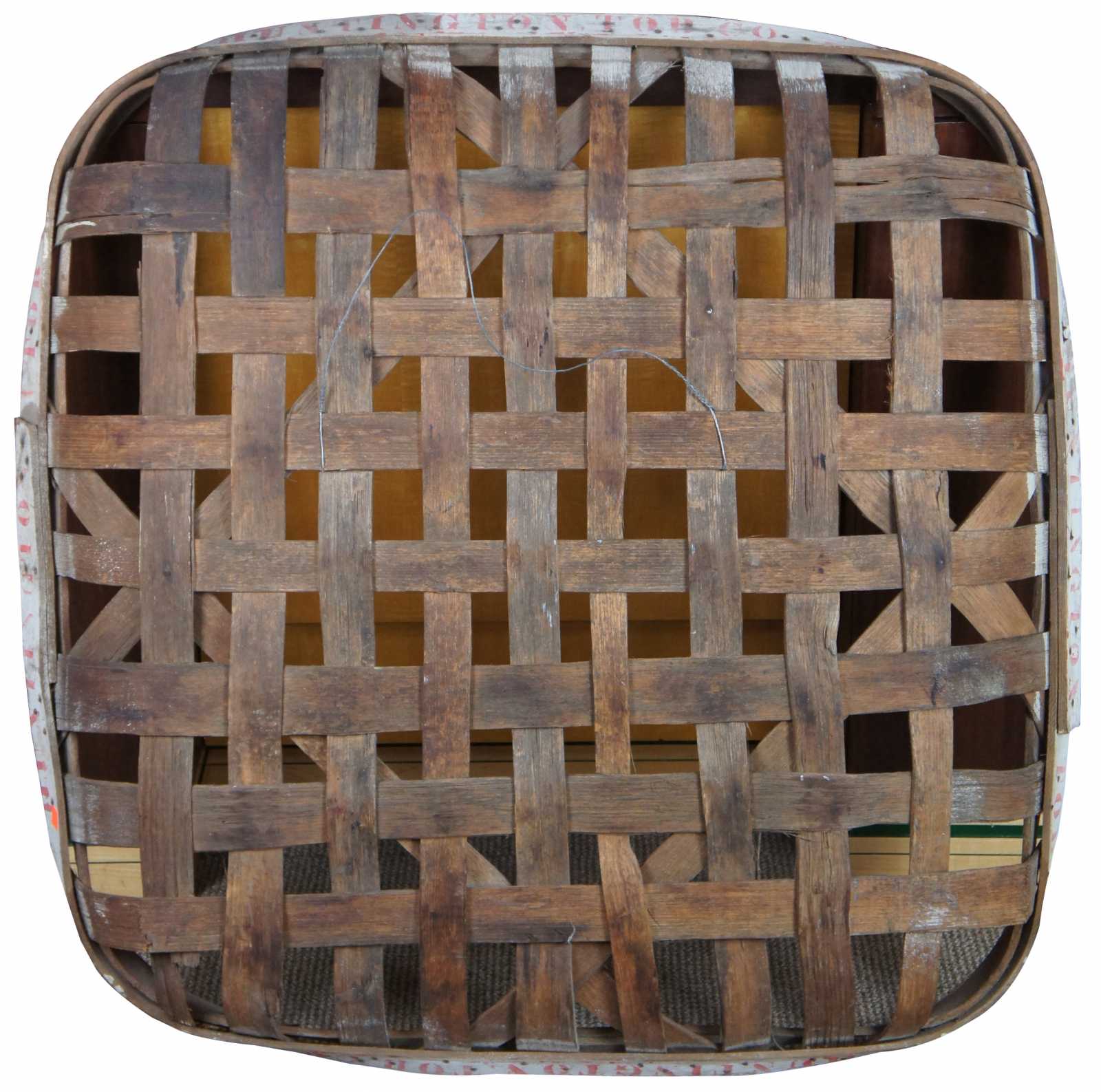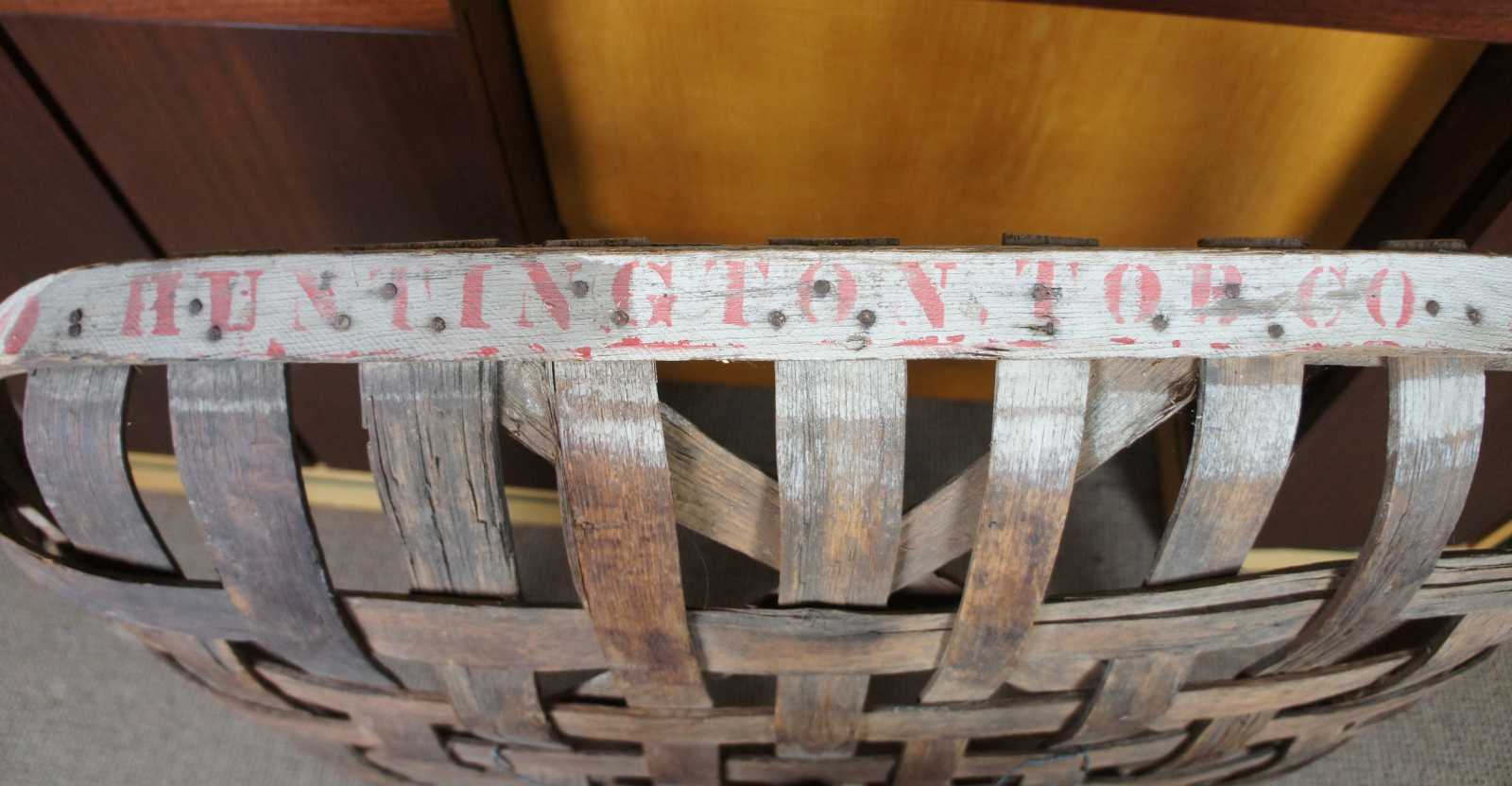 Antique Tobacco basket by/from Huntington Tobacco Company. Features a traditional square shape with woven wood supports and Huntington Tobacco Company writing/stamping along the edge.