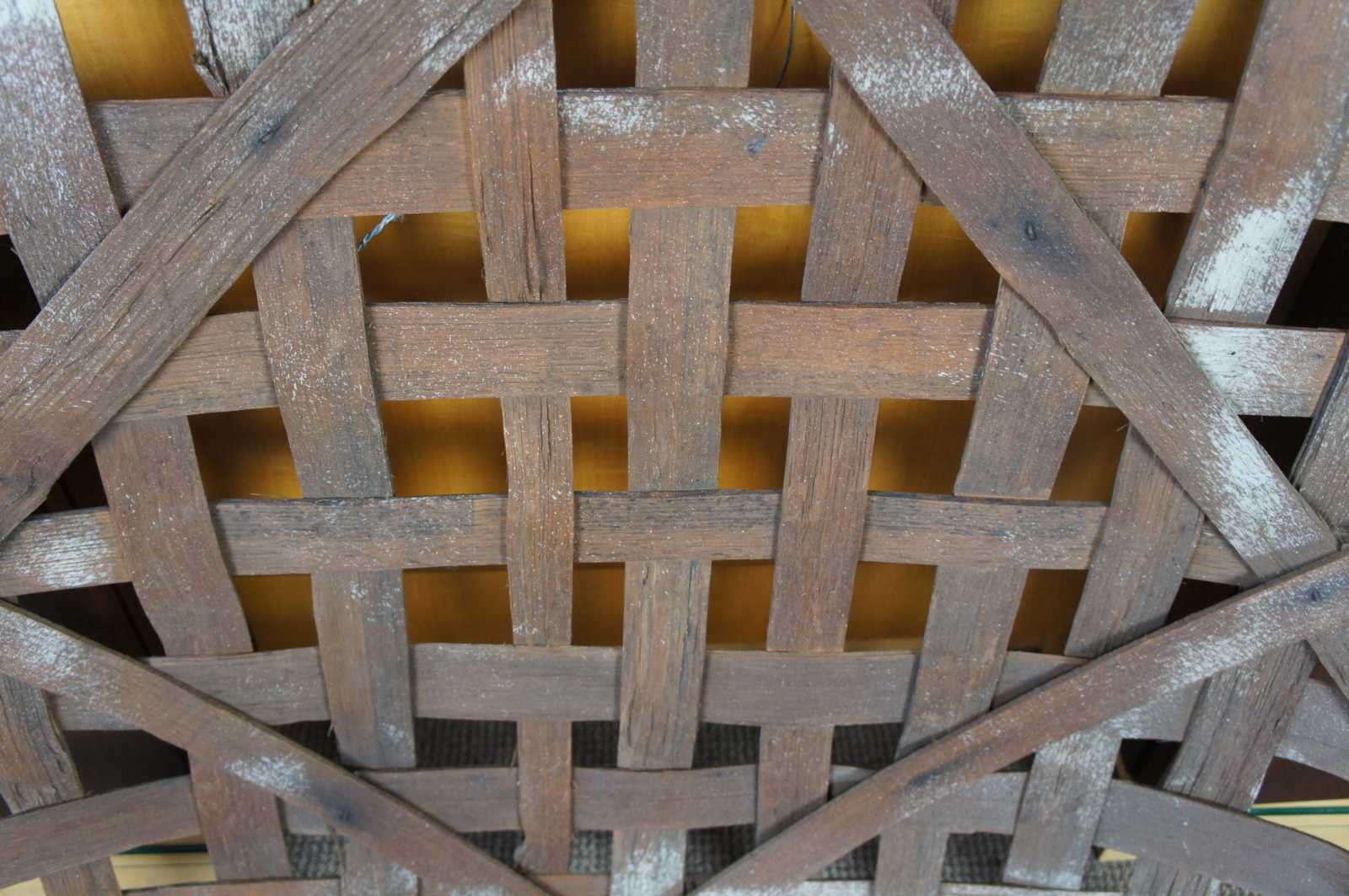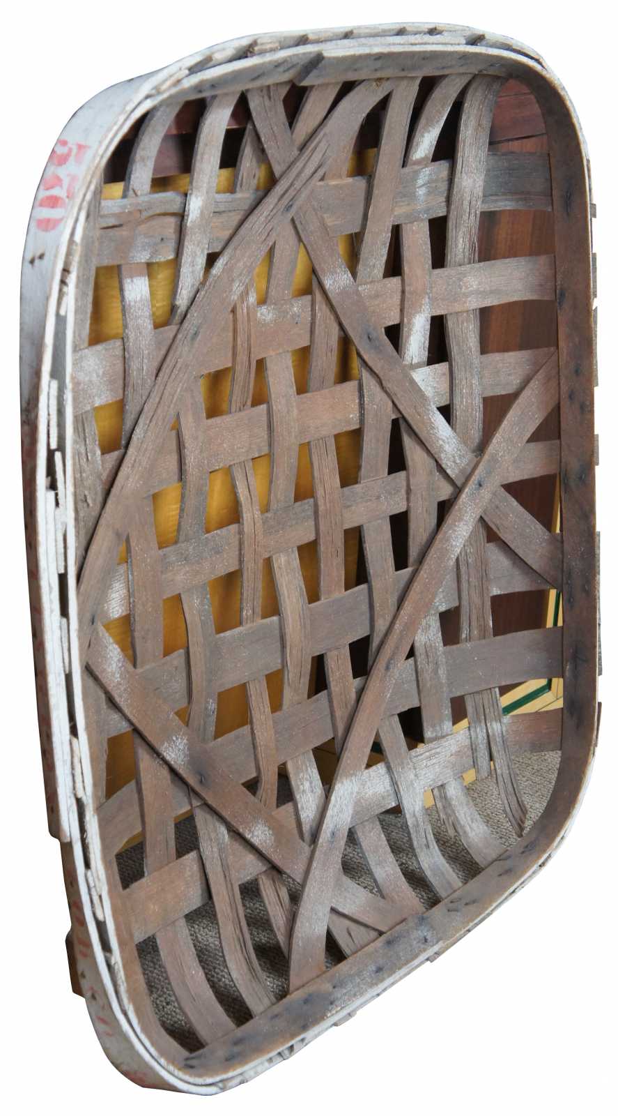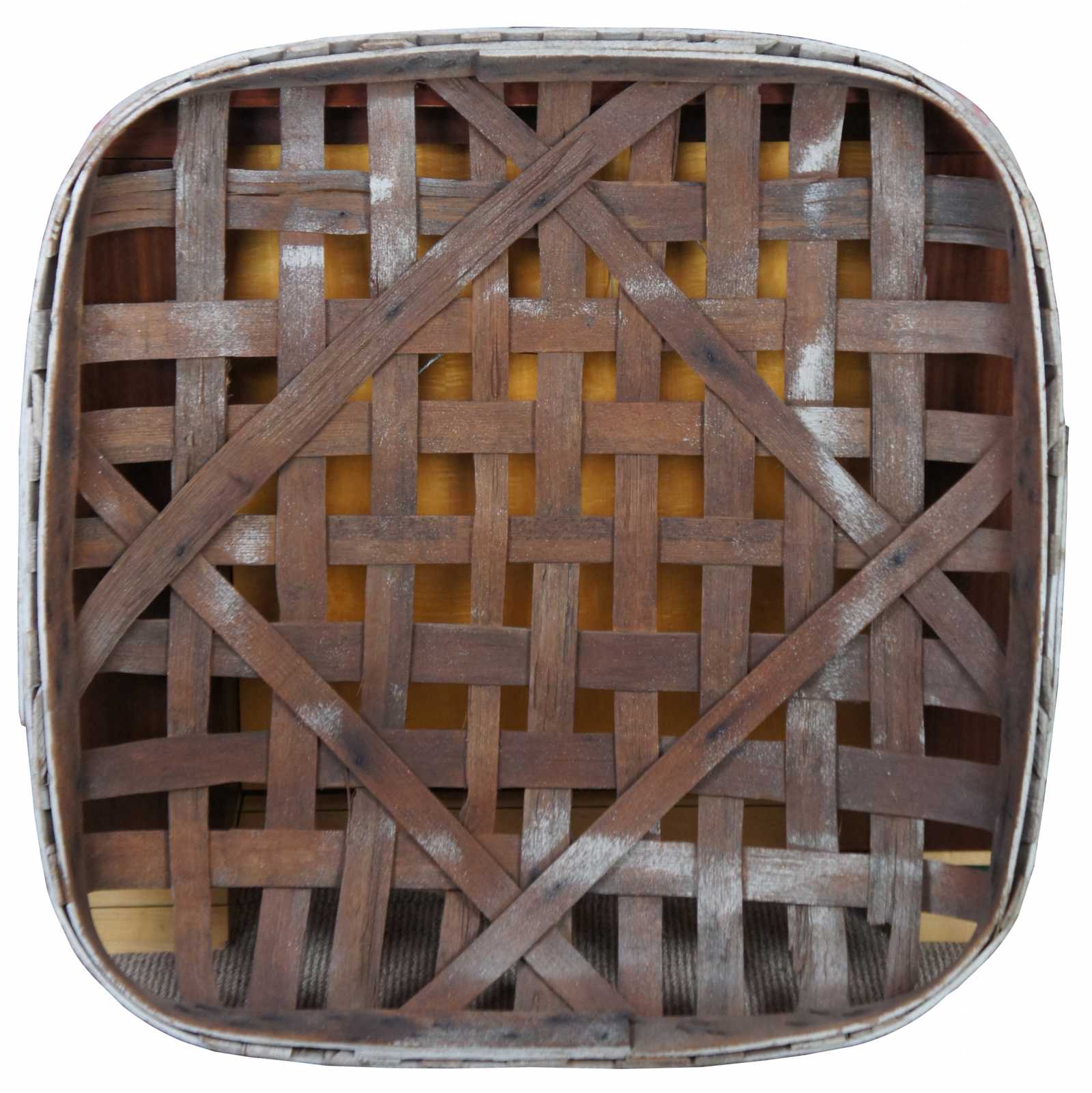 Antique Tobacco basket by/from Huntington Tobacco Company. Features a traditional square shape with woven wood supports and Huntington Tobacco Company writing/stamping along the edge.