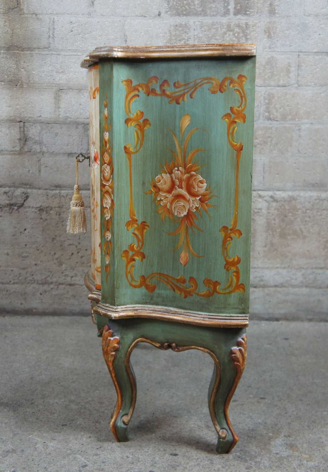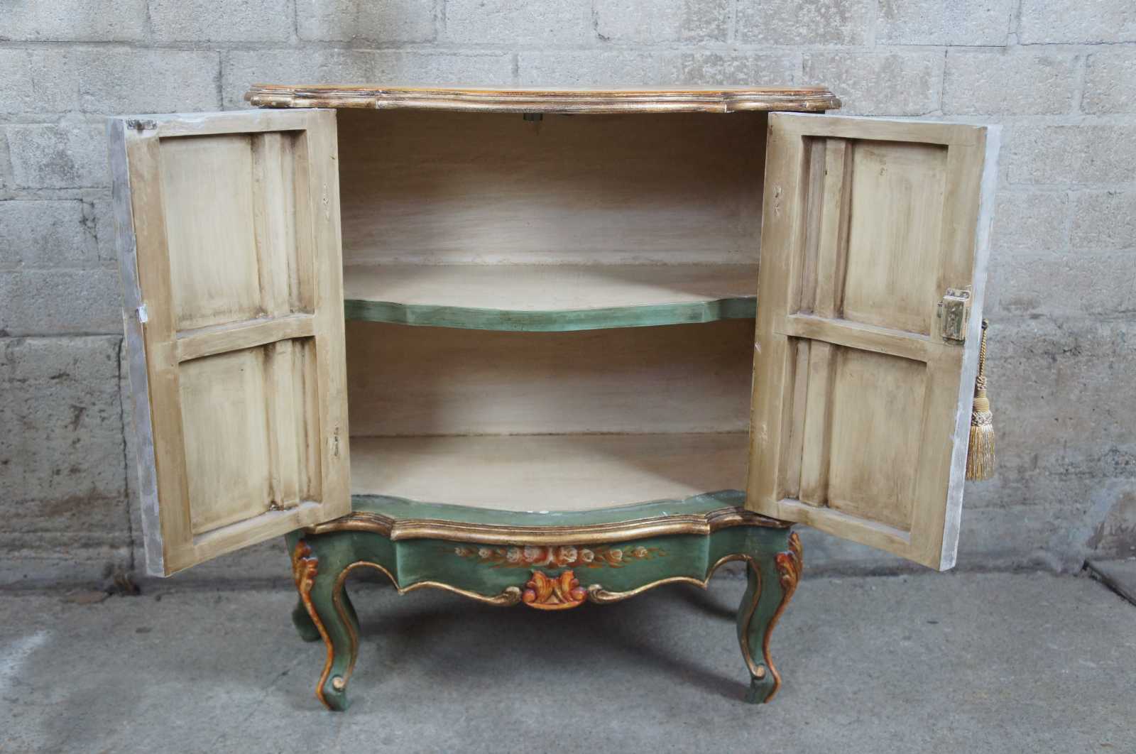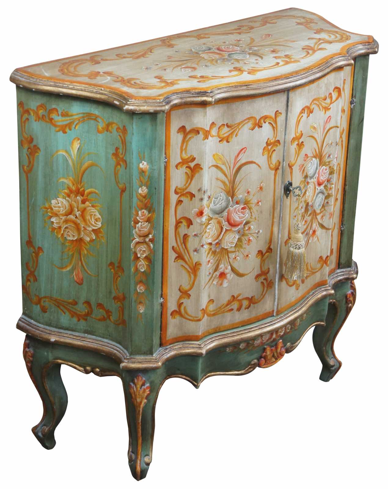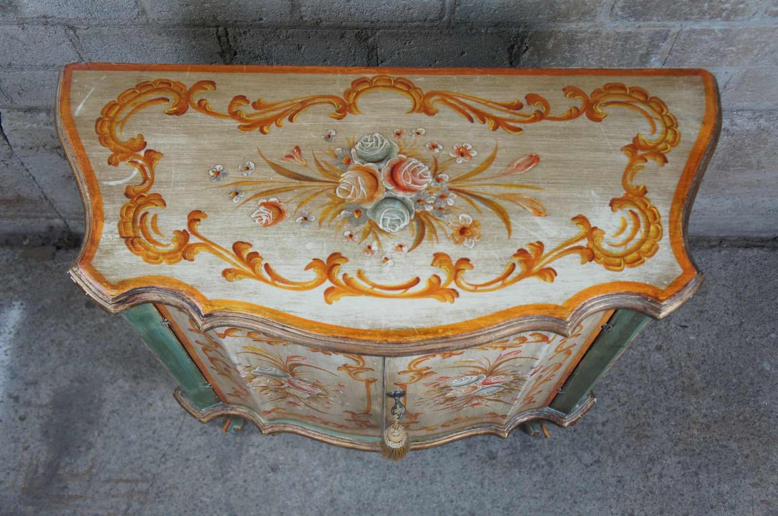 Late 20th century florentine entry cabinet or console table. Serpentine with hand panited designs and scalloped accents. Includes lock and key.