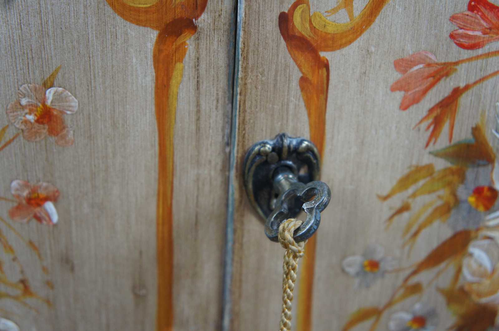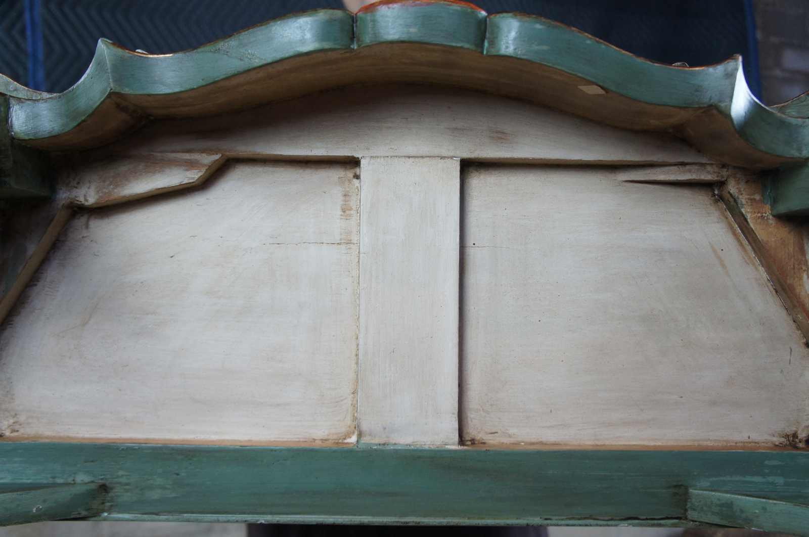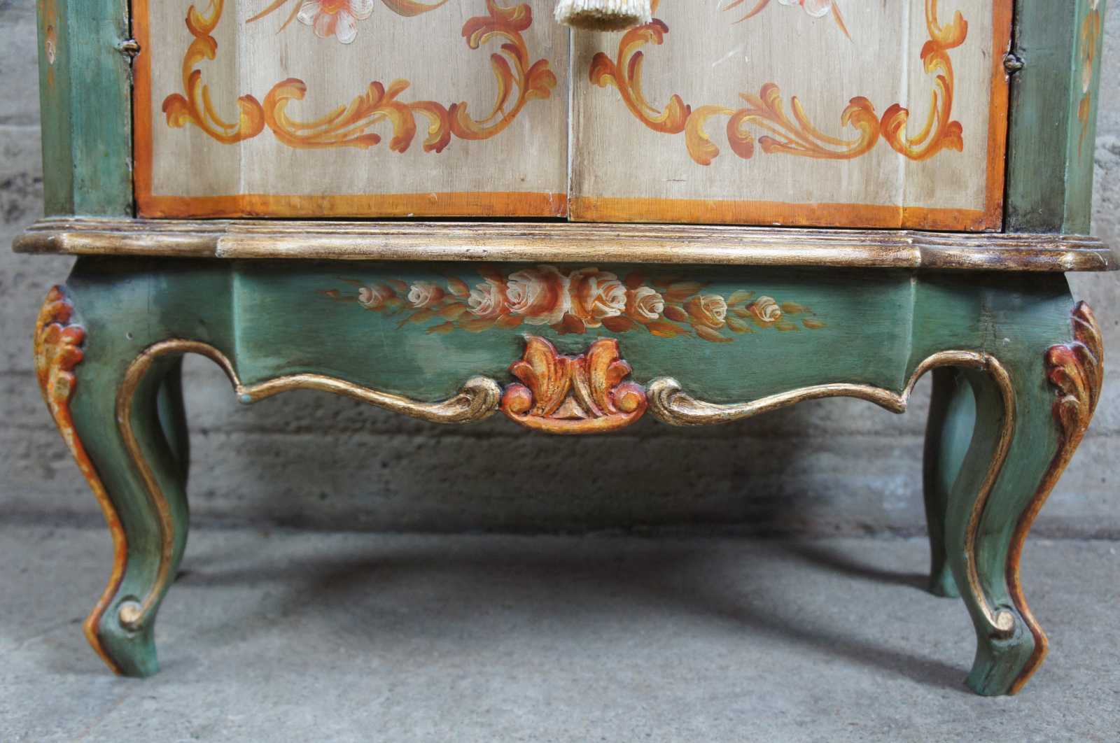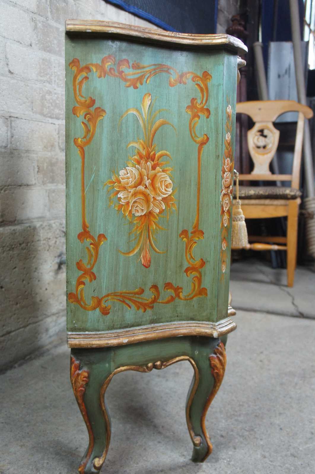 Late 20th century florentine entry cabinet or console table. Serpentine with hand panited designs and scalloped accents. Includes lock and key.
