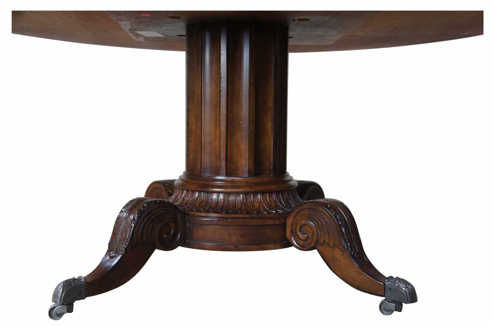 Century Furniture Classics Collection Norfolk Maple Dining Table. The round top surface features a cross banded pattern of maple and burled veneers. The fluted column base terminates into four cabriole legs with stippled zinc finish casters. 53-307T.