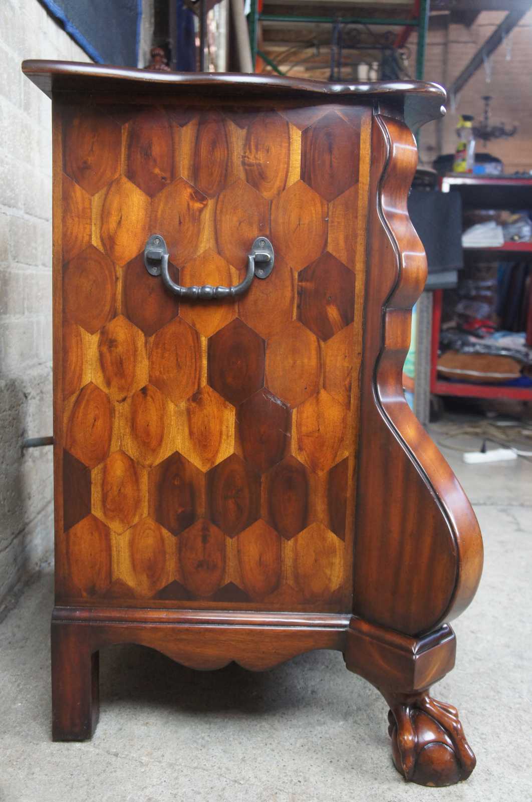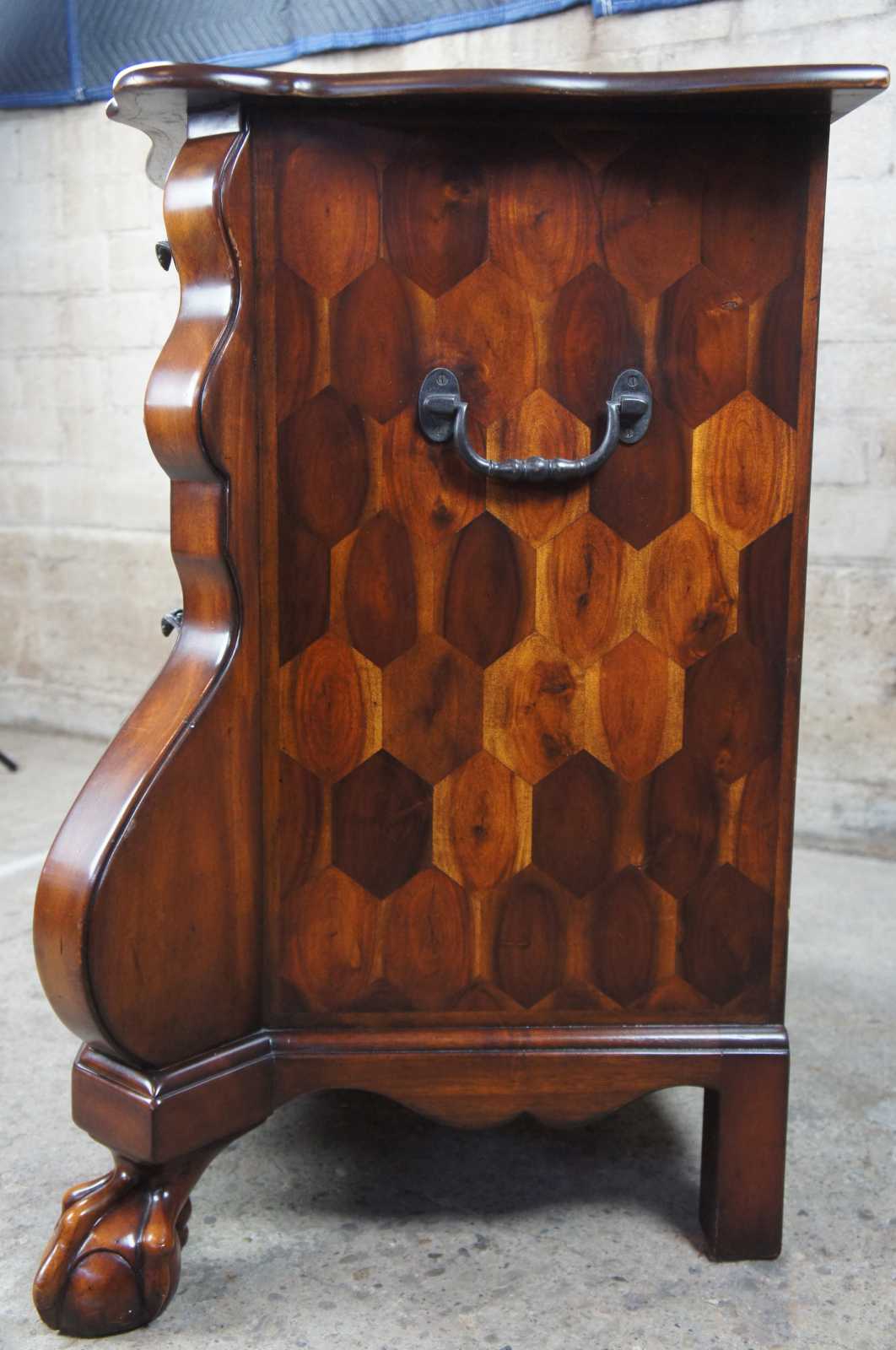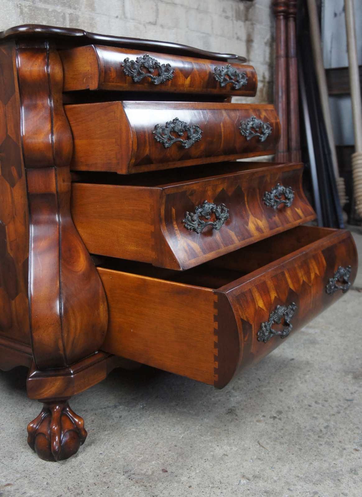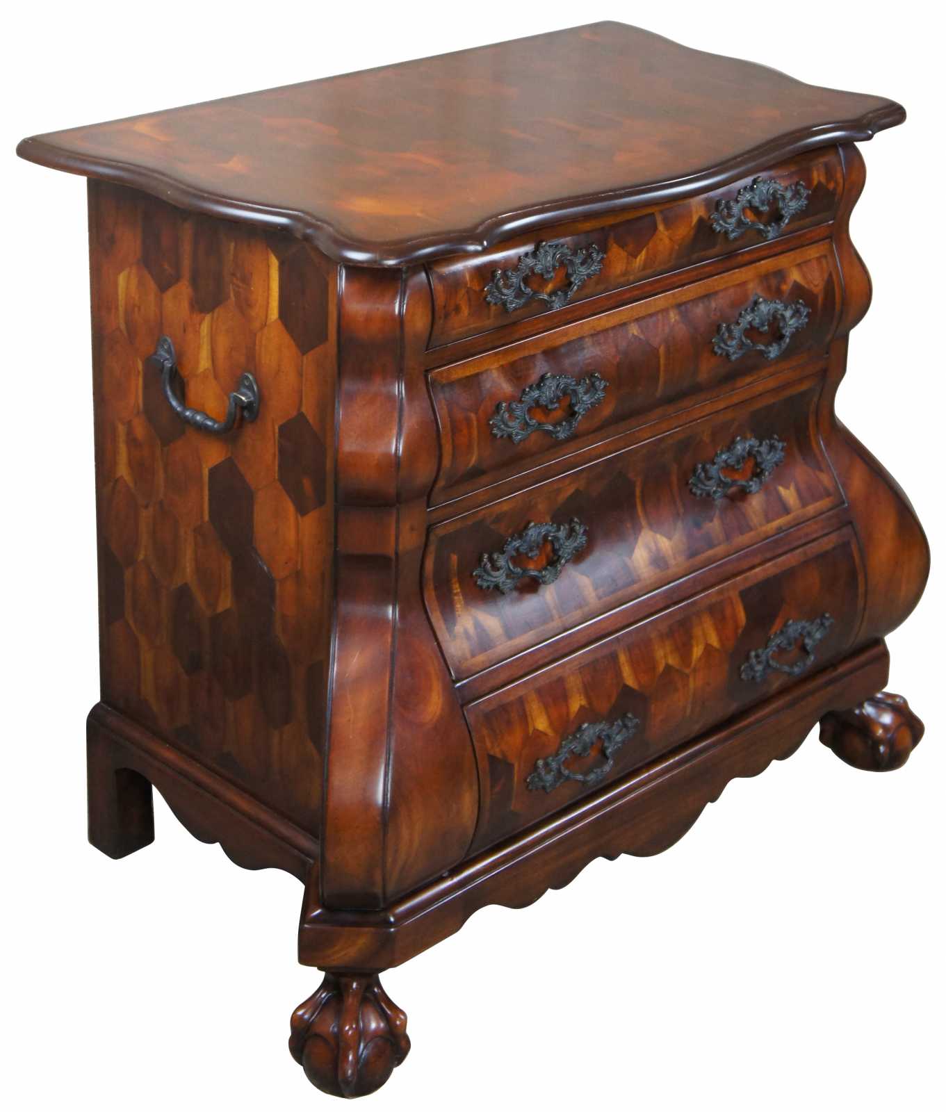 Theodore Alexander Dutch Bombe chest. Influenced by a combination of 18th century Dutch and Chippendale styling. Features a serpentine design made from mahognay with four drawers, ornate hardware, ball and claw feet and geometric parquetry finish. A great piece for any entry.