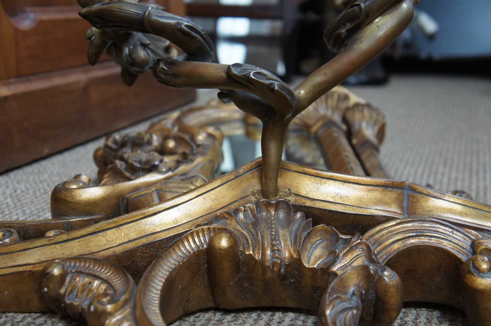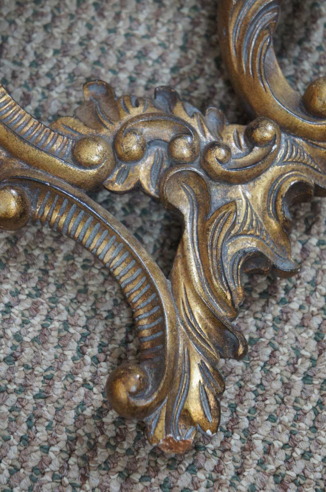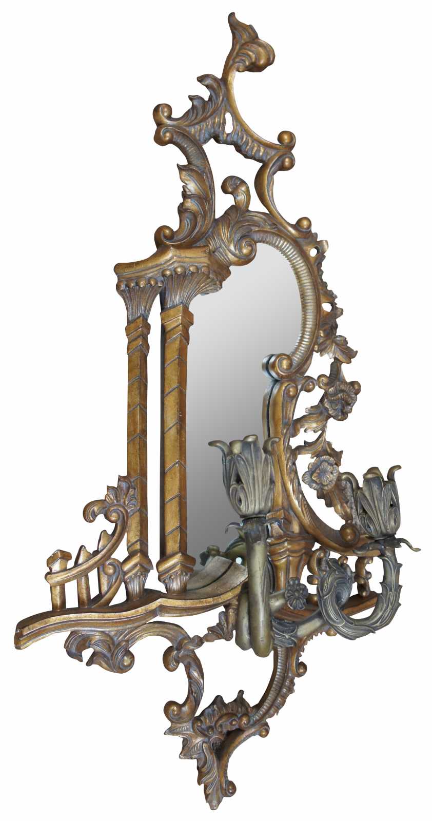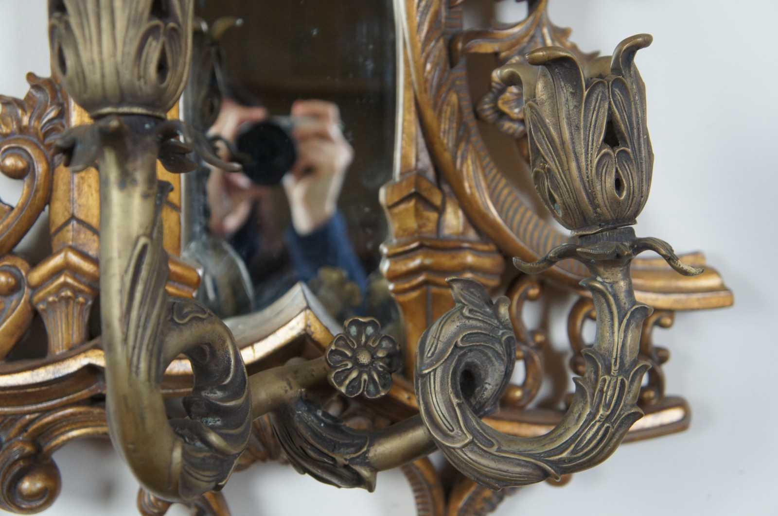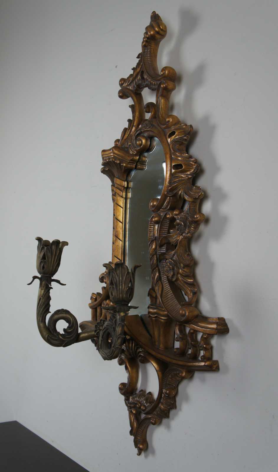 Ornate pair of Baroque or Rococo style gold wall mirrors with two brass floral candle holders by Maitland Smith. Made in Indonesia, Product Info - 1648-013, 3S05148-0010, 439G-MSI.
