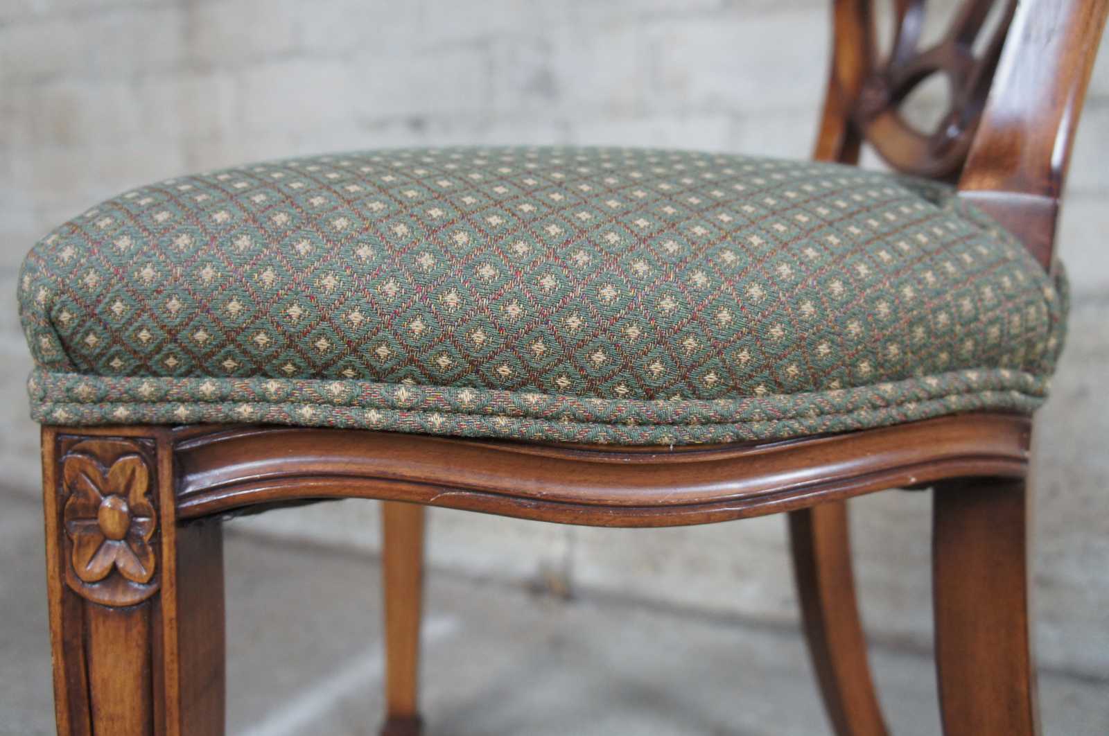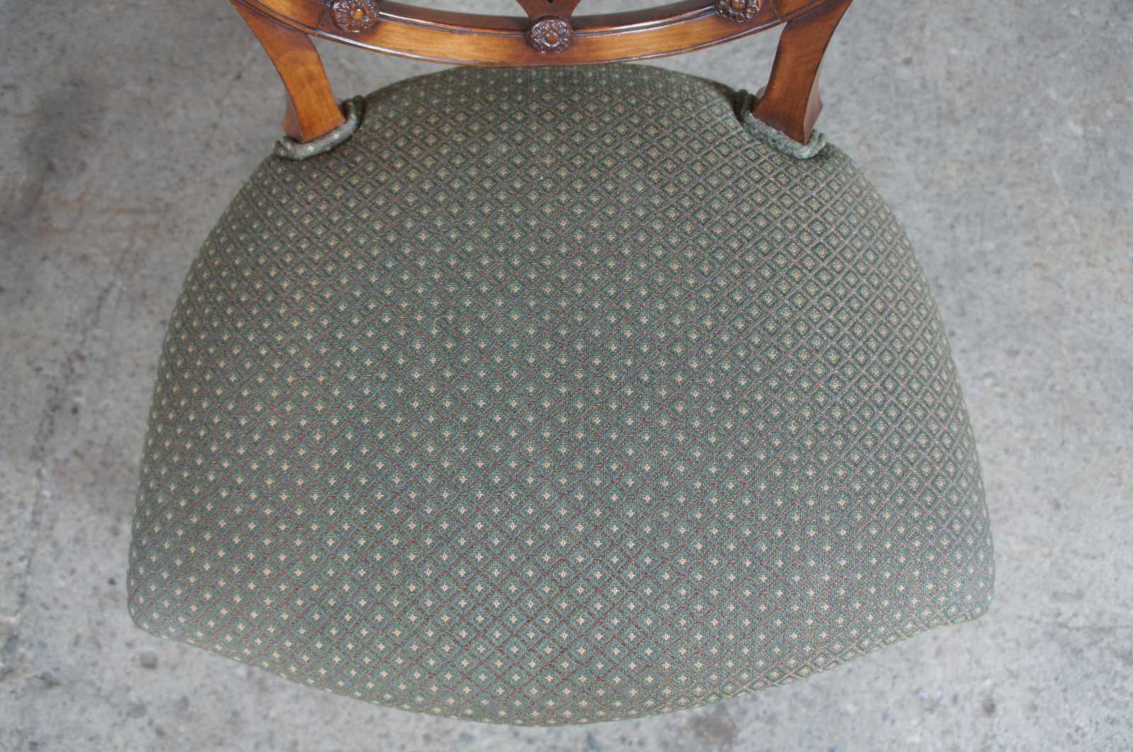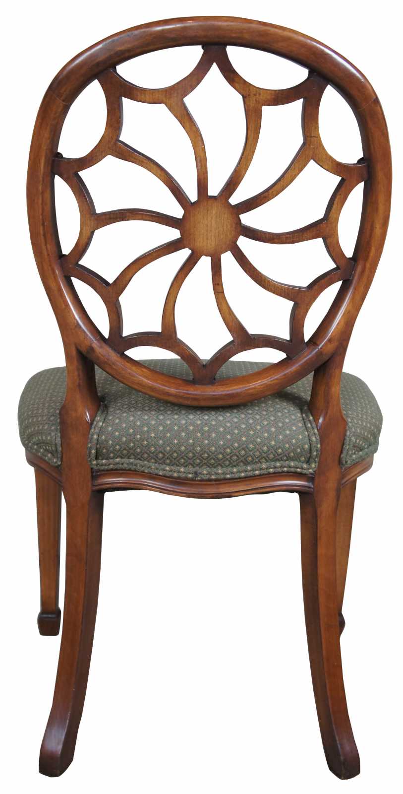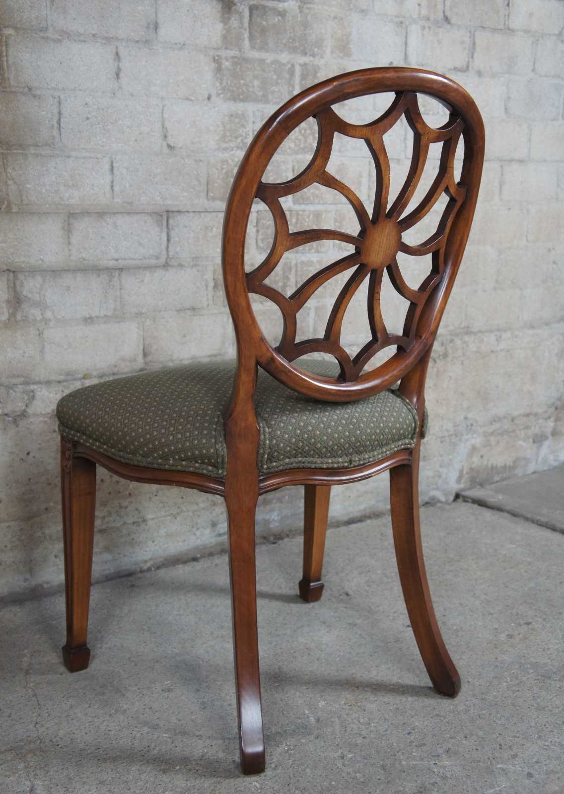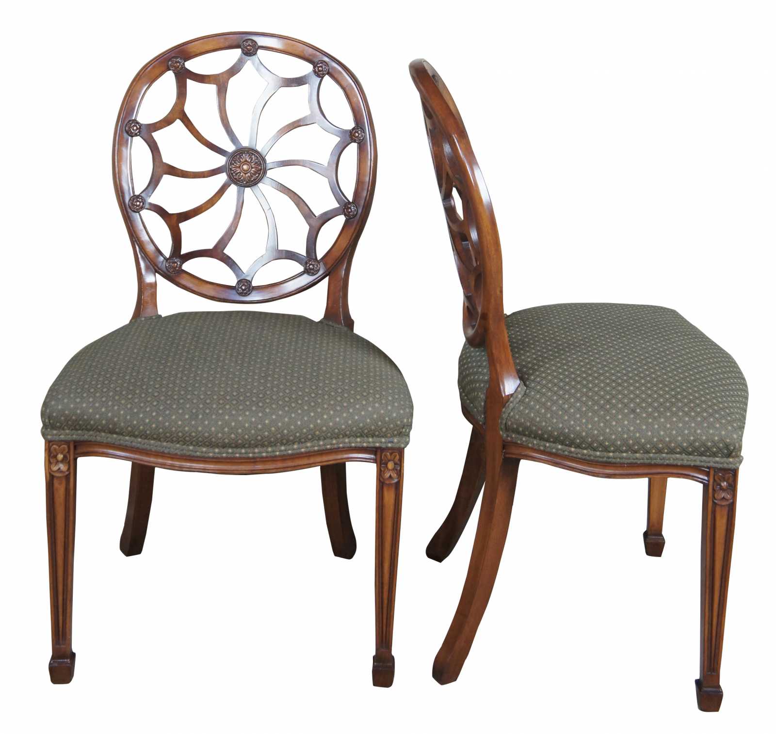 Four late 20th century wheel back dining chairs. Features a balloon shaped back with spidered splat leading to a green seat over a serpentine apron and square tapered legs leading to spade feet.
