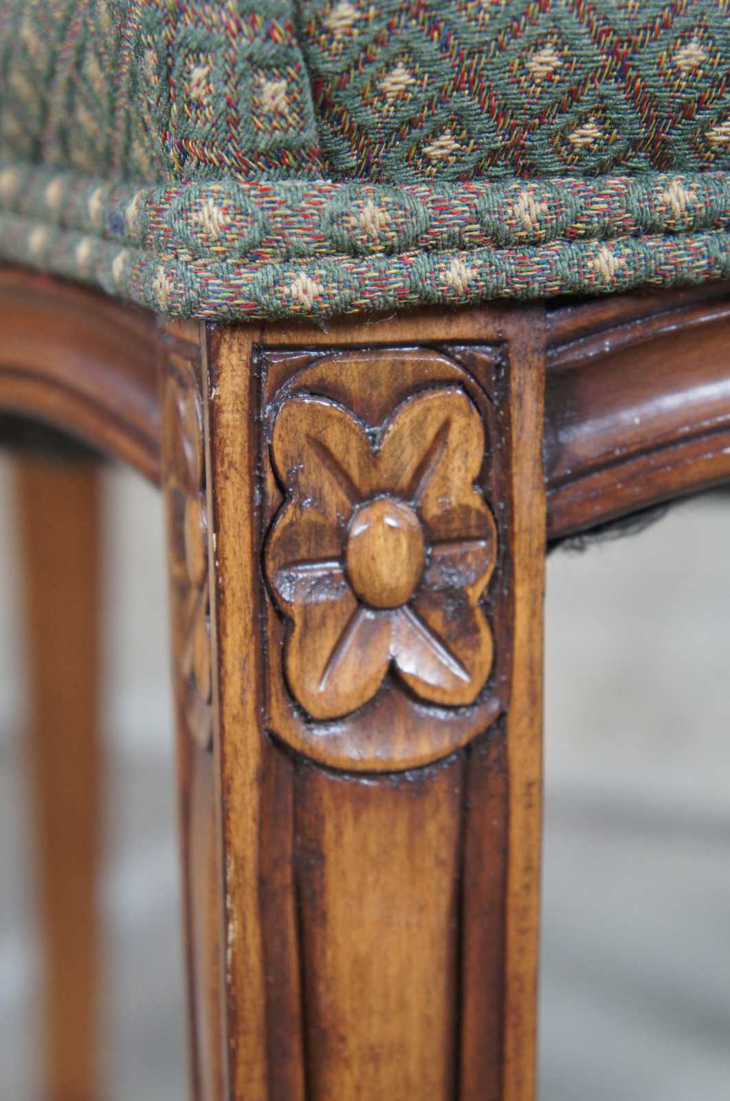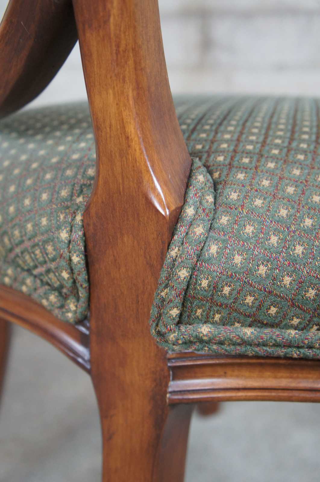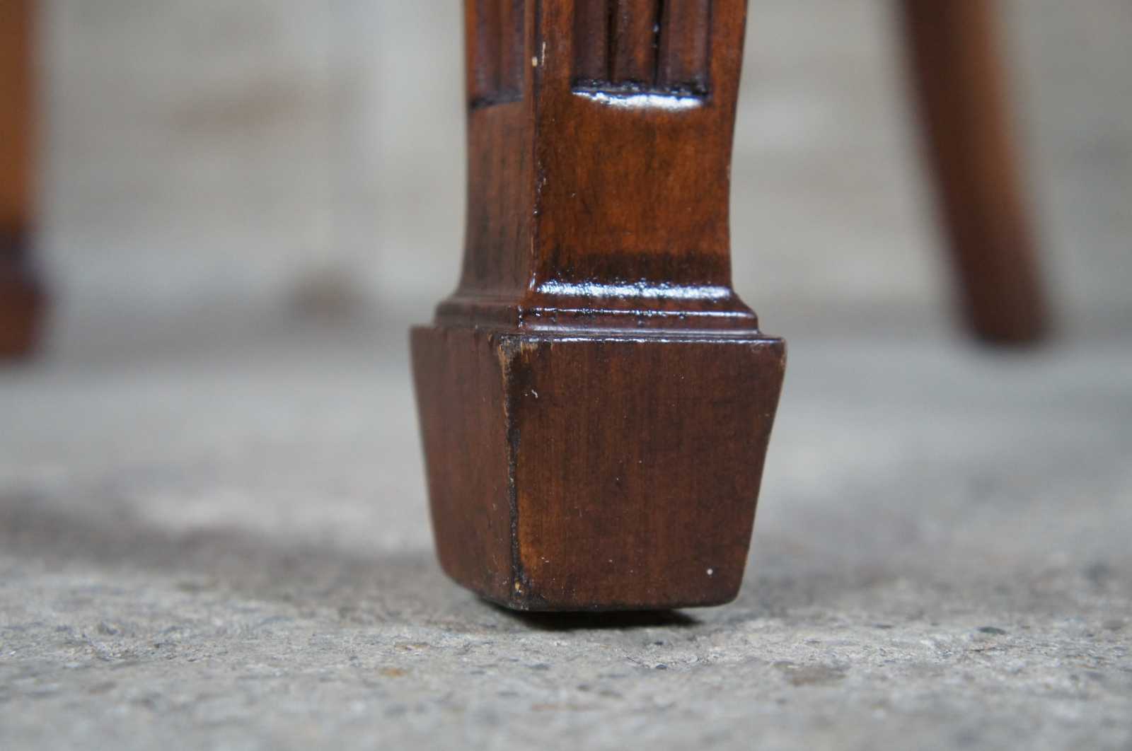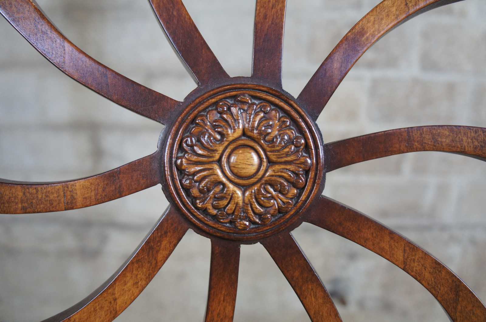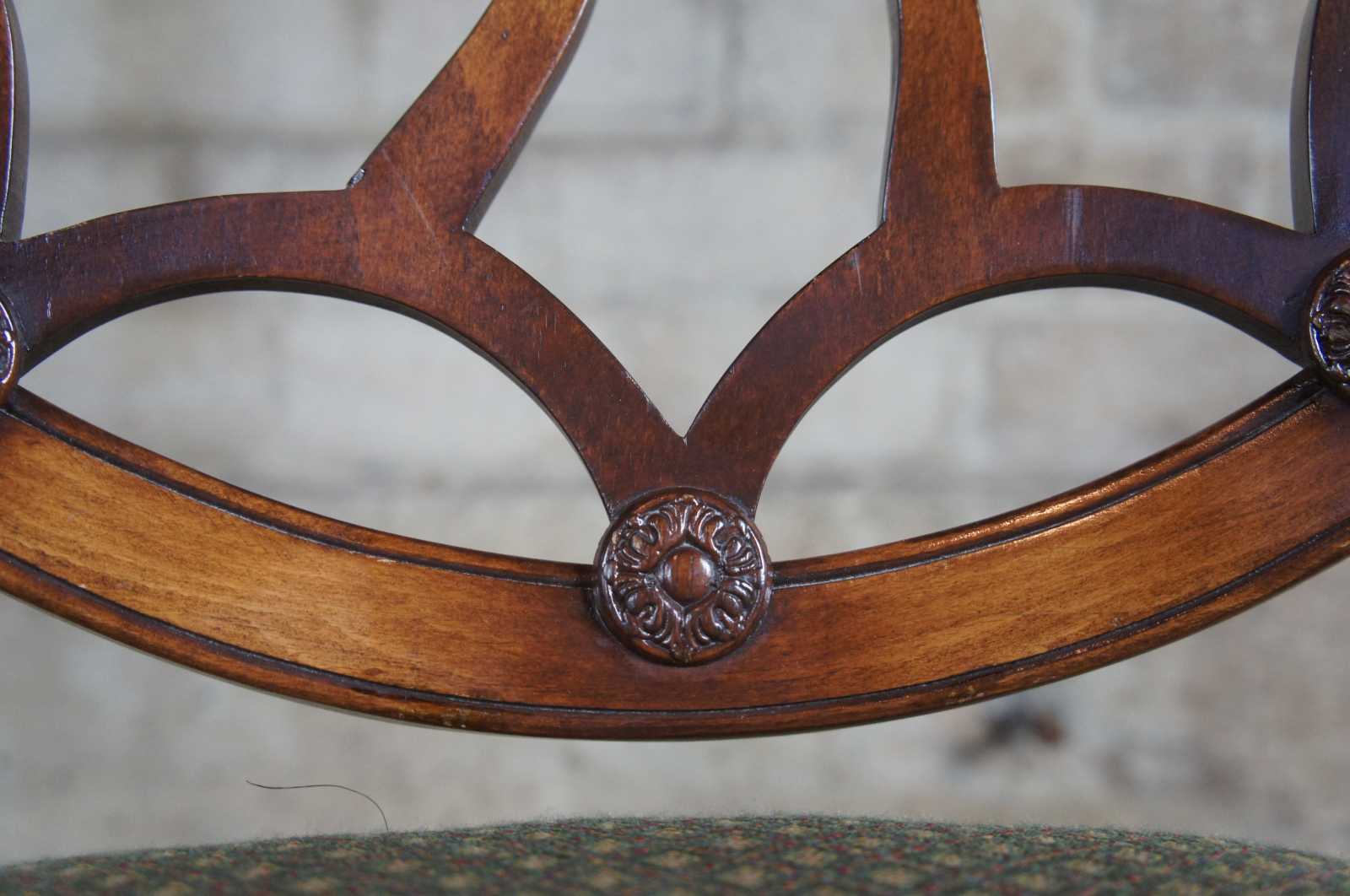 Four late 20th century wheel back dining chairs. Features a balloon shaped back with spidered splat leading to a green seat over a serpentine apron and square tapered legs leading to spade feet.
