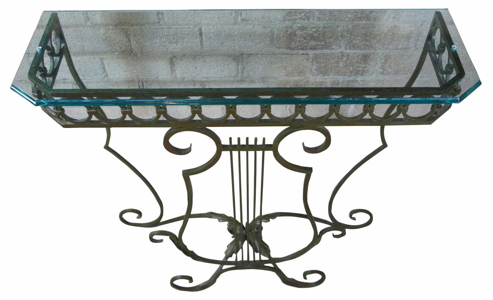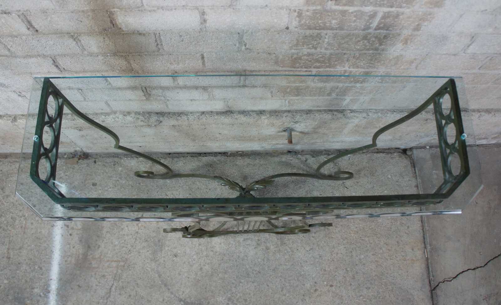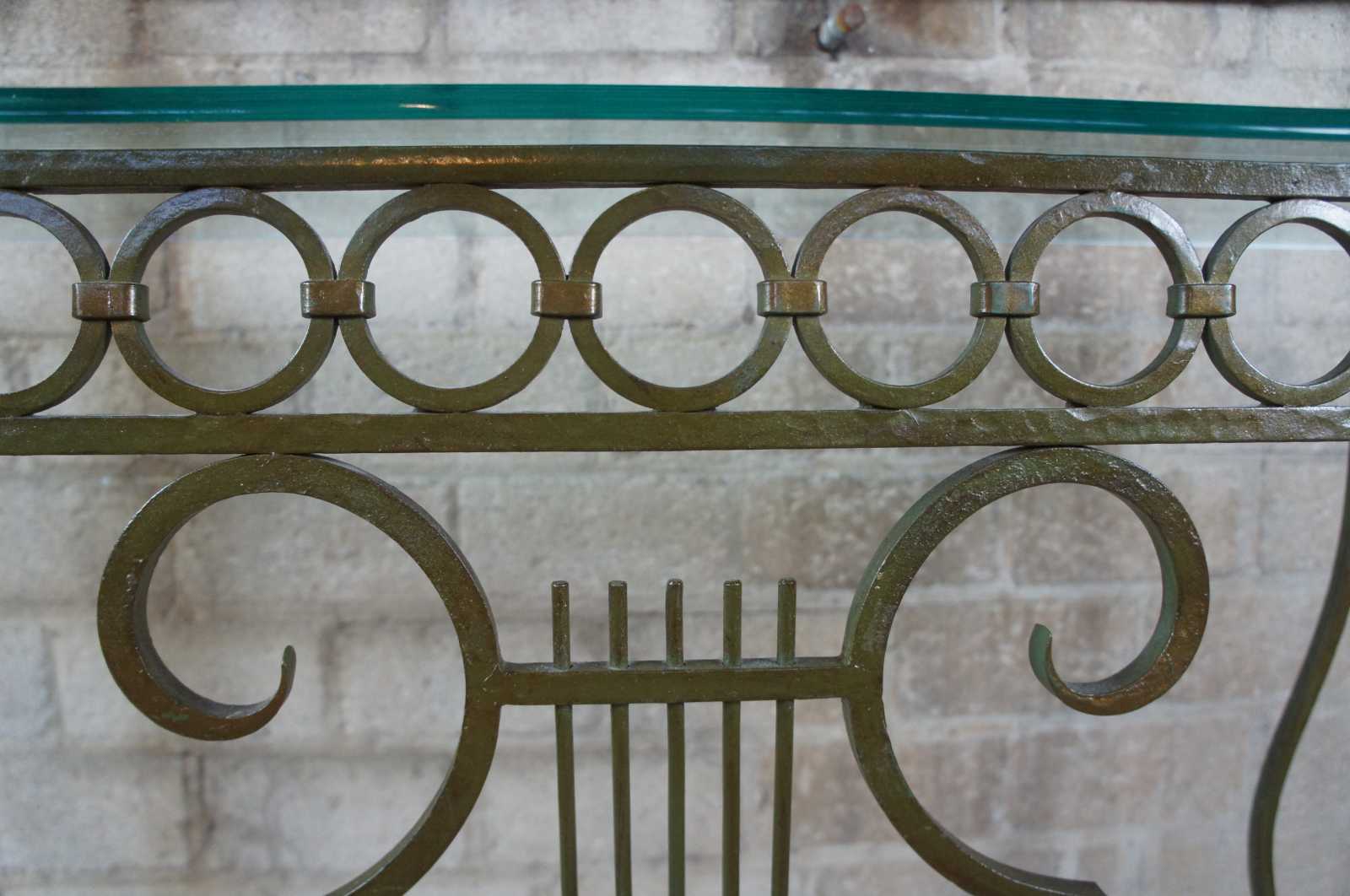 Late 20th century wrought iron with verdegris finish console table with glass top. Features s harpe front, scrolled feet and a ringed gallery and acanthus accents.