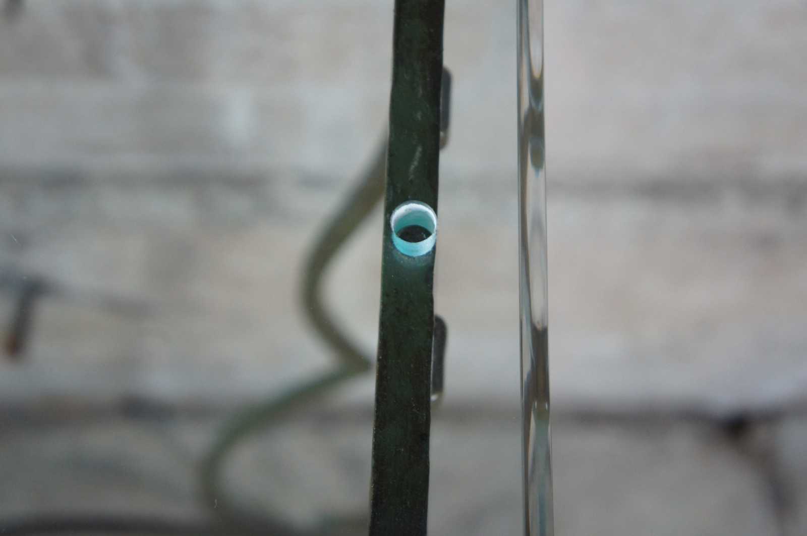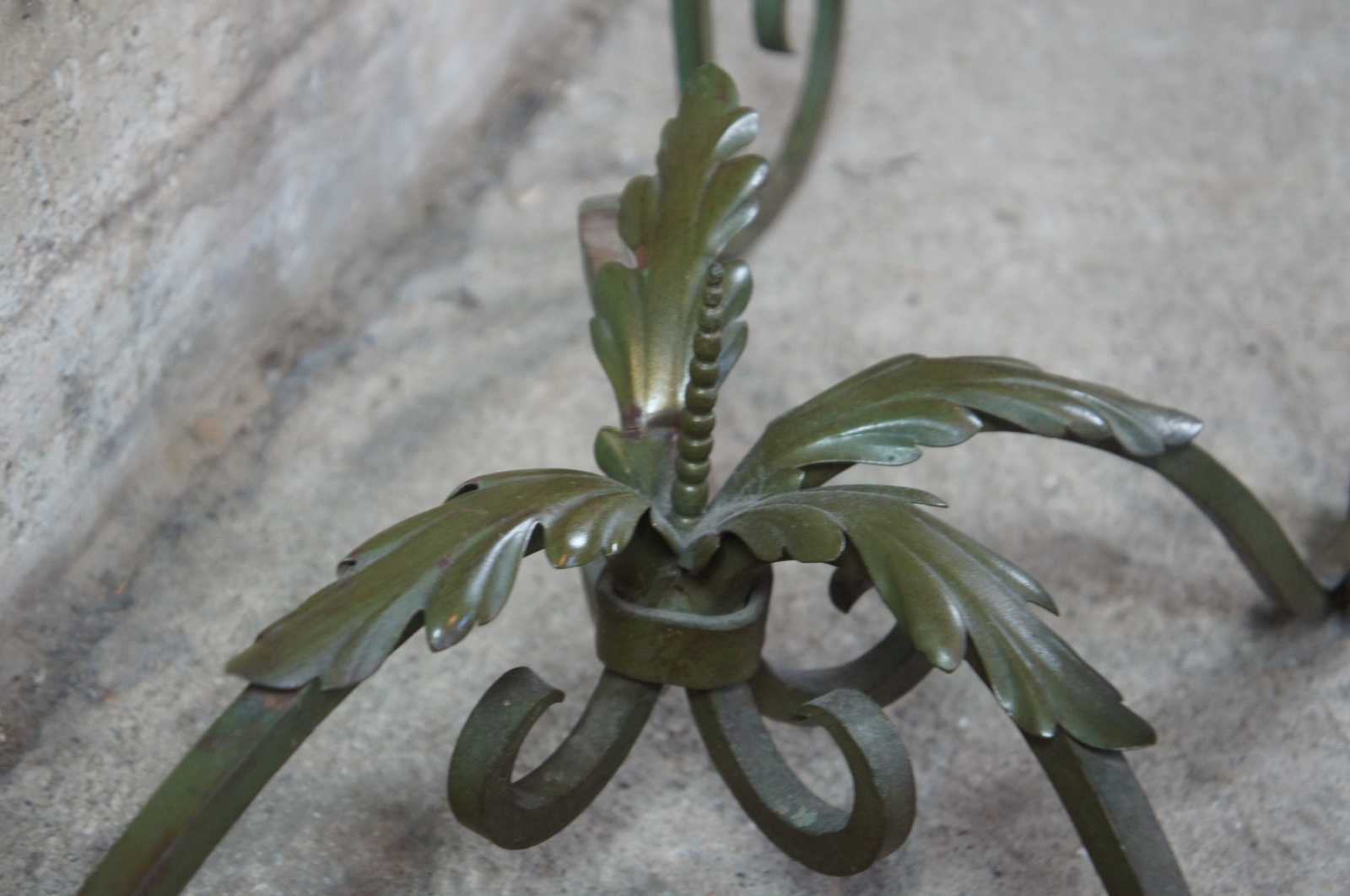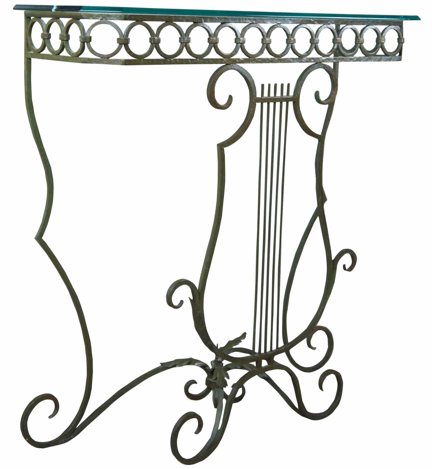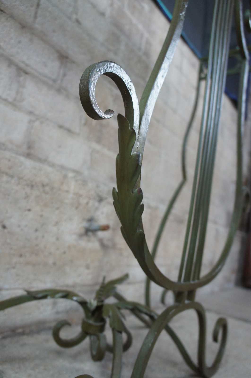 Late 20th century wrought iron with verdegris finish console table with glass top. Features s harpe front, scrolled feet and a ringed gallery and acanthus accents.