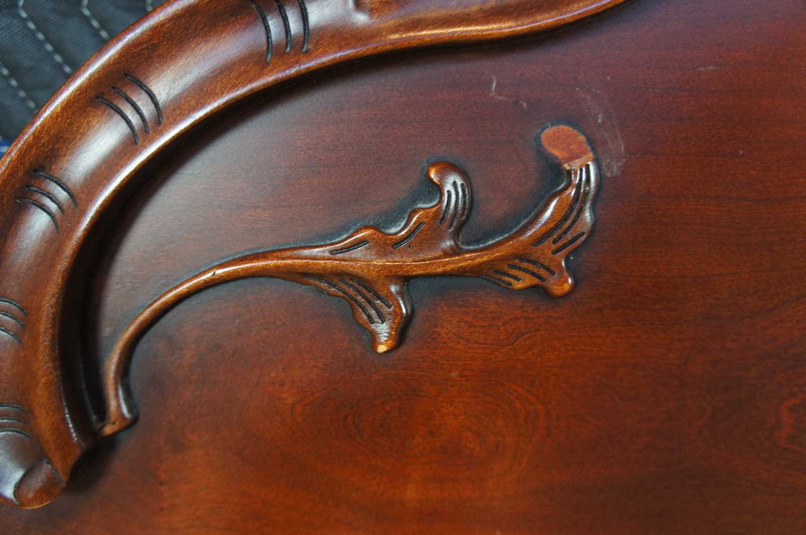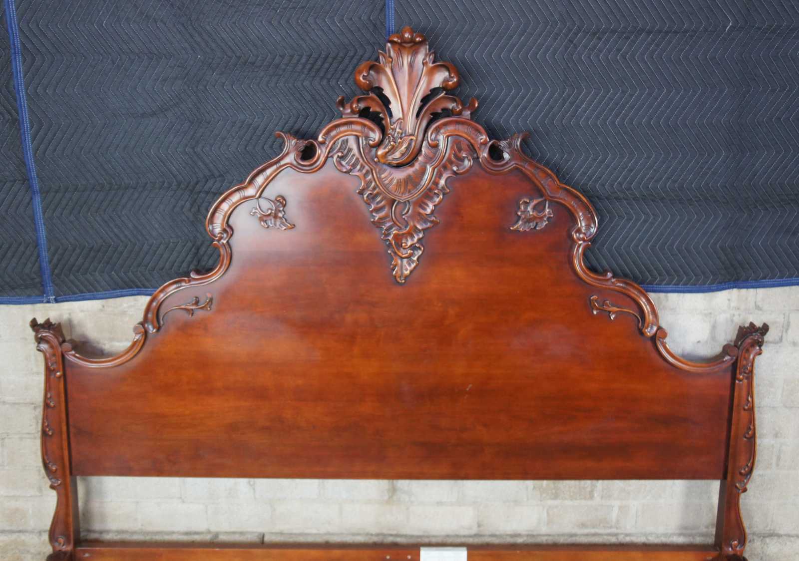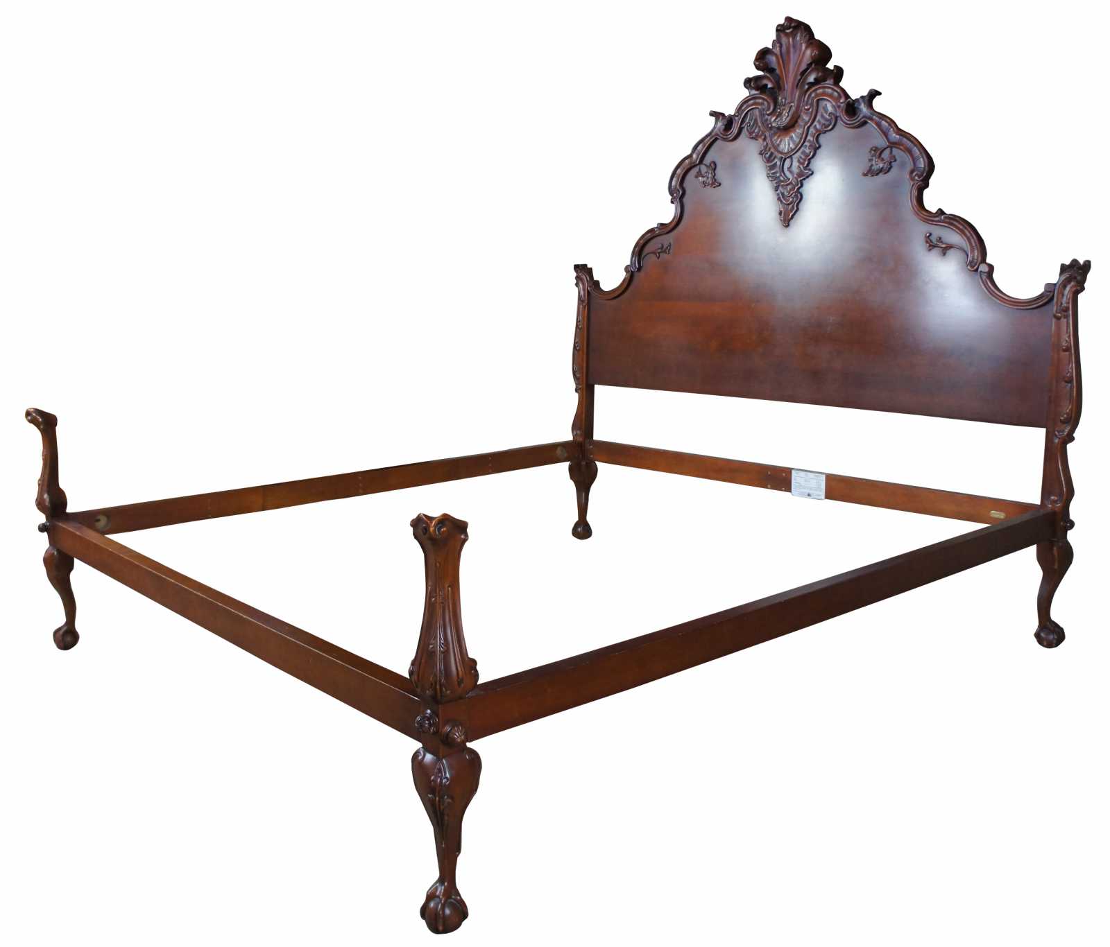 Henredon for Ralph Lauren king size mahogany bed. Influenced by Chippendale and Baroque styling with a dramatic arched headboard featuring ornately scalloped design. Includes ball and claw feet.