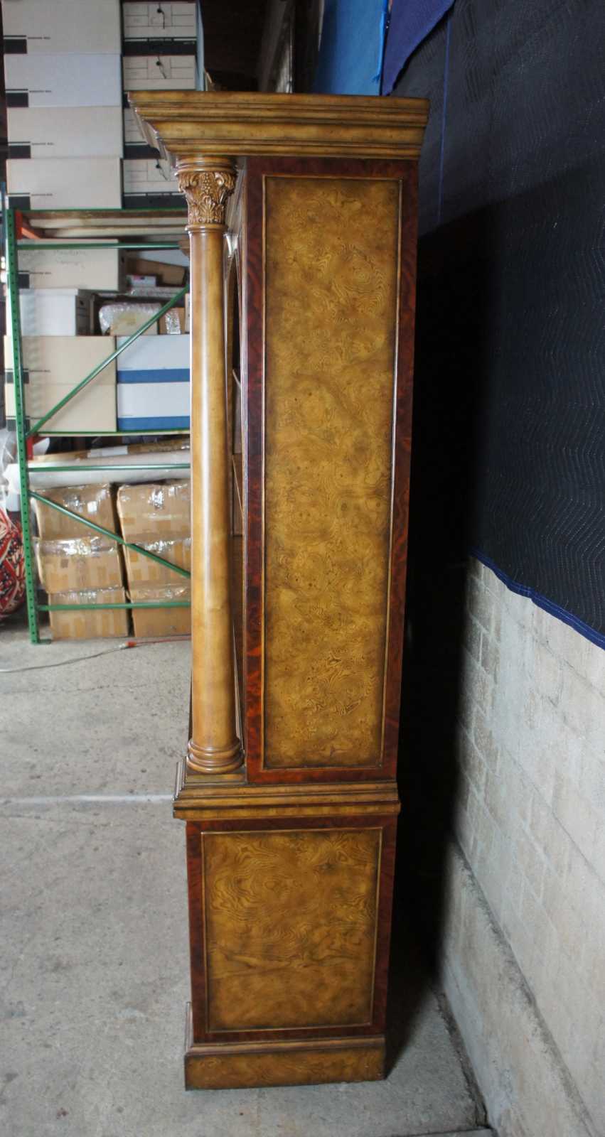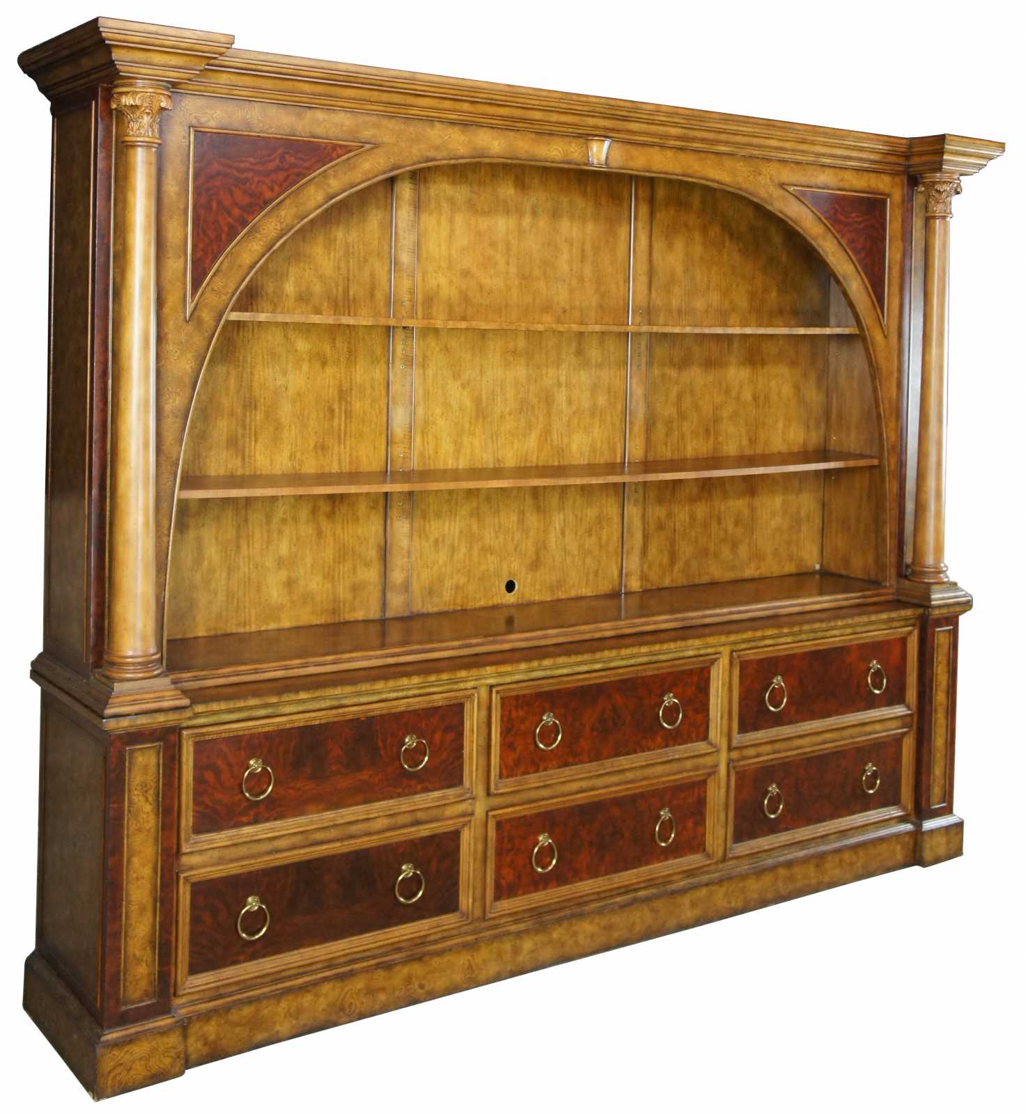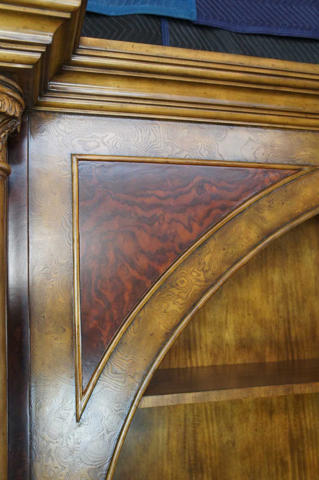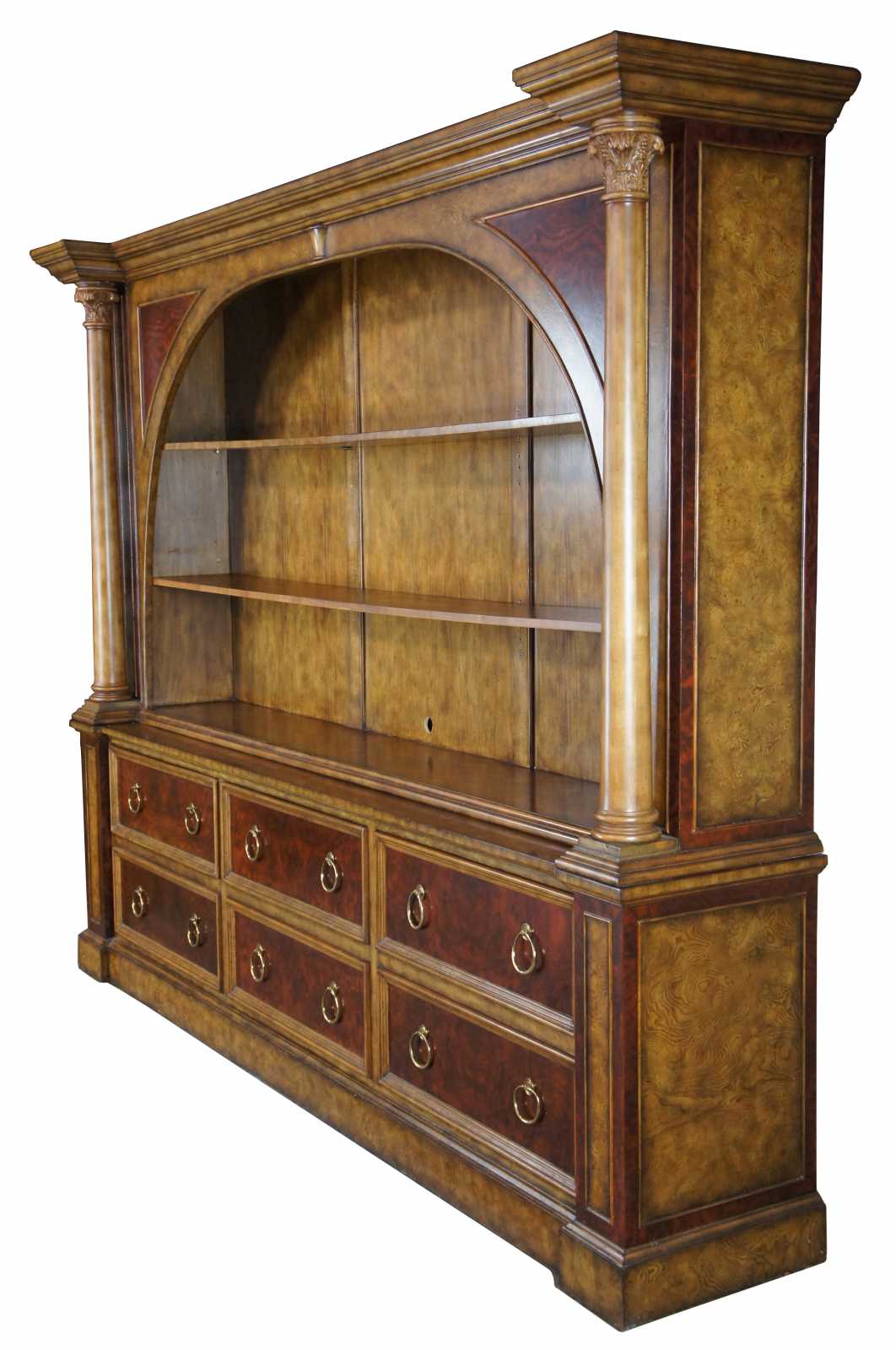 Neoclassical inspired bookcase by Maitland Smith. Features two concealed shelves behind and arched front with columns. Lower half includes six drawers with knocker pulls. Made from mahogany with burled ash.