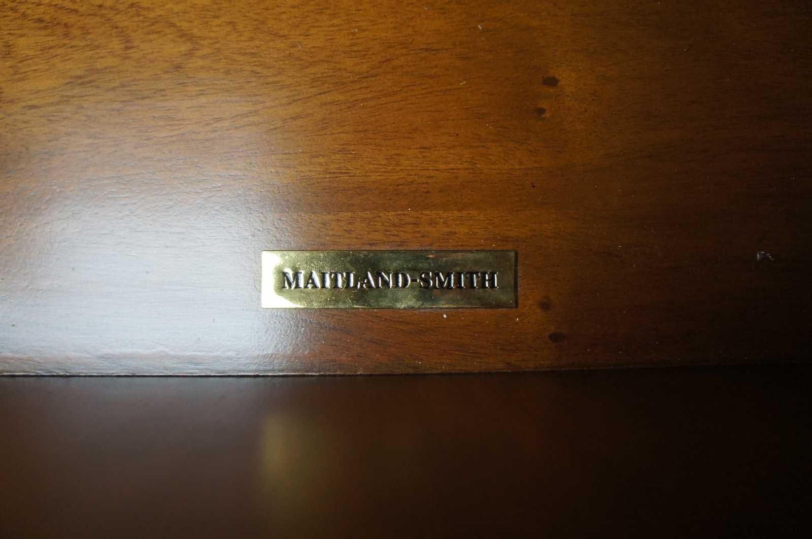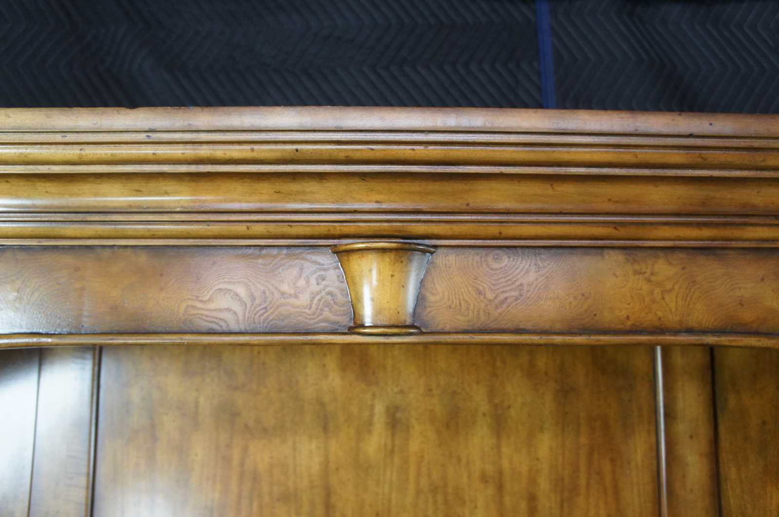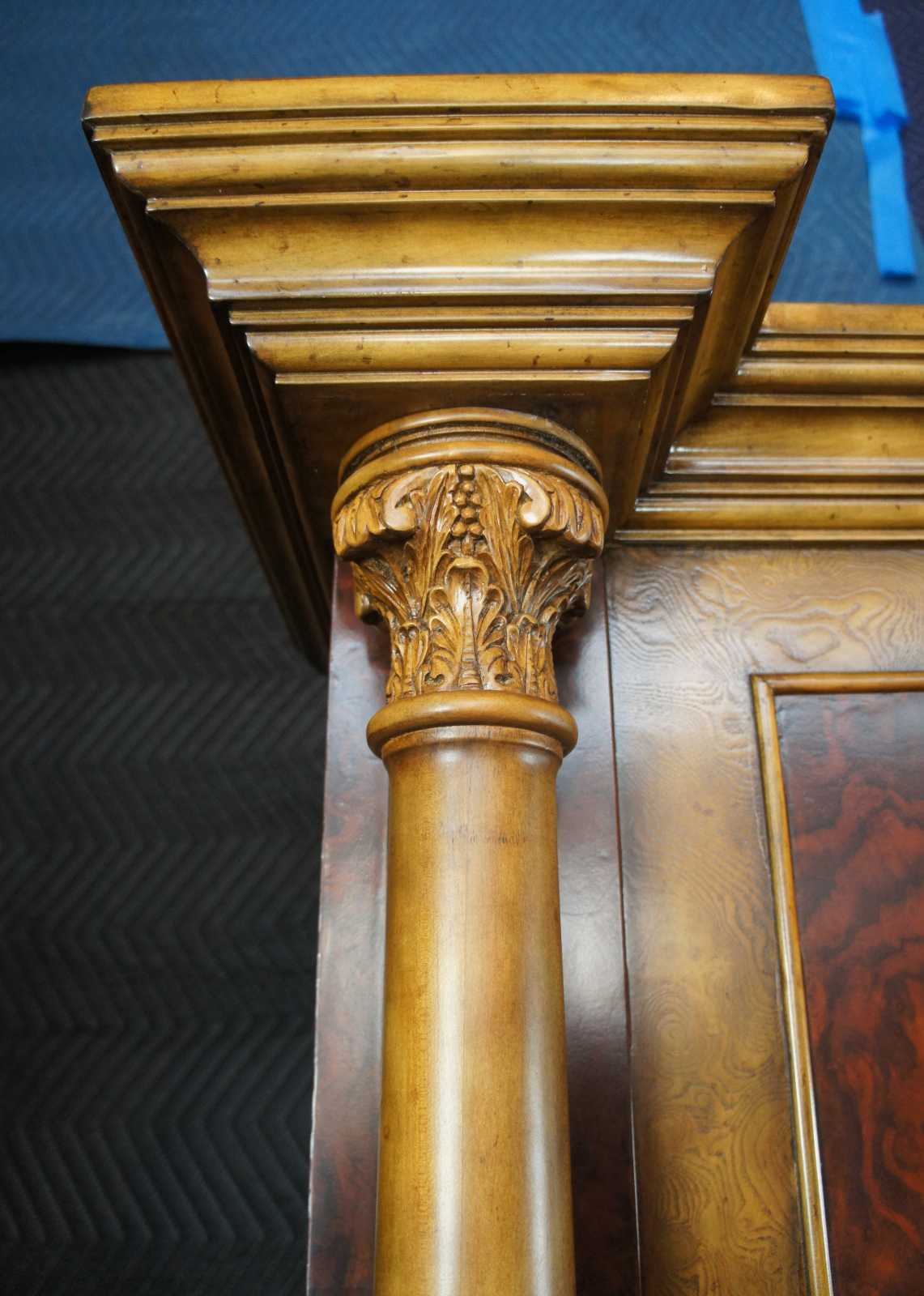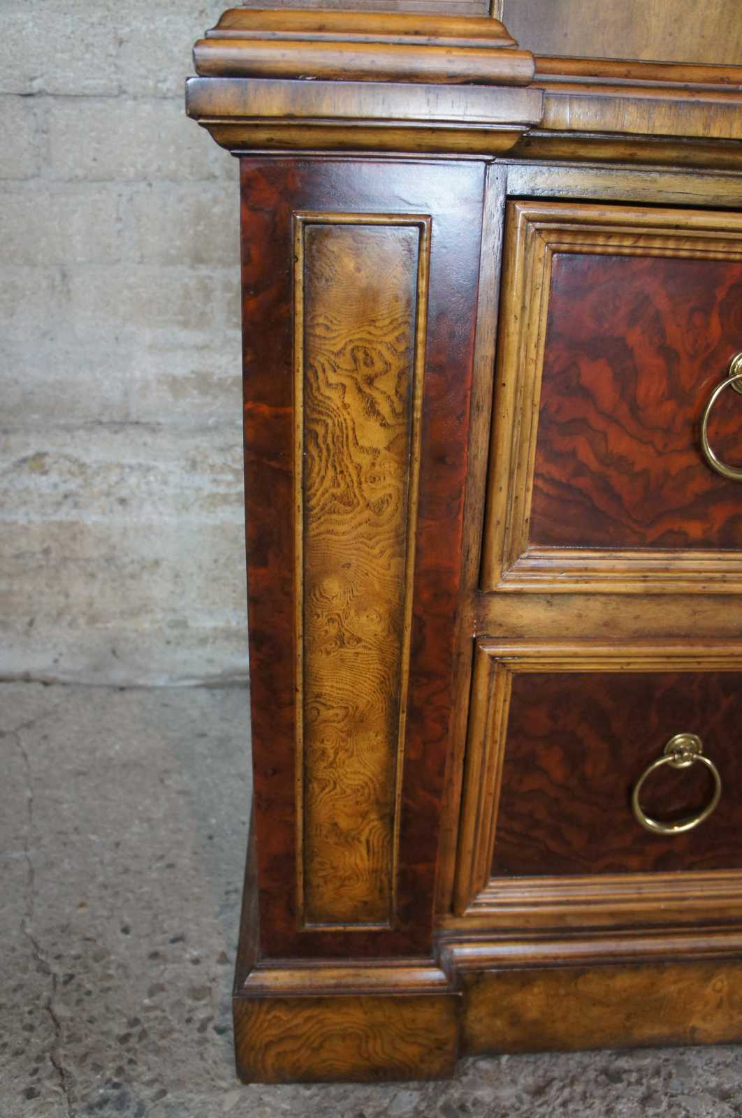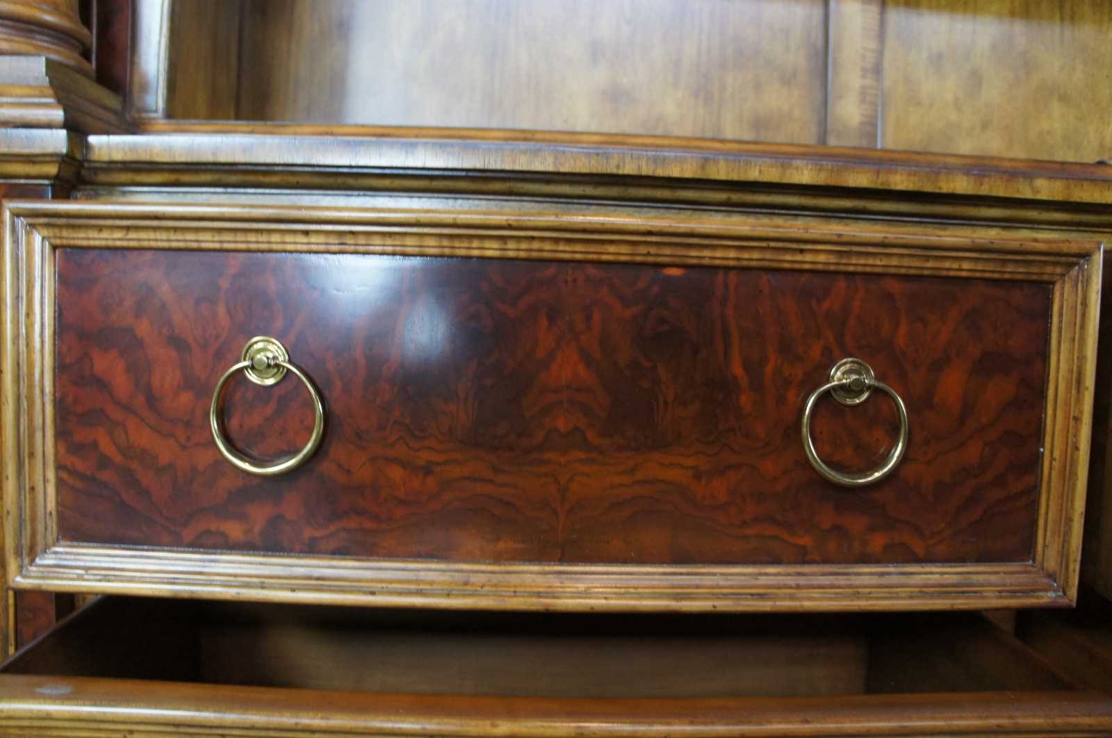 Neoclassical inspired bookcase by Maitland Smith. Features two concealed shelves behind and arched front with columns. Lower half includes six drawers with knocker pulls. Made from mahogany with burled ash.