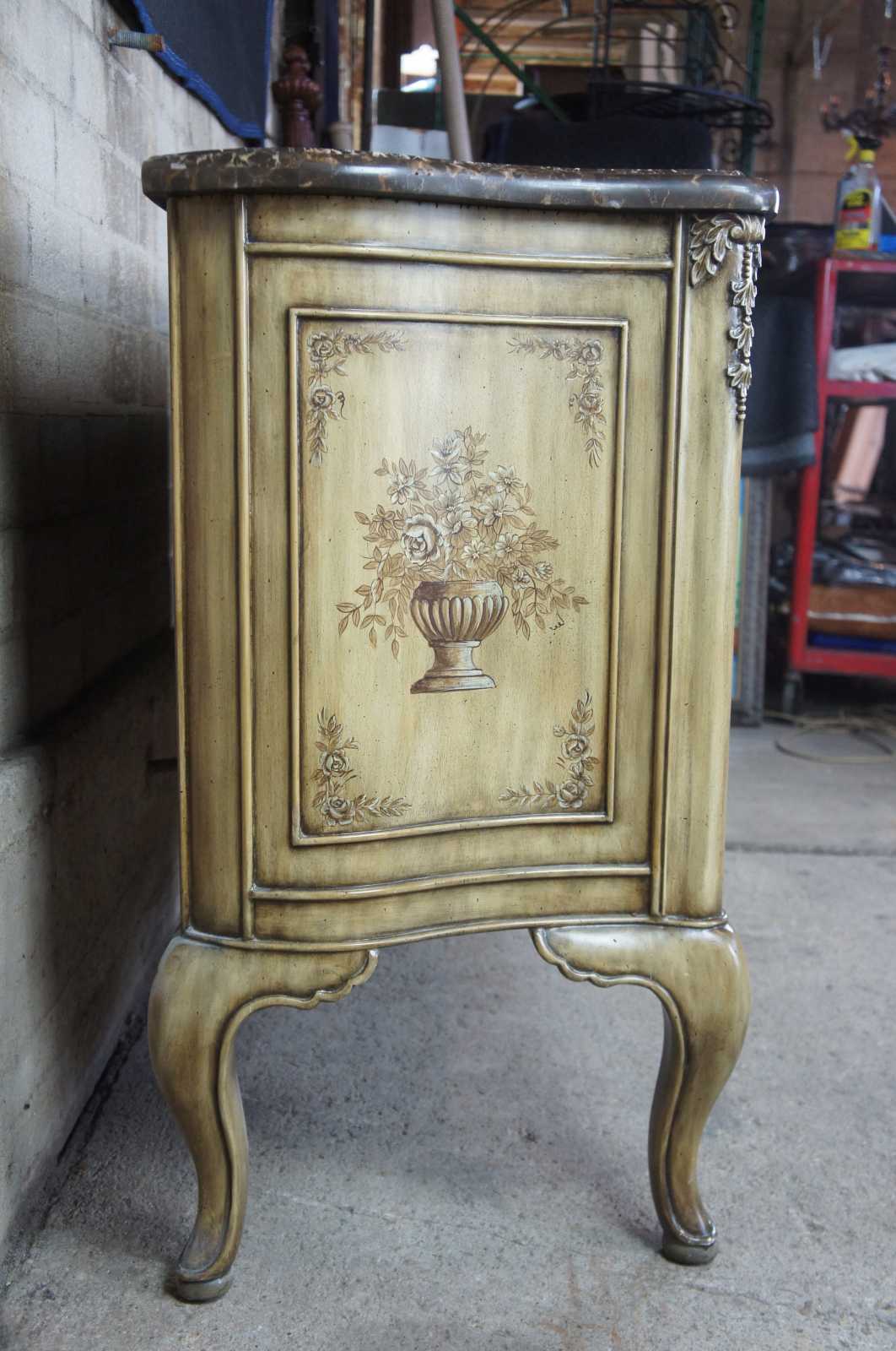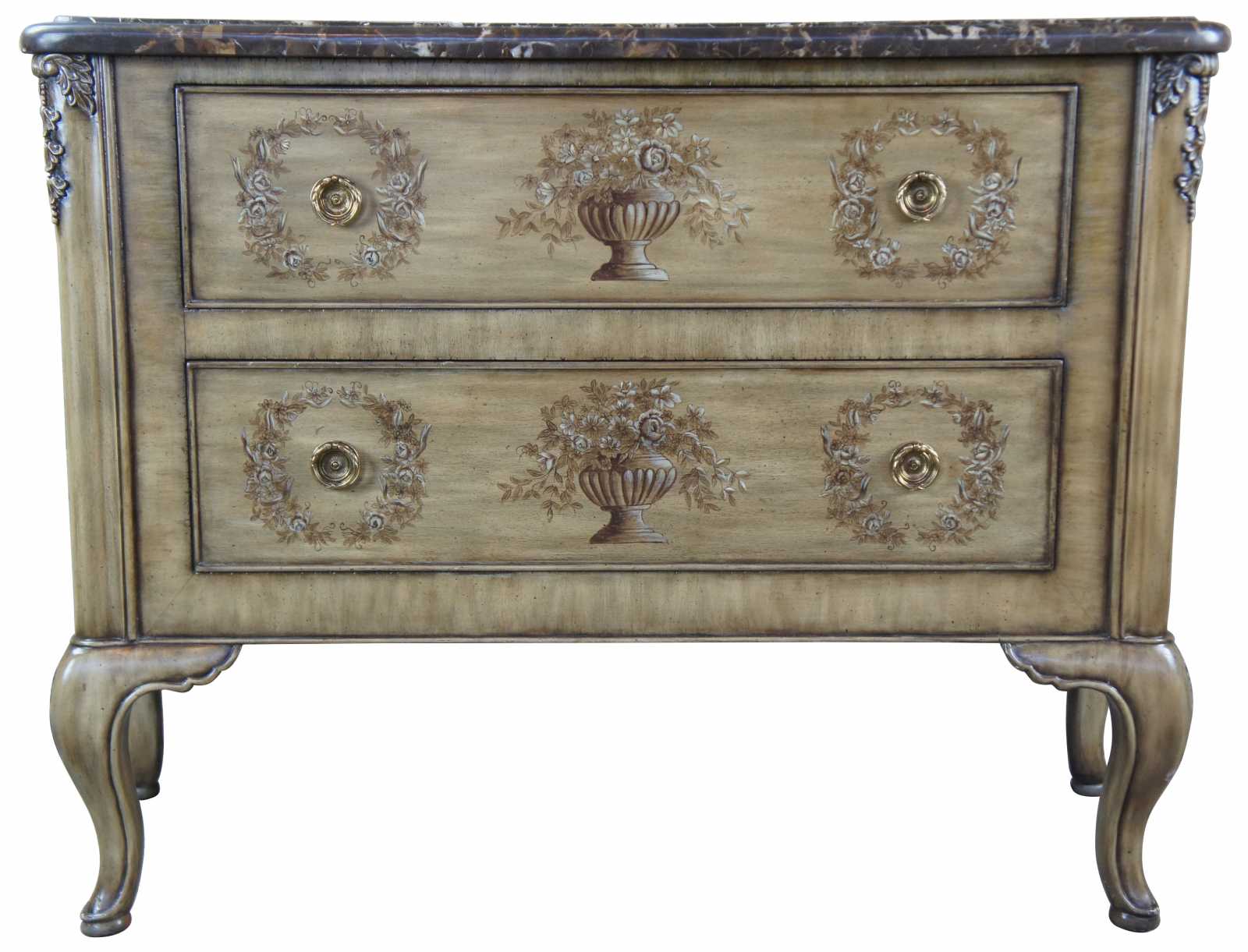 Circa 1990s Maitland Smith hand painted stone top chest. Features Louis XV styling with hand painted floral detail and brass hardware.