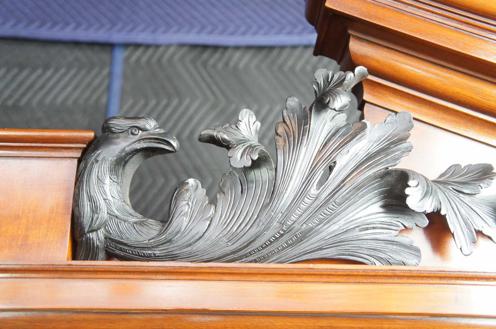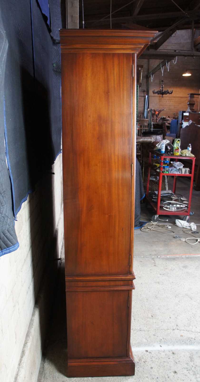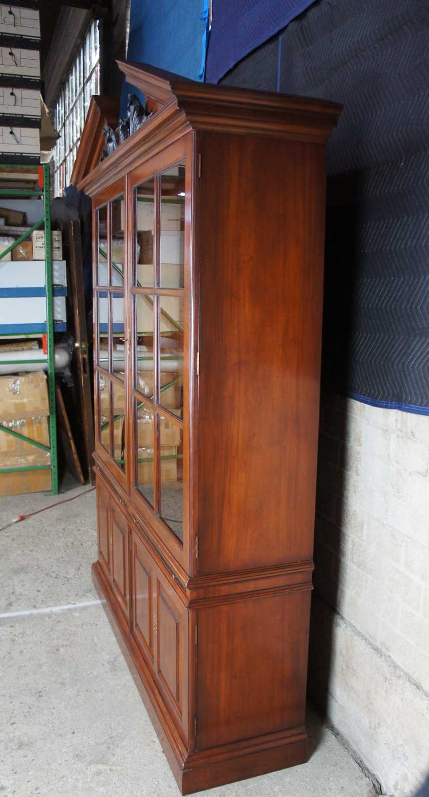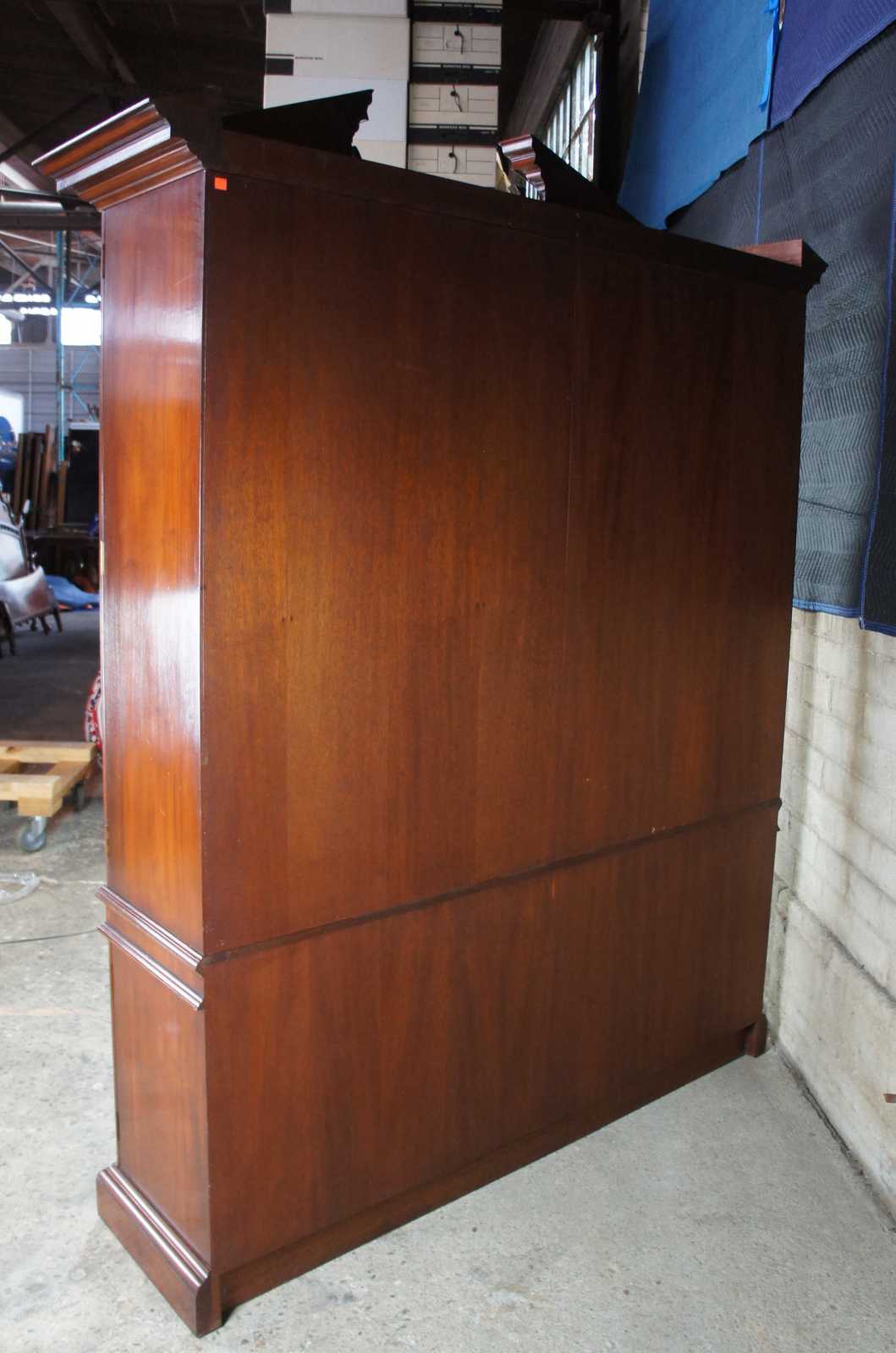 Late 20th century George II style library bookcase by Arthur Brett. Made from mahogany with a wide base featuring two six pained doors opening to adjustable shelves over pullout work surfaces and lower cabinet storage. Includes an open pediment top with mirrored ebonized hand carved eagles.