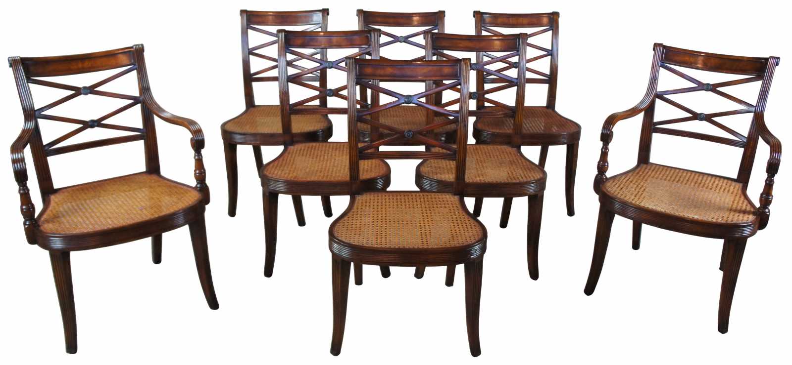 Theodore Alexander 4100-902. A hand carved armchair with reeded decoration, the over scroll and double 'X' pierced back above a cane seat with upholstered downfilled cushion. The chairs are made from mahogany and feature sabre legs.