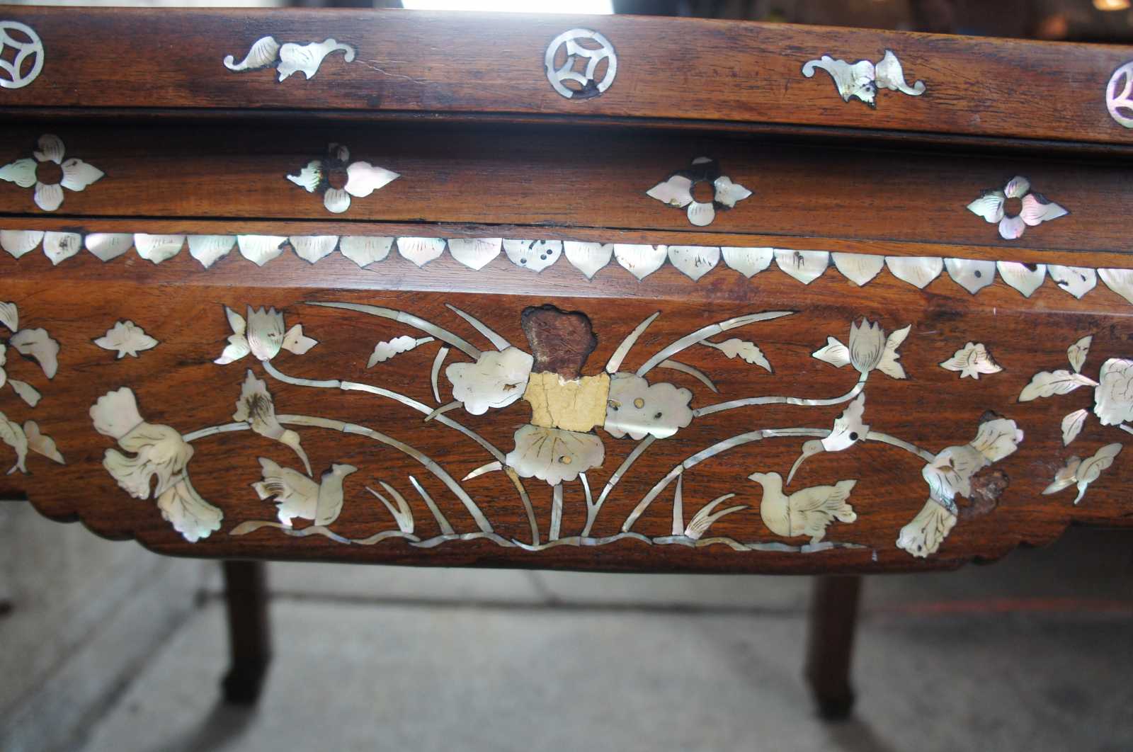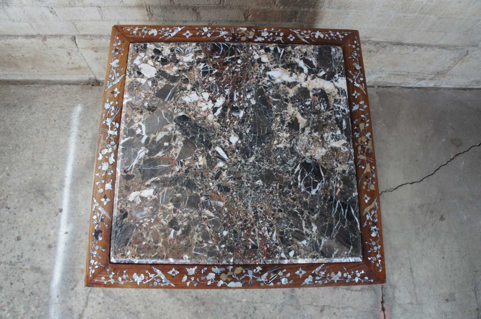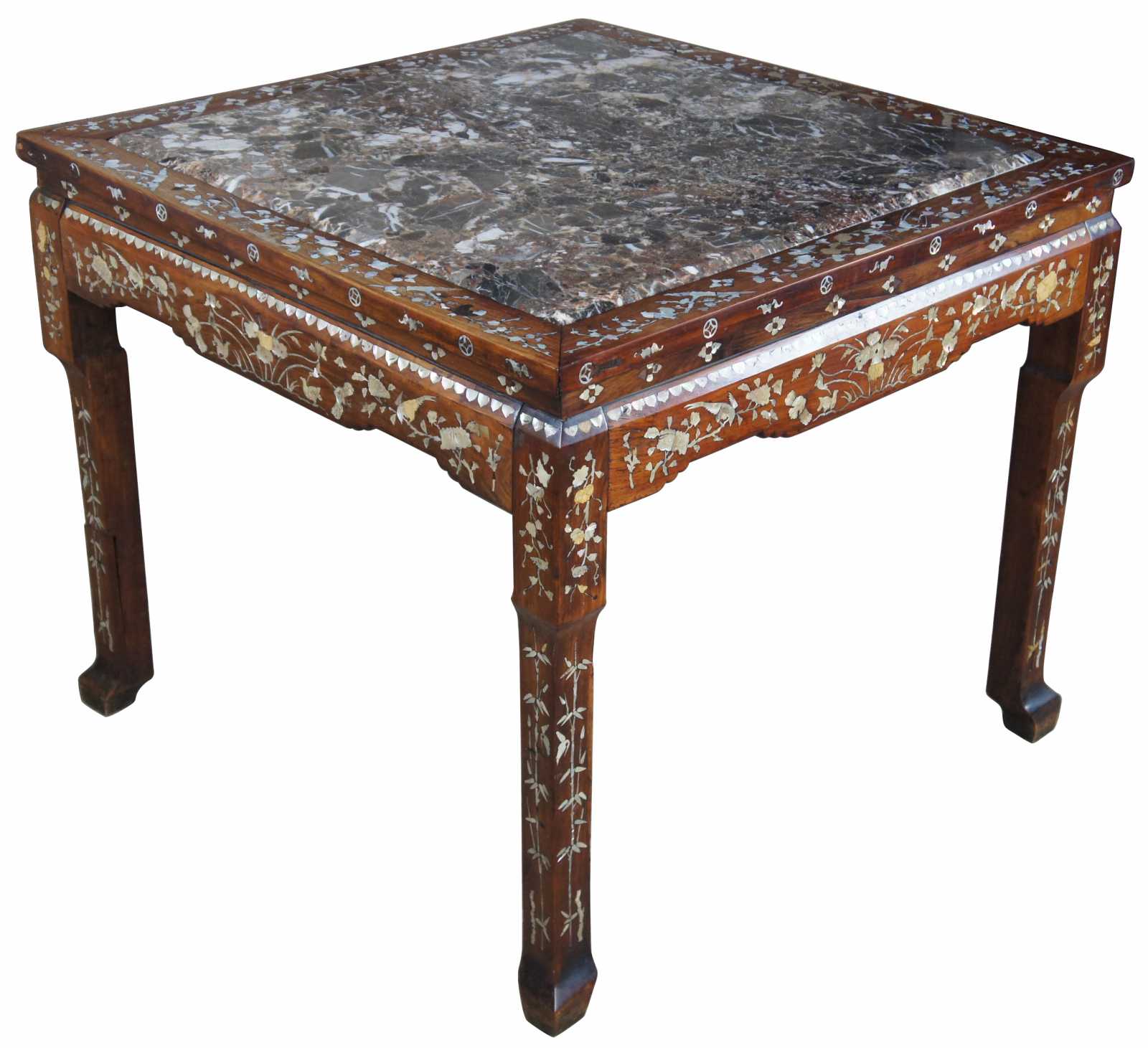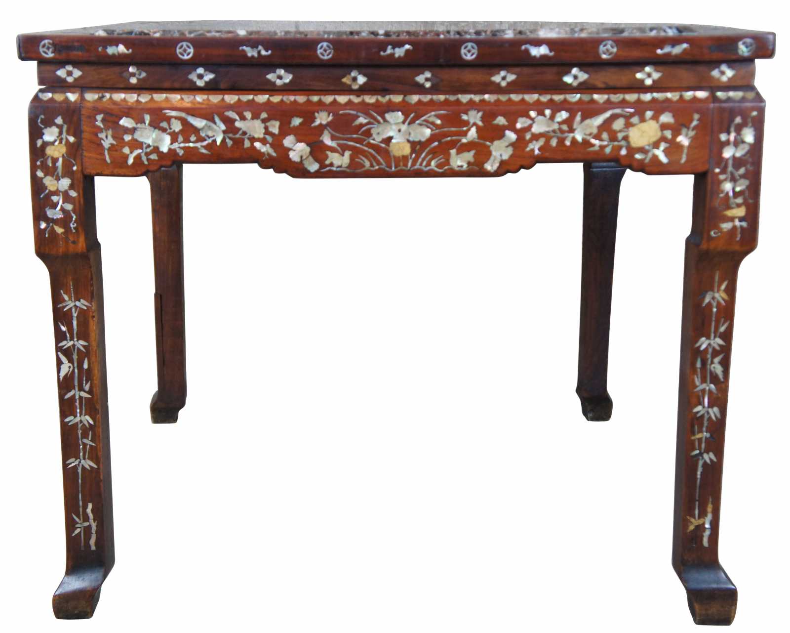 Good antique condition, wear and distressing commensurate with age and use, some Mother of Pearl loss, cracking, splits, small chip to corner of marble, see pictures.