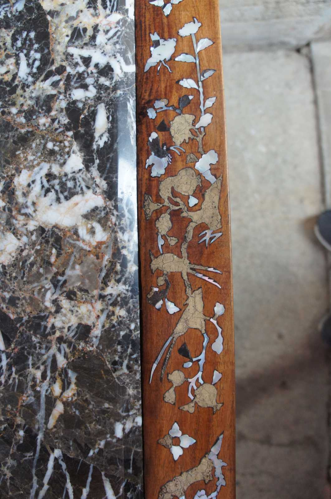 19th century Rosewood Mother of Pearl inlaid game or breakfast table with marble top insert. Intricately detailed with bamboo shoots along the legs, flowers and birds along the apron, and other decorative motifs.