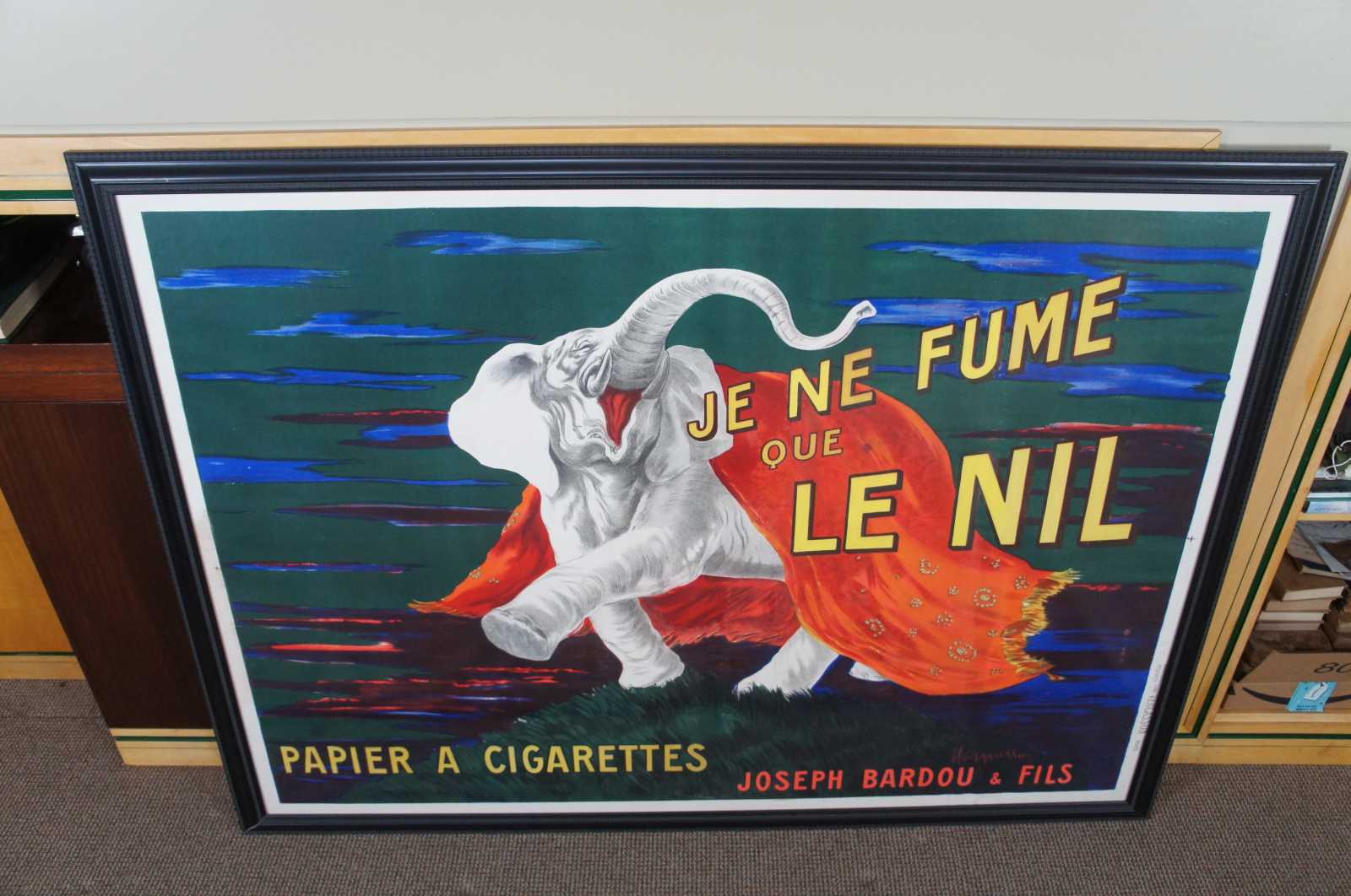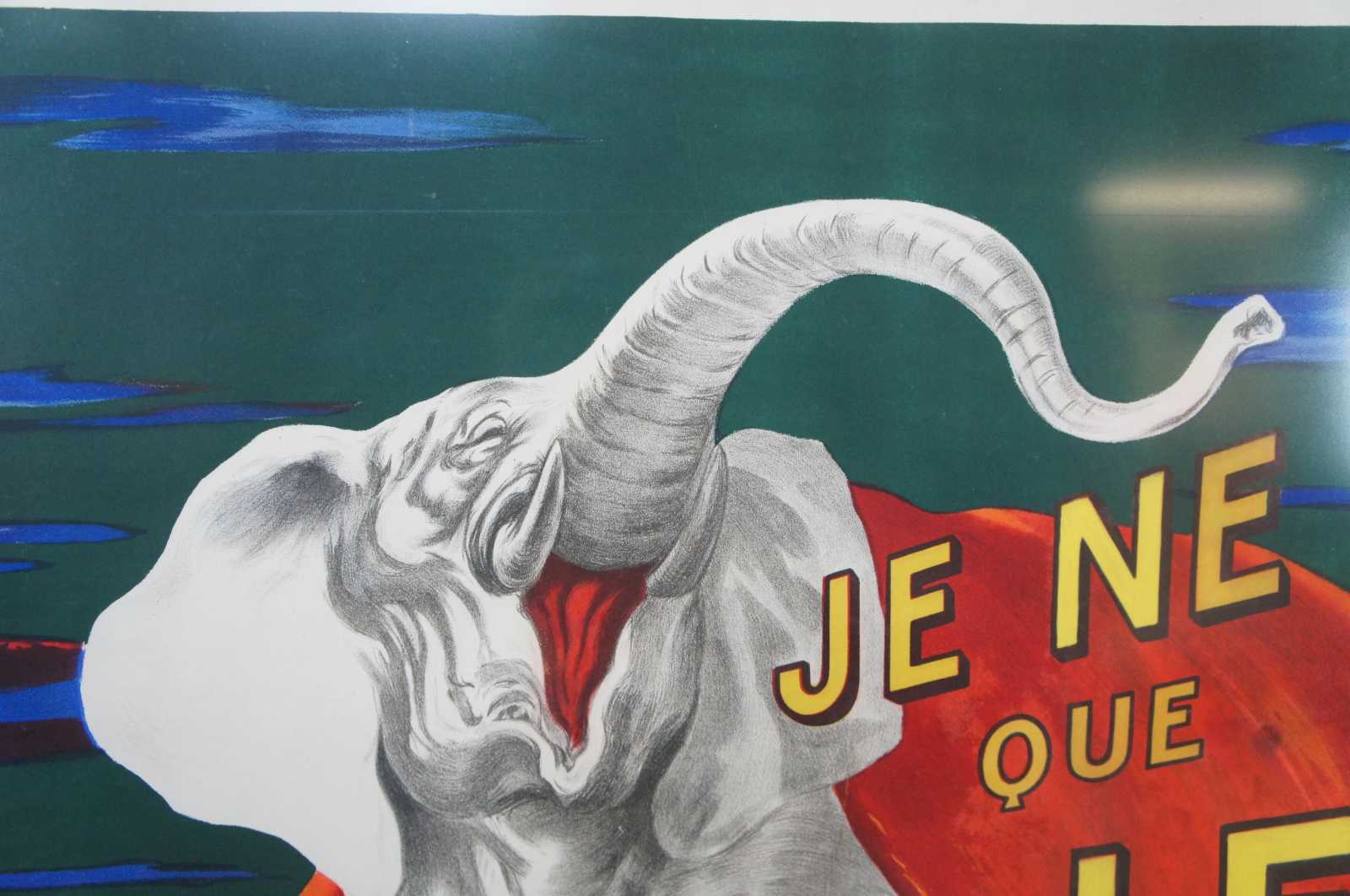 An iconic poster by the master, Leonetto Cappiello, this striking stone lithograph from 1912 features an elephant as the mascot for cigarette rolling papers. Joseph Bardou & Fils. Translates to I only Smoke Paper Cigarettes Nil.