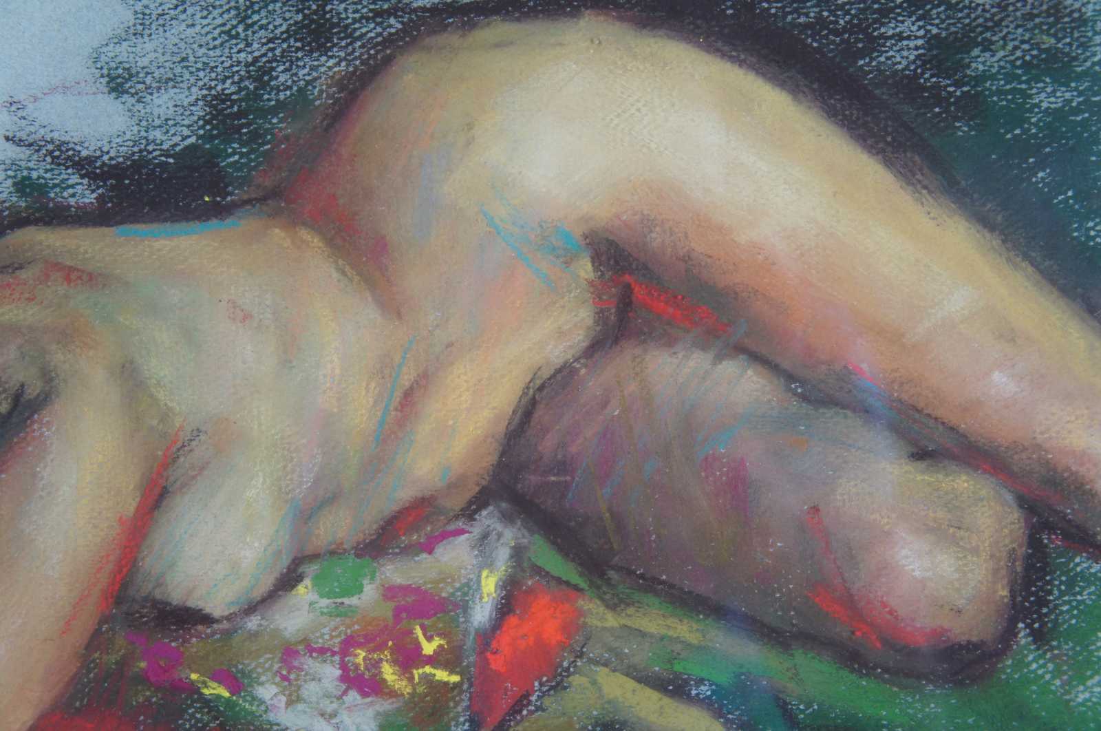 Pastel drawing by Daniel Greene titled Reading, circa 1960s – portraying a nude woman reclinging on pillows and reading a book. BIO: Daniel Greene is a leading pastelist and oil painter who is known for his portrait commissions which hang in the White House, the Smithsonian and the Metropolitan Museum of Art as well as his paintings in series such as the New York subway series, the auction series and the series of drinking glasses. Greene dropped out of high school in Cincinnati and traveled to Miami where he stayed with relatives and made money selling pastel portraits on the street in order to save up for art school. Years later after he attended the Art Students League in New York City, he taught there and at the National Academy of Design. A renowned teacher he continues to give workshops and produce videos. He has written two books, "Pastel" and "The Art of Pastel" which are highly regarded in the field. In 1983, he was the first living artist inducted into the Pastel Hall of Fame. He also received the John Singer Sargent Award for lifetime excellence in portraiture and the Medal of Honor from the Portrait Society of America. He has won Gold Medals from both the Portrait Society of America and and the Salmagundi Club. In May 2003, he conducted the Grand Opening Demonstration at the International Association of Pastel Societies.