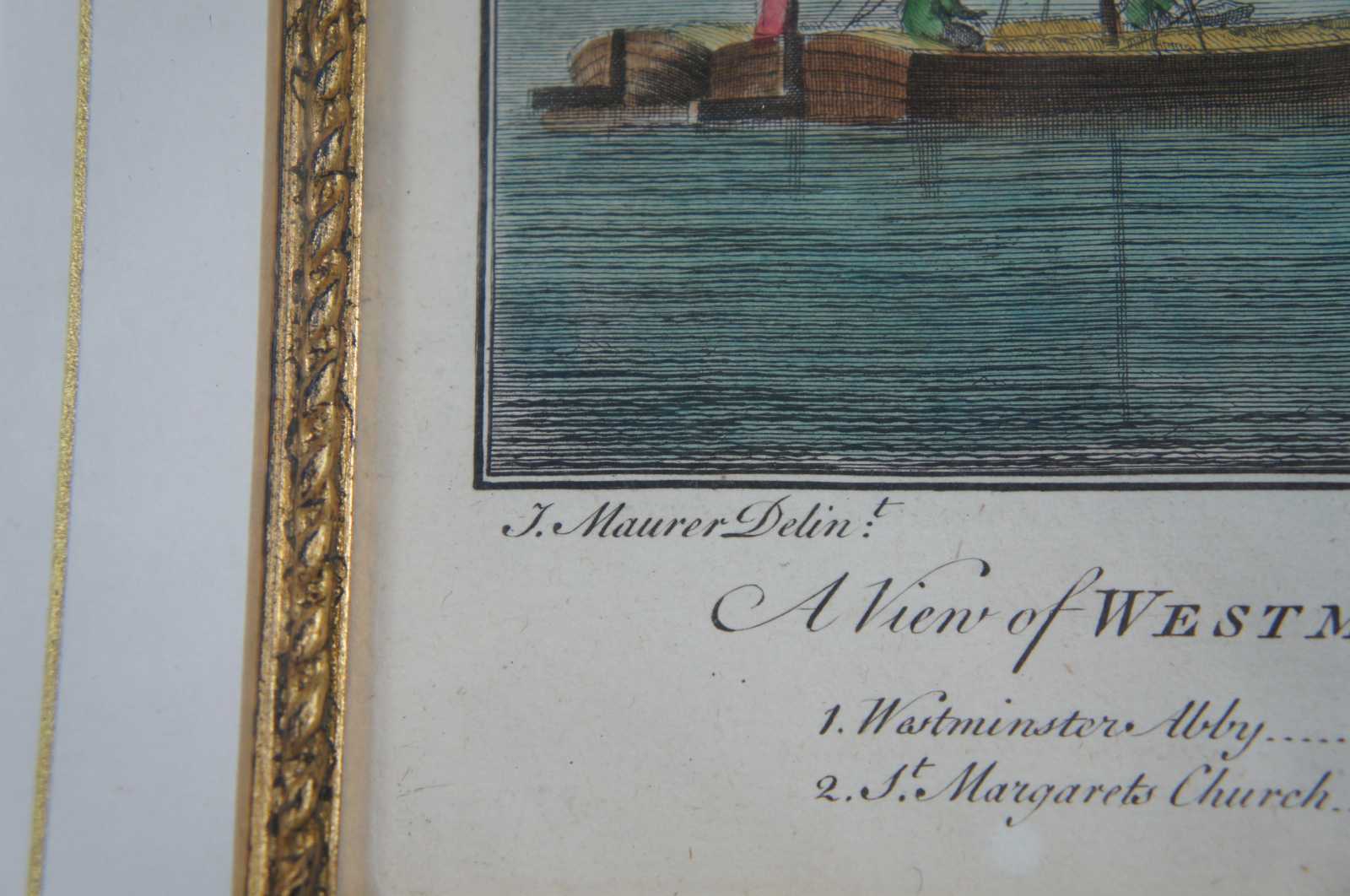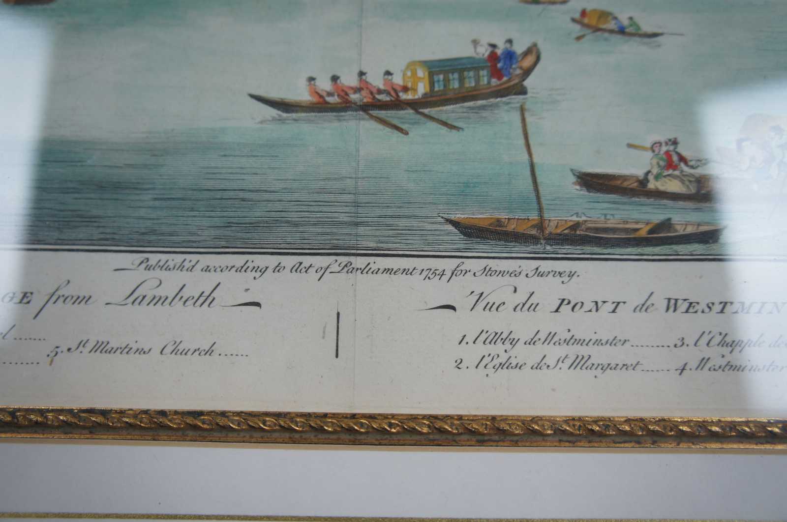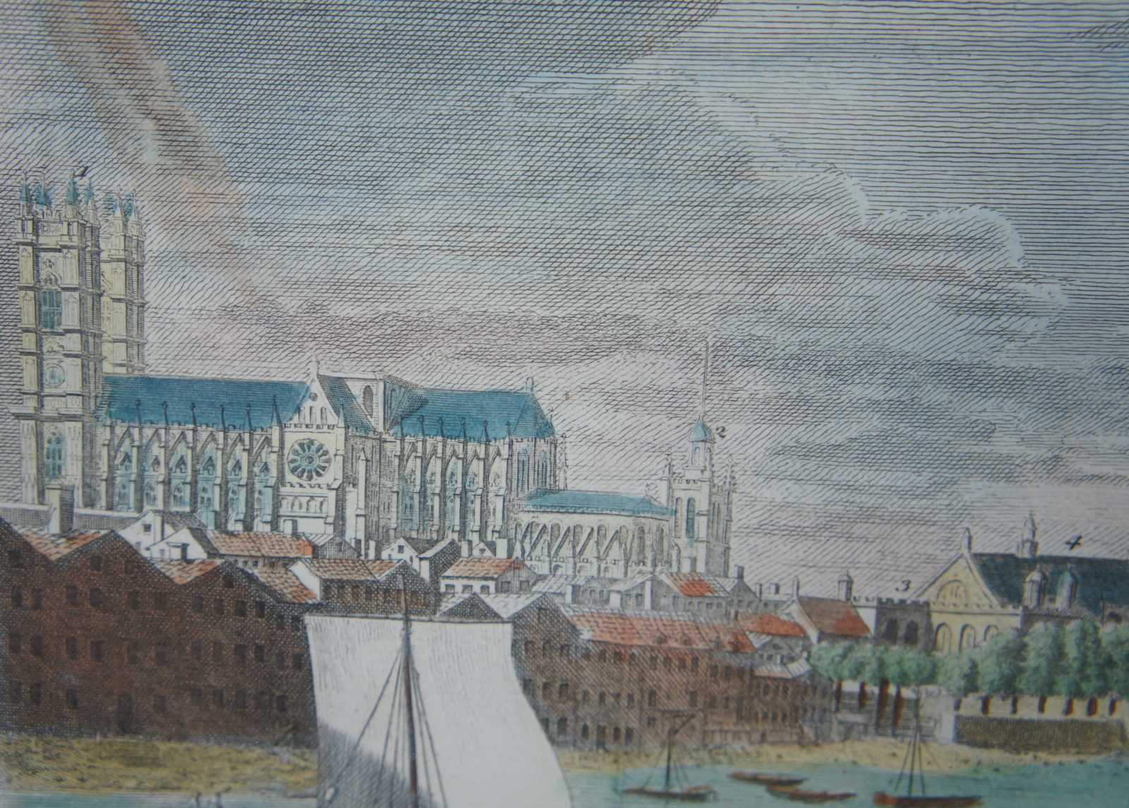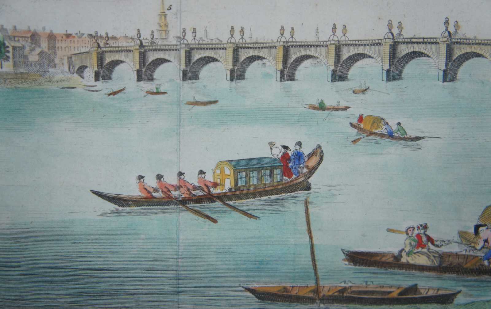 Antique hand colored riverscape / landscape copperplate engraving based on a painting by Jacob Maurer and engraved by Paul Fourdrinier - A View of Westminster Bridge from Lambeth, published according to Act of Parliament 1754 for Stowe’s Survey of London. BIO: Paul Fourdrinier sometimes referred to as Peter or Pierre Fourdrinier, was an 18th Century engraver in England. Paul Fourdrinier, engraver and printseller, was born on 20 December 1698 in Groningen in the Netherlands, the son of Jacques Fourdrinier and his wife, Jeanne Theroude, Huguenot refugees from Dieppe, Normandy. He was a pupil of Bernard Picart at Amsterdam for six years, and came to England in 1720. He was employed in engraving portraits and book illustrations. He also engraved two works by Peter Monamy, marine paintings displayed in Vauxhall Gardens. The engravings were published in 1743, but may have been executed earlier. Starting in 1742 Fourdrinier produced a series of books consisting of numerous folding charts showing "The Succession of Colonels to all his Majesties Land Forces from their Rise to 1742", as well as many other details of British military and naval personnel. The 2004 edition of the Oxford Dictionary of National Biography makes it clear that in the 19th century edition of the Dictionary of National Biography this engraver's works and career were assigned to two individuals, Peter (or Pierre) and Paul Fourdrinier. Peter/Pierre is now seen to be a fictitious individual resulting from an accidental misnaming of Paul. Paul Fourdrinier is mentioned as the engraver of some of the works listed above, and he has been identified with the Paul Fourdrinier who was of the parish of St. Martin's-in-the-Fields, married to Susanna Grolleau, and who died in January or February 1758. The couple had at least five children, including a son Henry Fourdrinier, whose daughter, or granddaughter, Jemima Fourdrinier was the mother of Cardinal John Henry Newman. The engravings listed are in all cases inscribed ‘P. Fourdrinier.’ The title-page of Chambers's ‘Civil Architecture’ says that the plates were engraved by ‘Old Rooker, Old Fourdrinier, and others.’ Paul Fourdrinier also founded a stationery business which was carried on by his son and grandsons (Henry and Sealy)) until at least 1811.