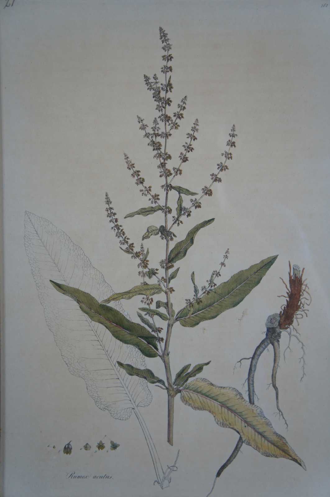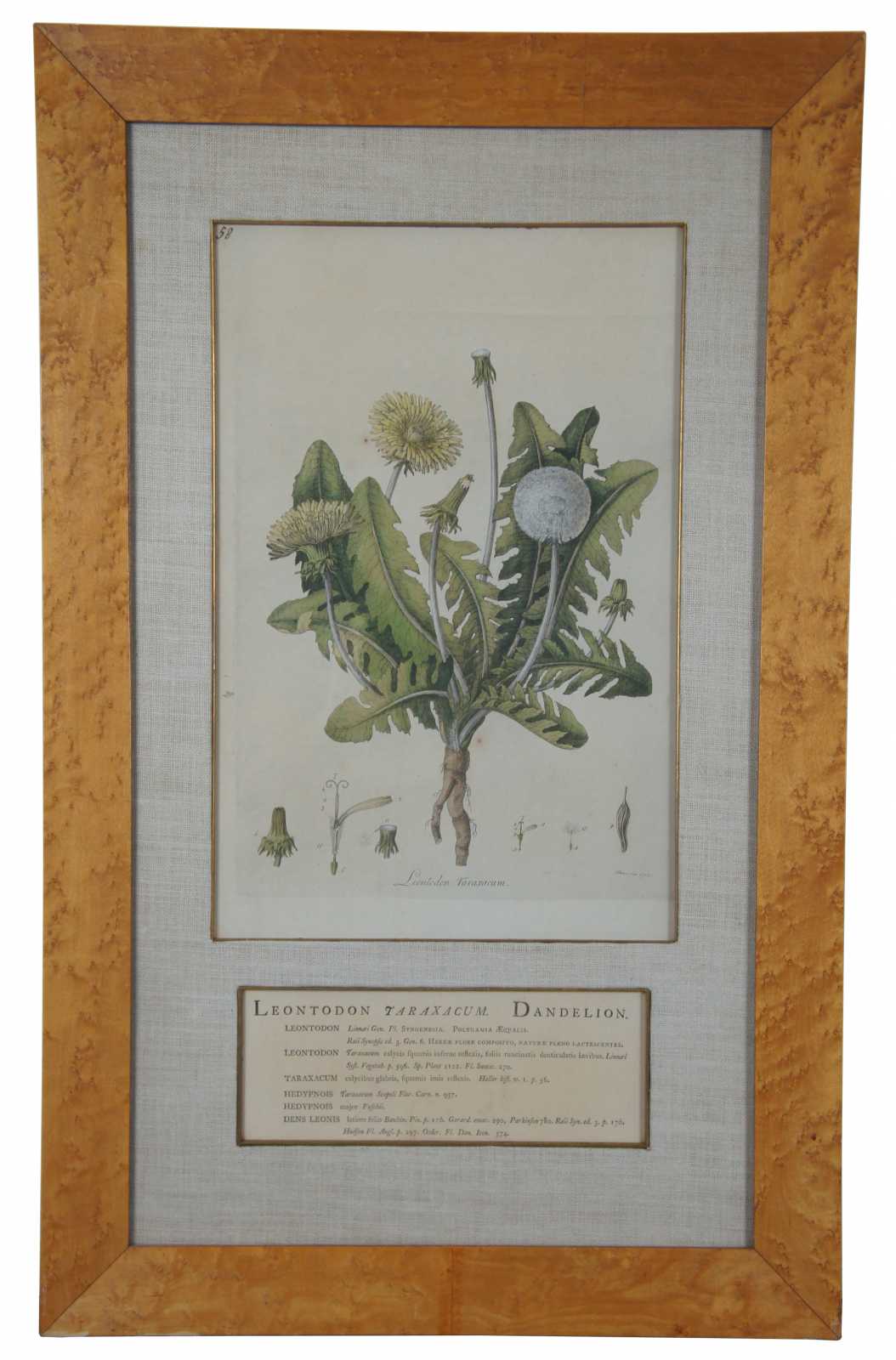 2 antique framed botanical colored etchings in olive wood burled frames – Leontodon Taraxacum Dandelion and Rumex Acutus Sharp-Pointed Dock.