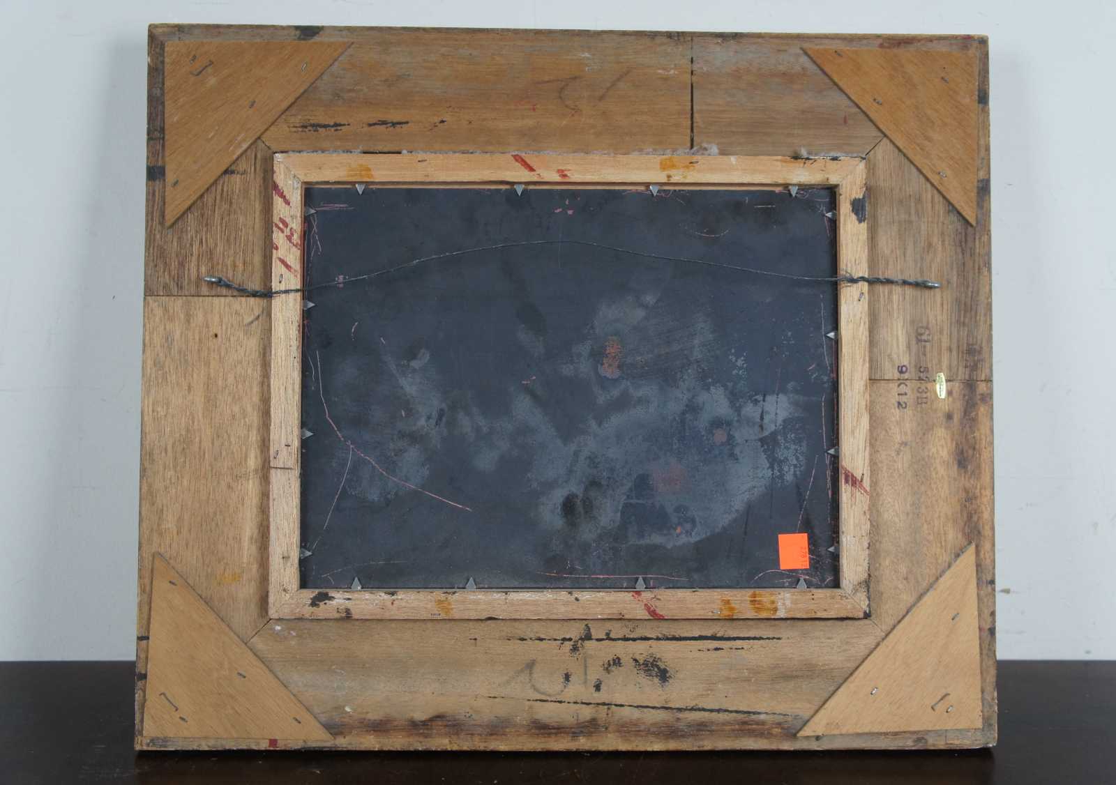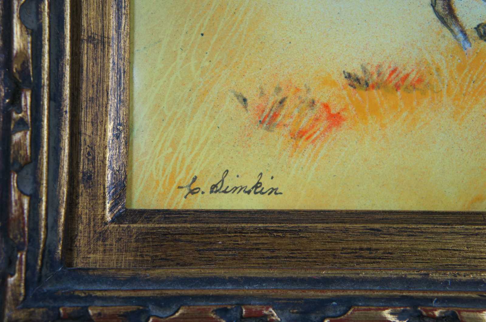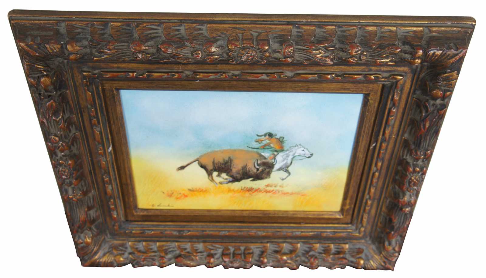 Signed Carol Simkin (American, 20th Century) enamel on copper impressionist style painting a Native American hunter on a white horse shooting a buffalo or bison.