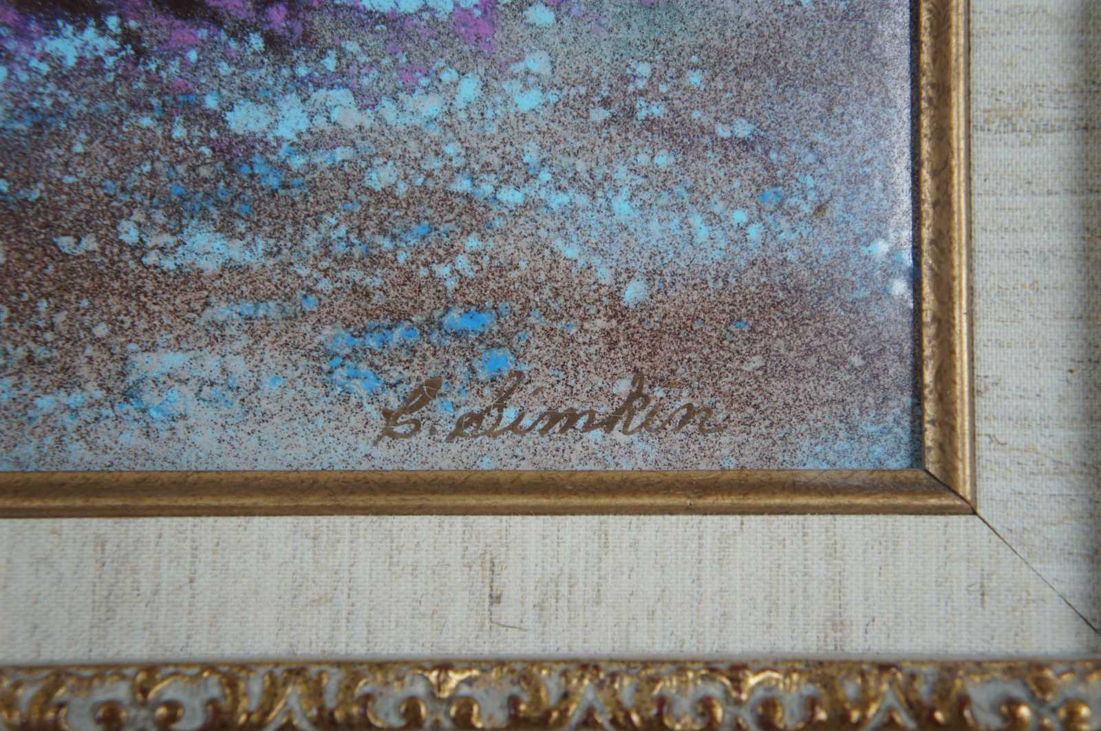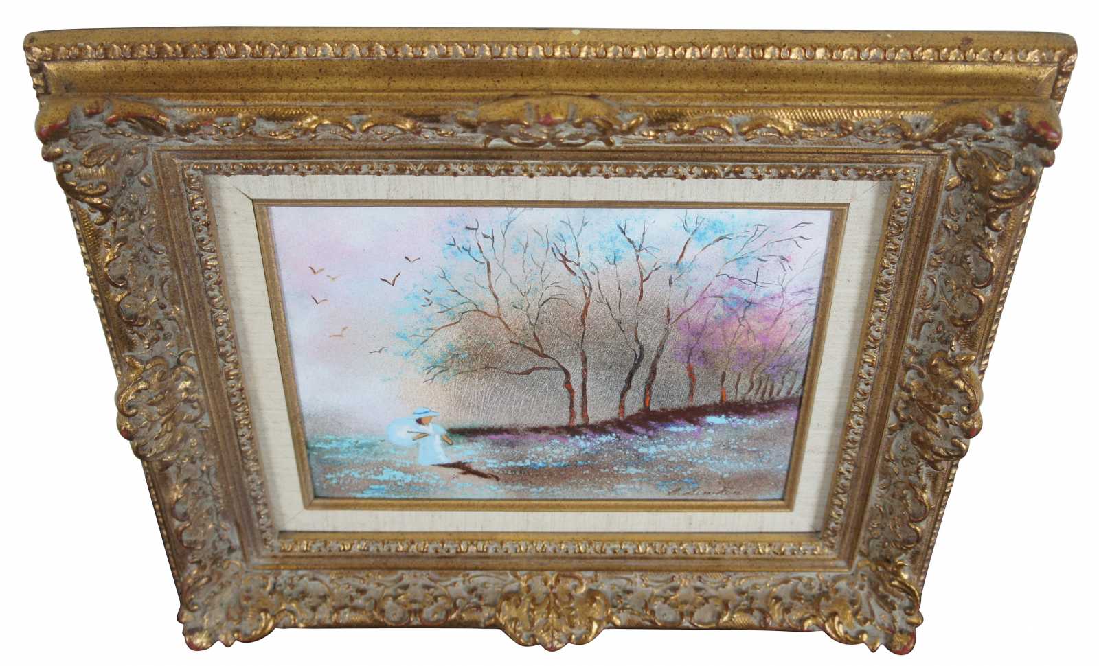 Signed Carol Simkin (American, 20th Century) impressionist style enamel on copper paintingenamel on copper impressionist style painting showing a tree lined landscape with birds and a strolling figure with a hat and parasol or umbrella.