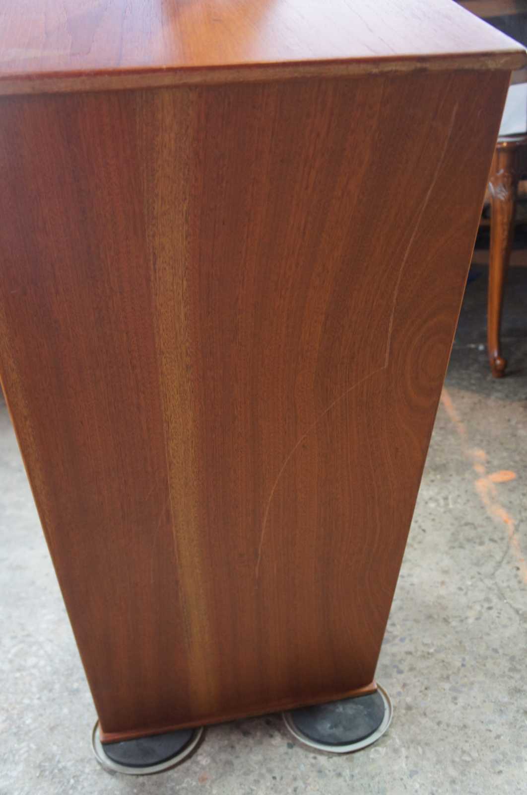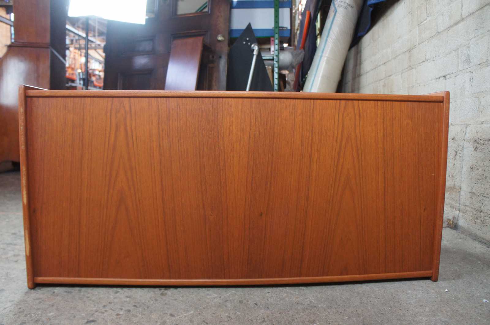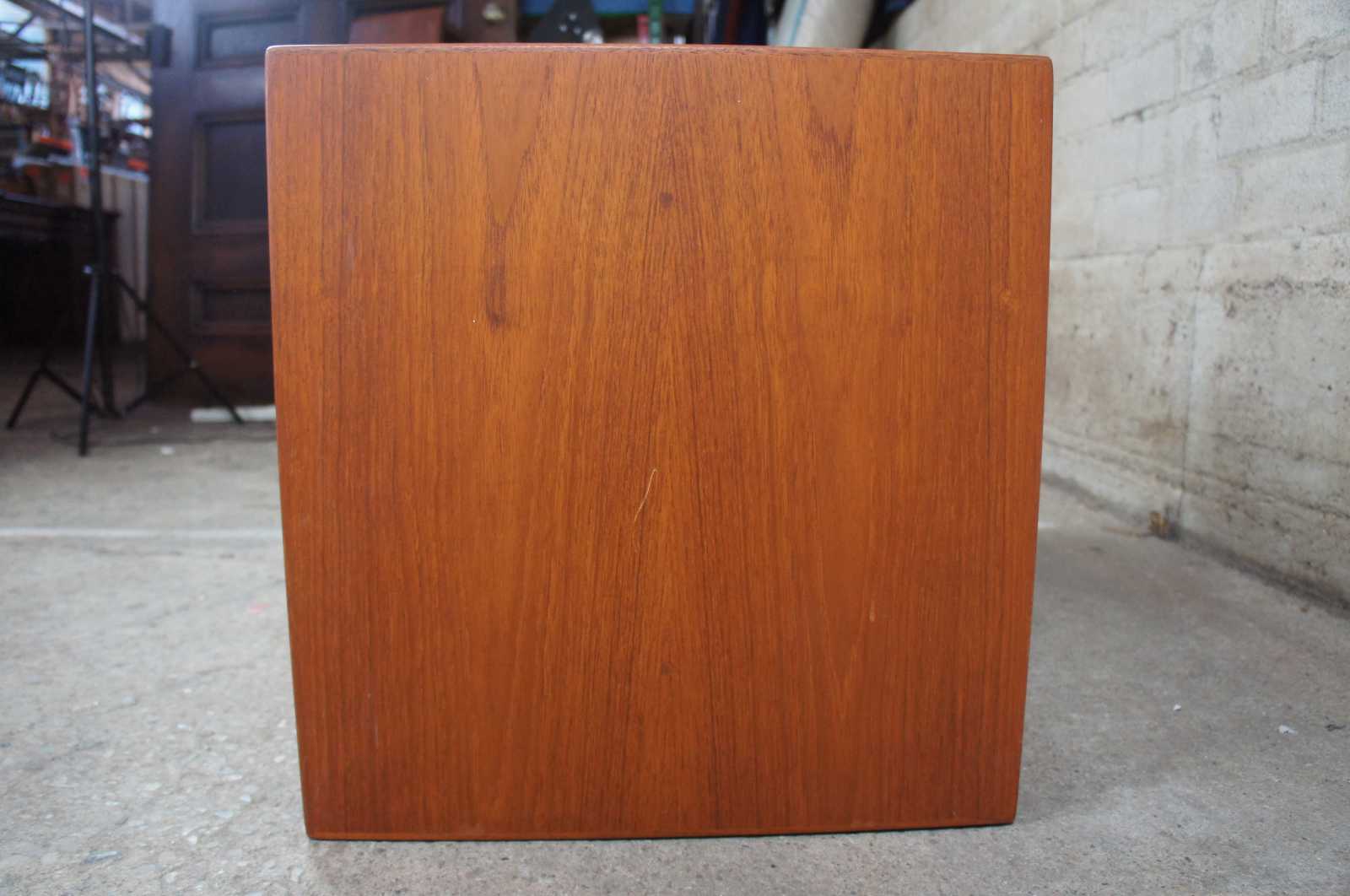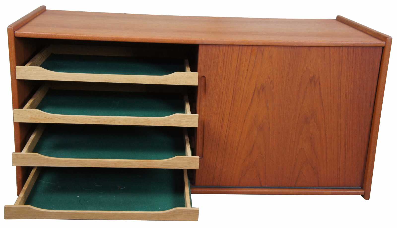 Mid century modern Scandinavian cabinet, attributed to Hans Wegner. Made of teak wood, featuring a sliding drawer which opens to reveal a shelf along one side with four slide out drawers on the other.