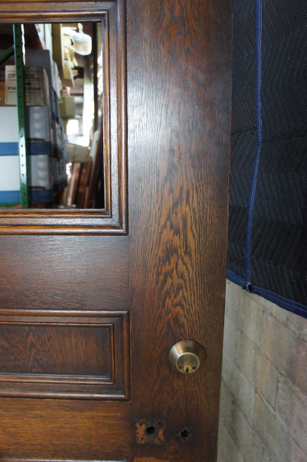 This massive arched solid oak door comes from one of the first homes built in Oakwood, Ohio by Harry I Schenck. It is the original front door, circa early 1900s. Features eight panels and two square inserts for leaded, stained or art glass. A nice statement for any estate. Very heavy.