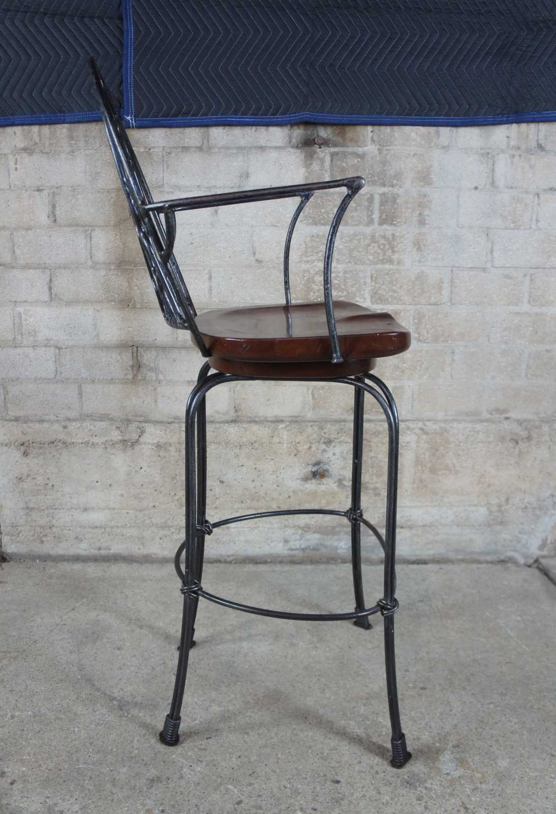 Late 20th century gothic and spanish inspired wrought iron bar stools with mahgany saddle seat. Stools features swivel action and foot bar. Very heavy.