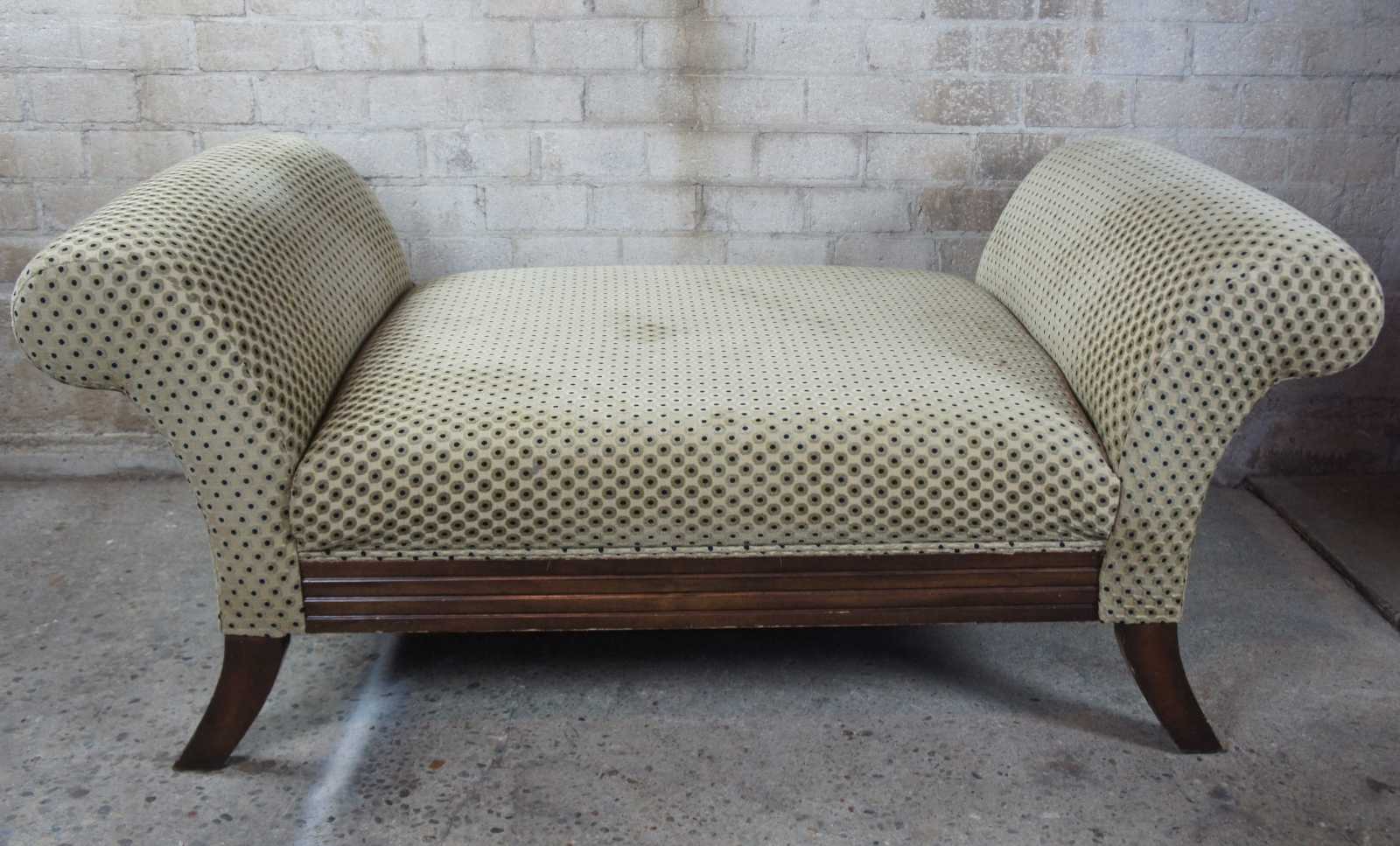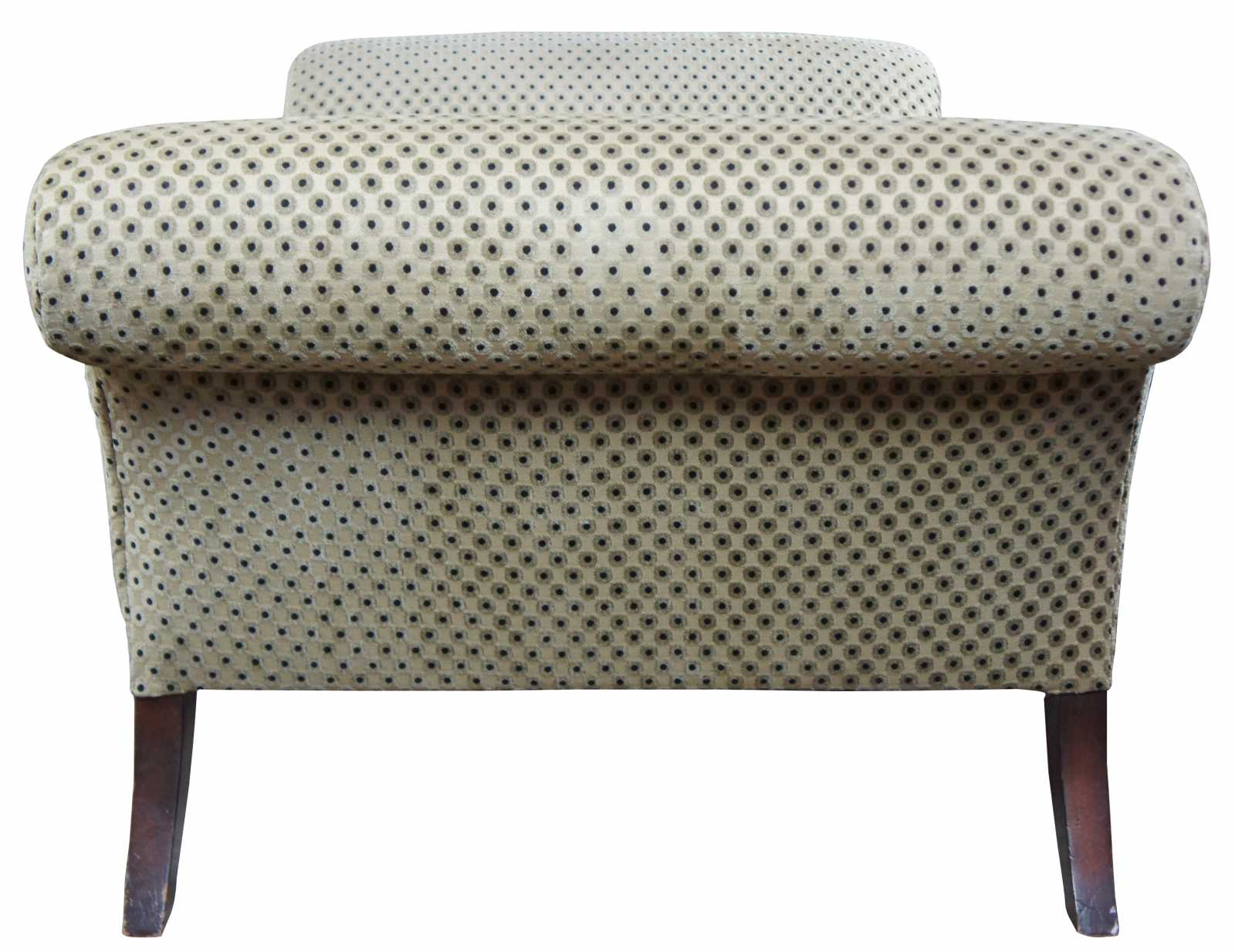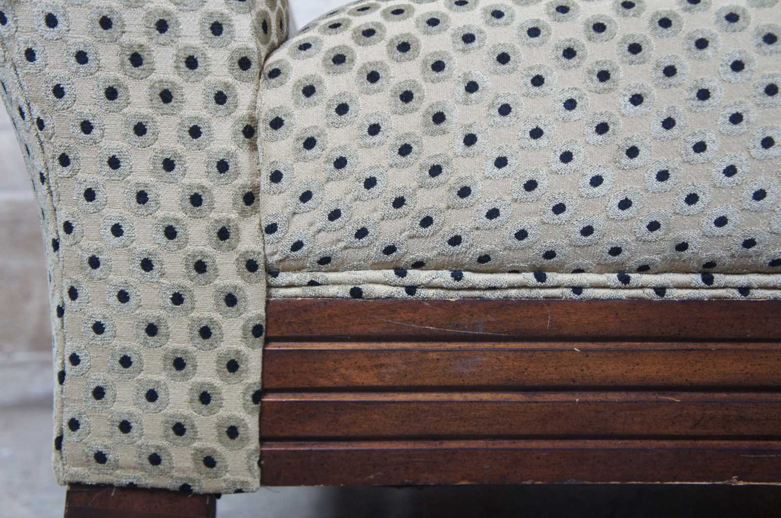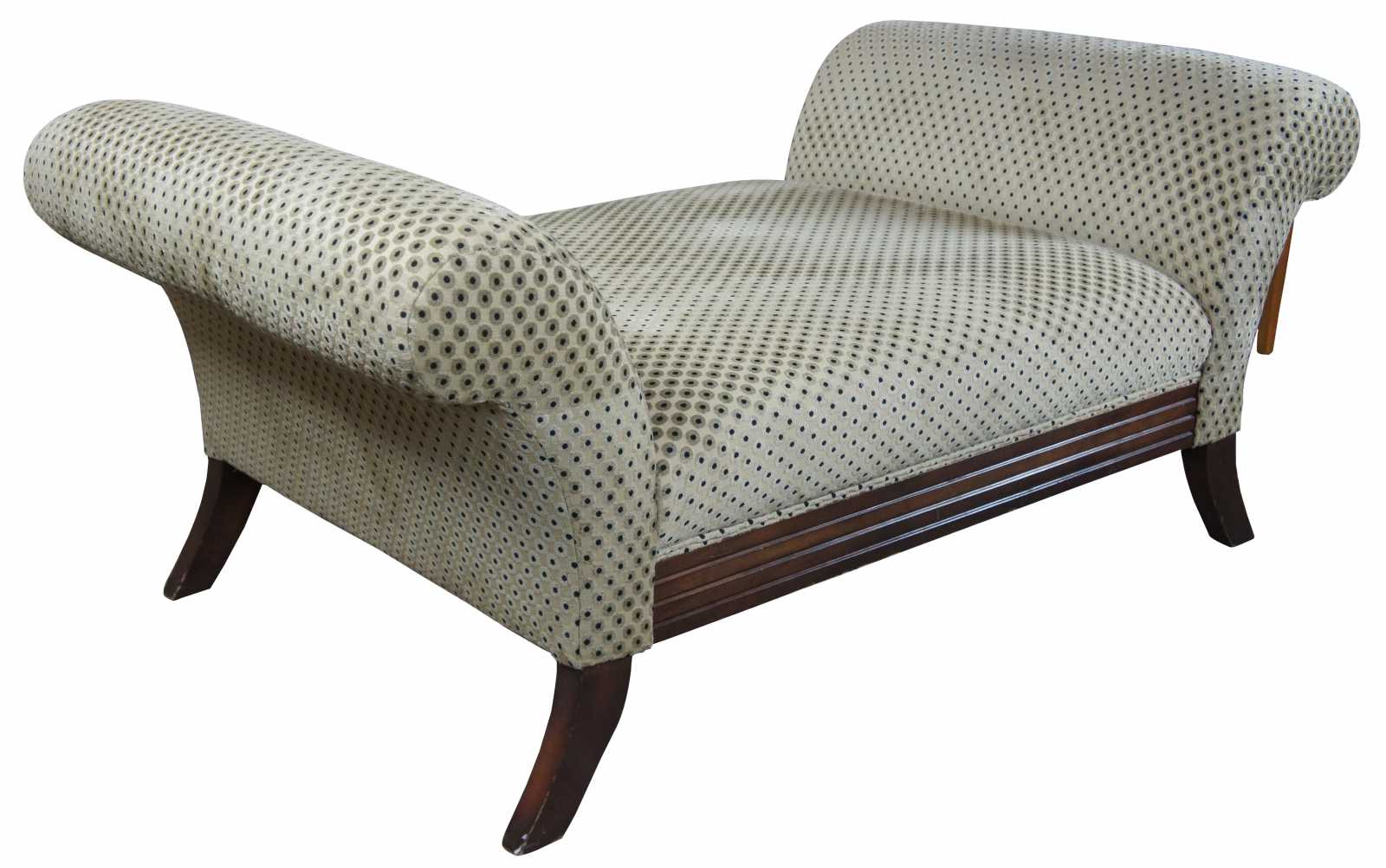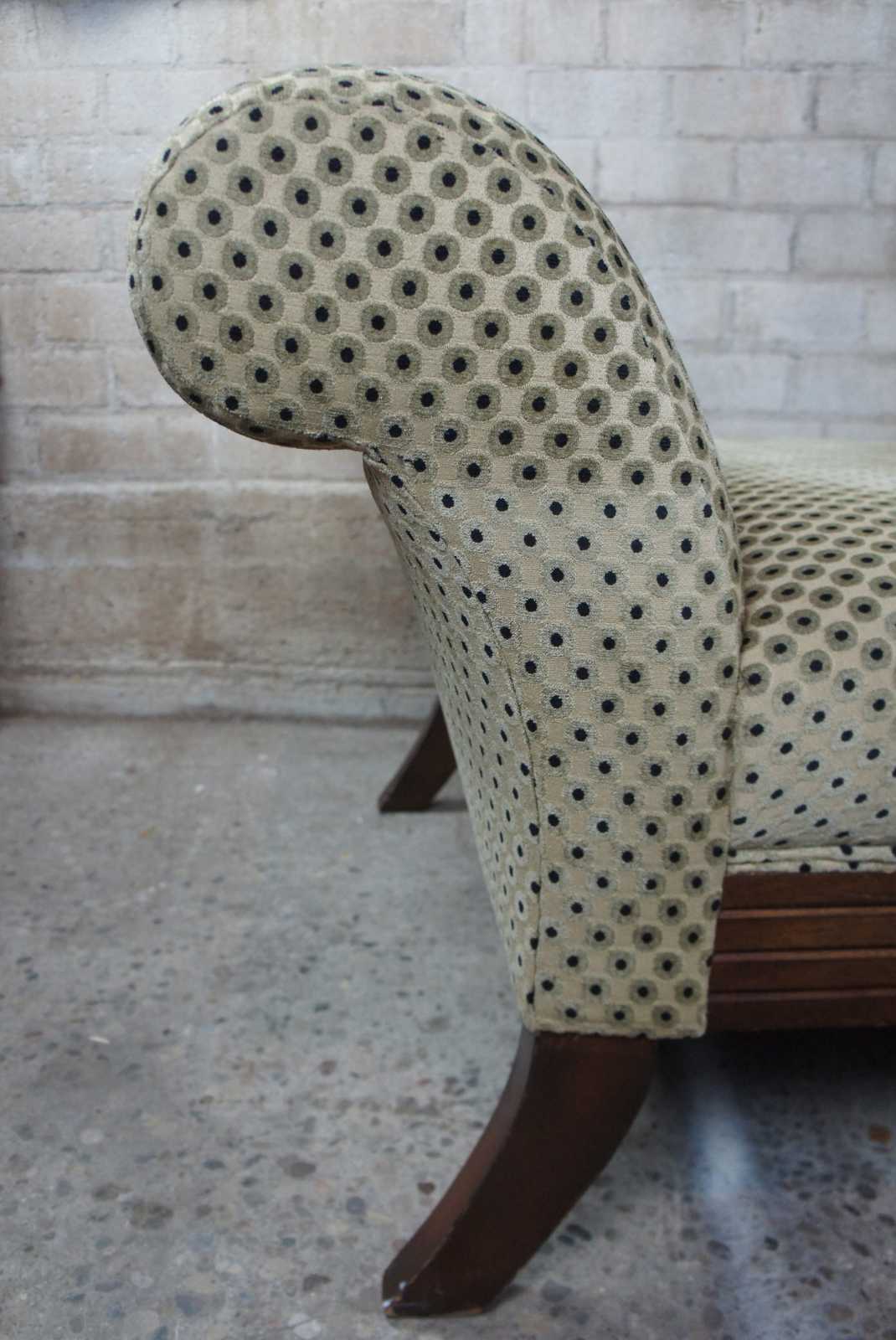 Polka dot upholstered day bed or settee. Features rolled arms over flared legs and a mahogany toned finish. Olive green and black sheened upholstery.