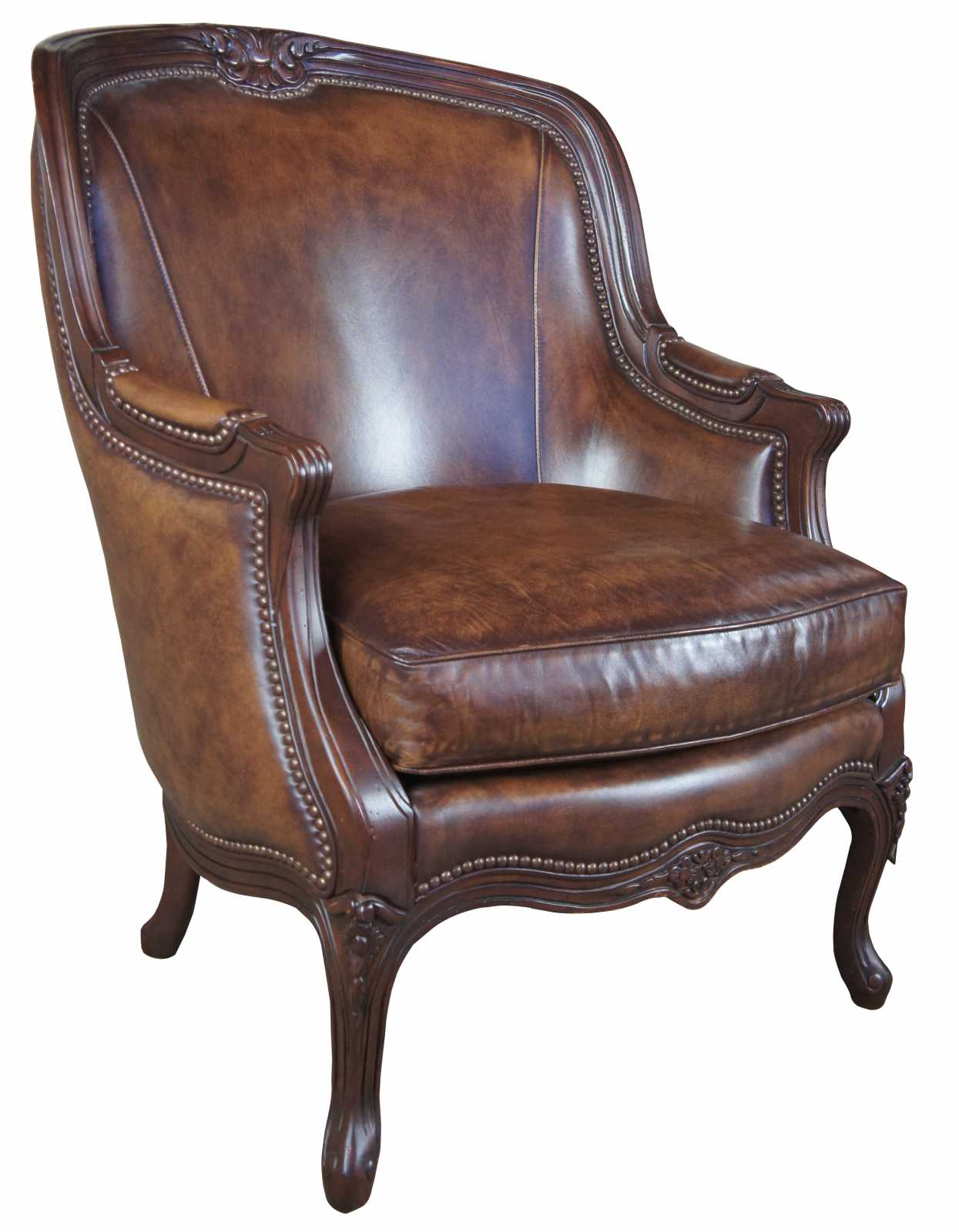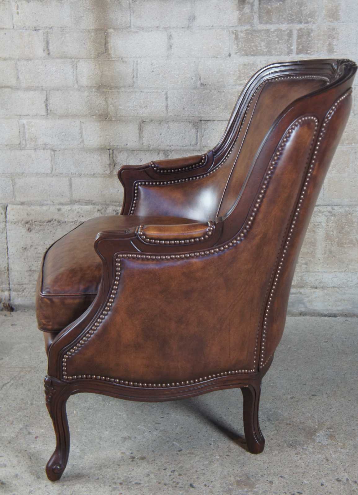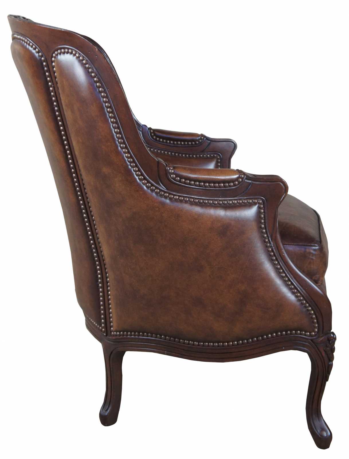 Handcock & Moore Bergere chair, features a brown leather upholstery with nailhead trim, mahogany finished frame with carved detail.