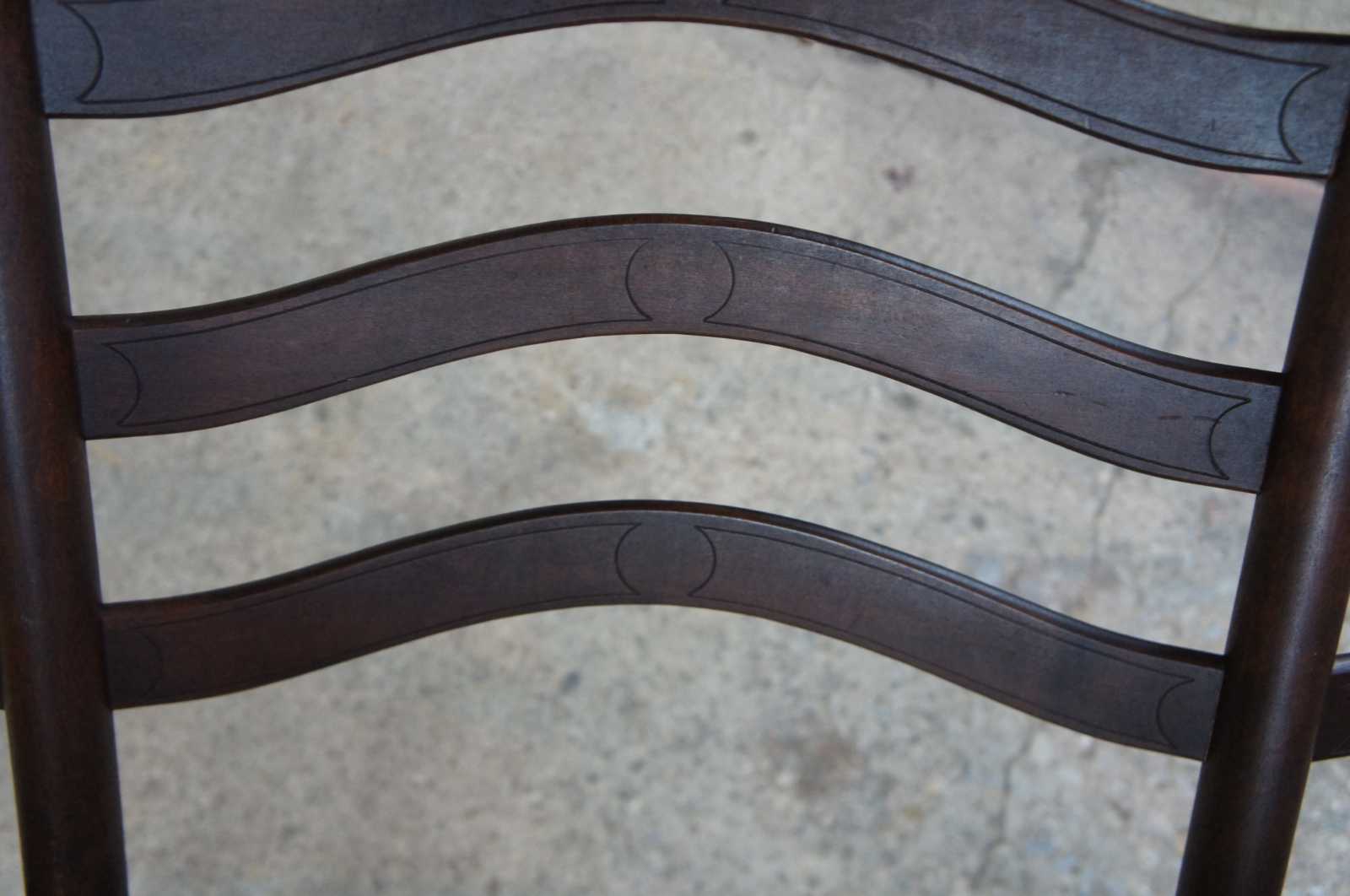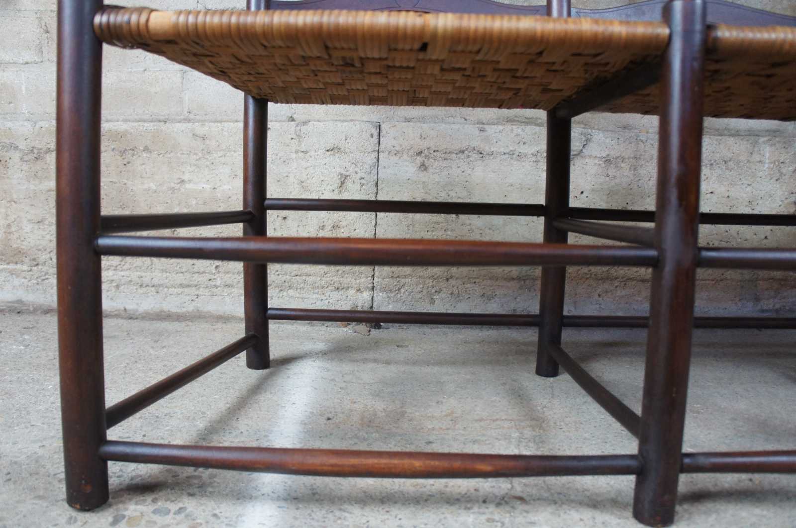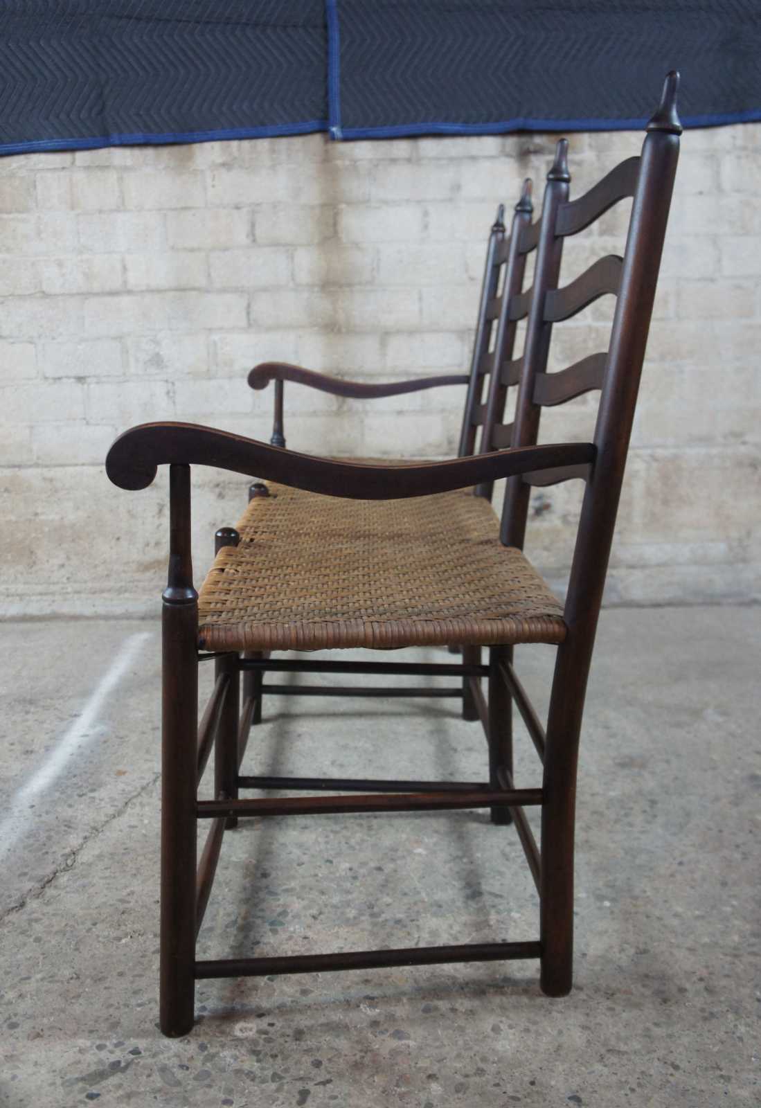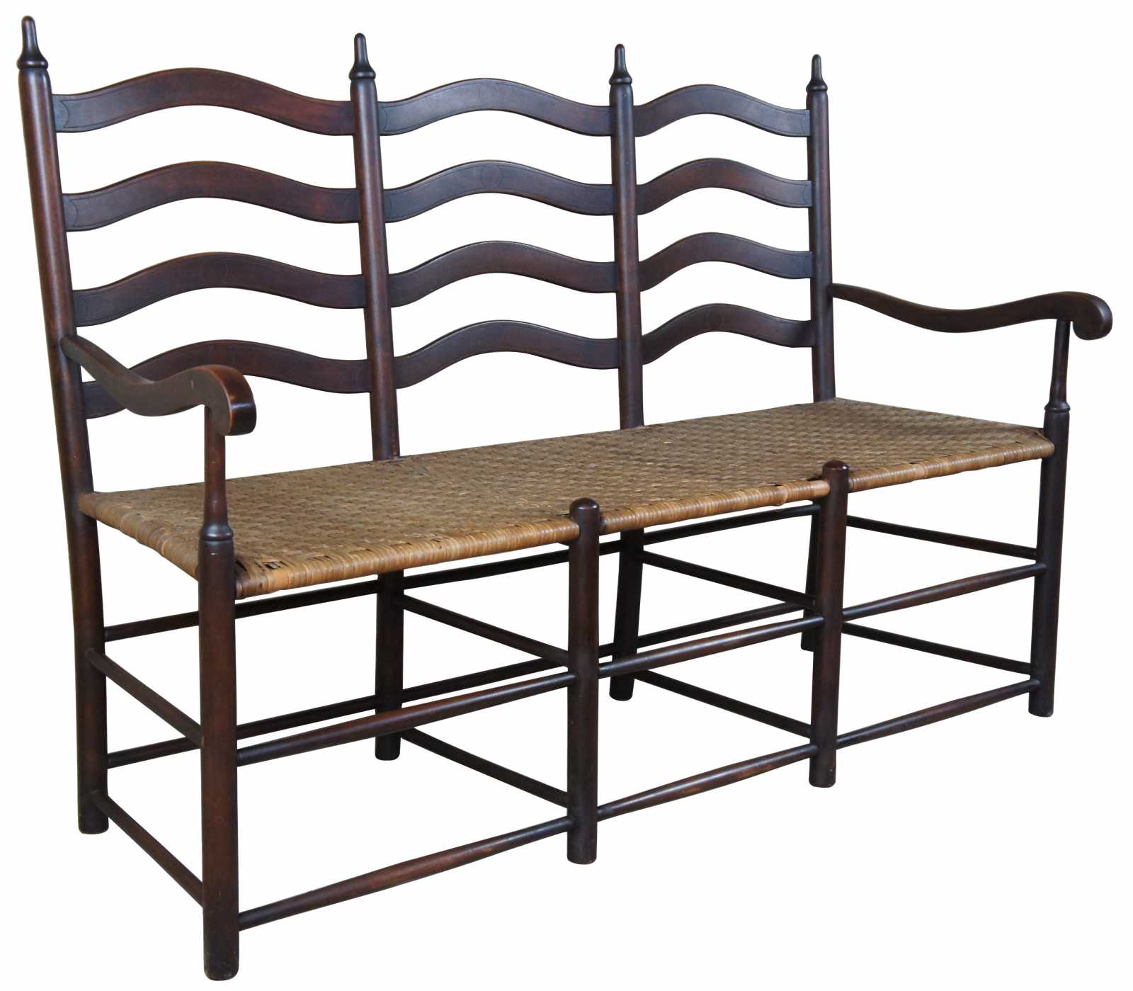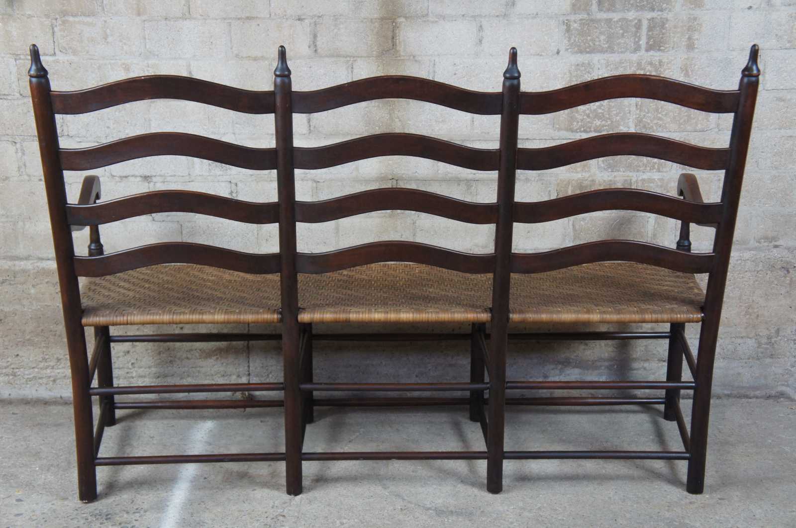 20th century pine Shaker style bench. A three seater with ladder back design. Features turned finials and rattan seat.