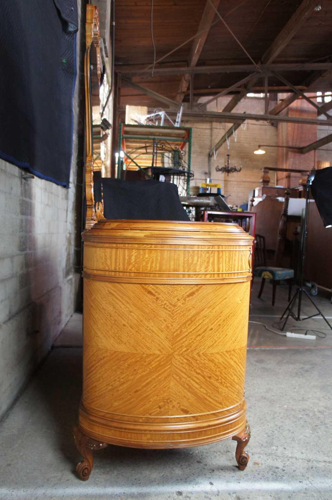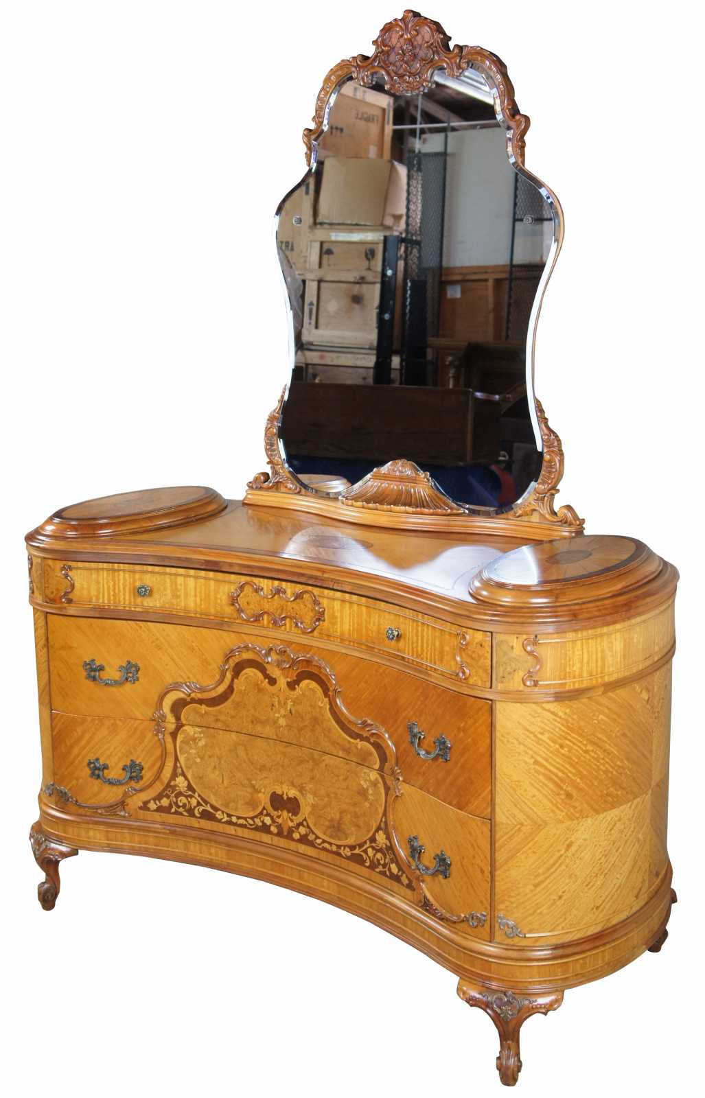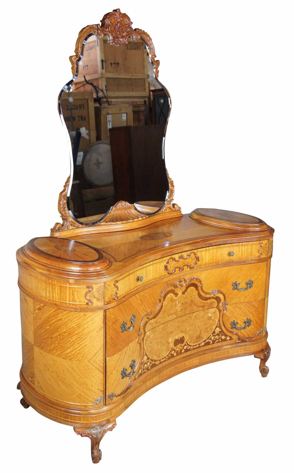 Circa 1920s French dresser and mirror. Features a curved shape with matchbook veneering and burled accents. Made from walnut, ornately carved. Includes three drawers, and cabriole scrolled feet.