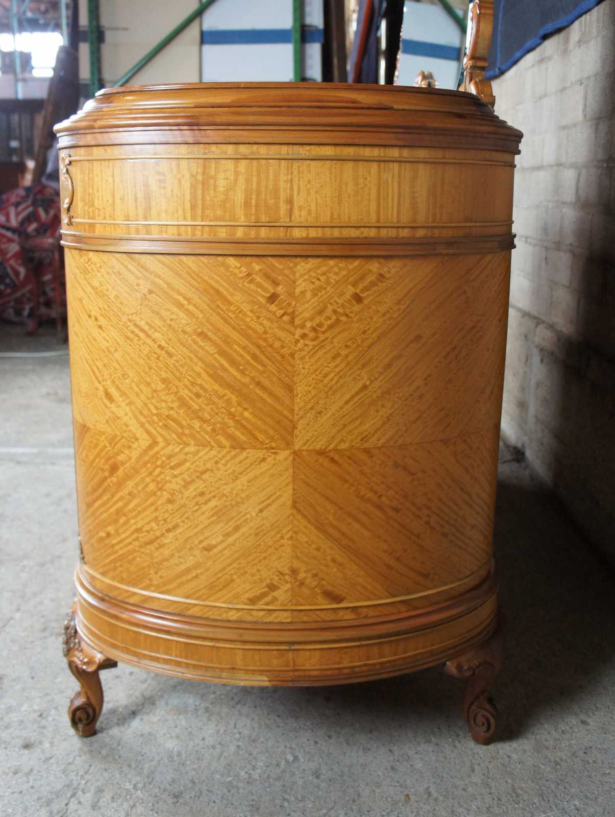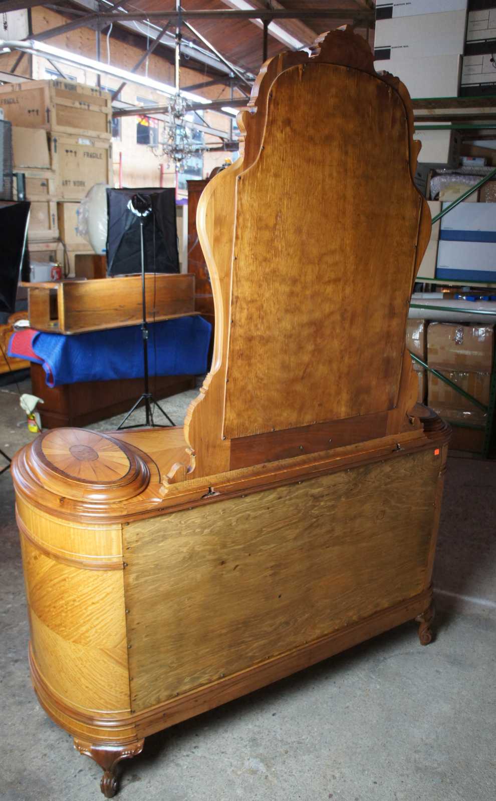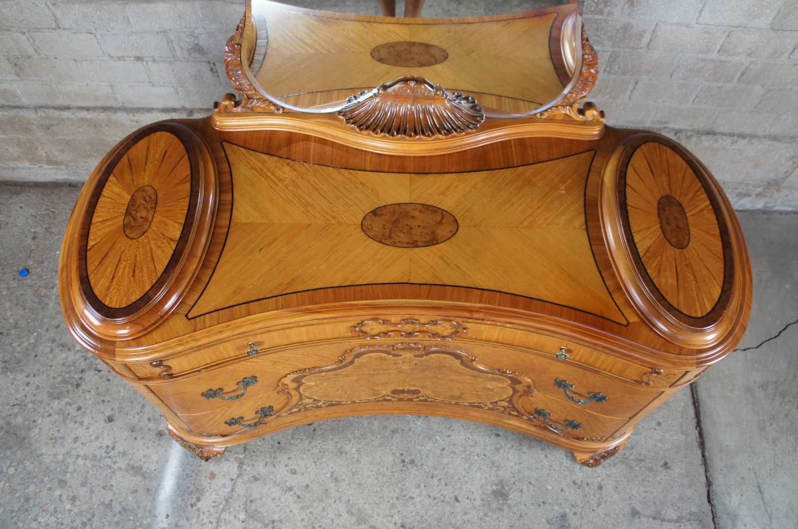 Circa 1920s French dresser and mirror. Features a curved shape with matchbook veneering and burled accents. Made from walnut, ornately carved. Includes three drawers, and cabriole scrolled feet.