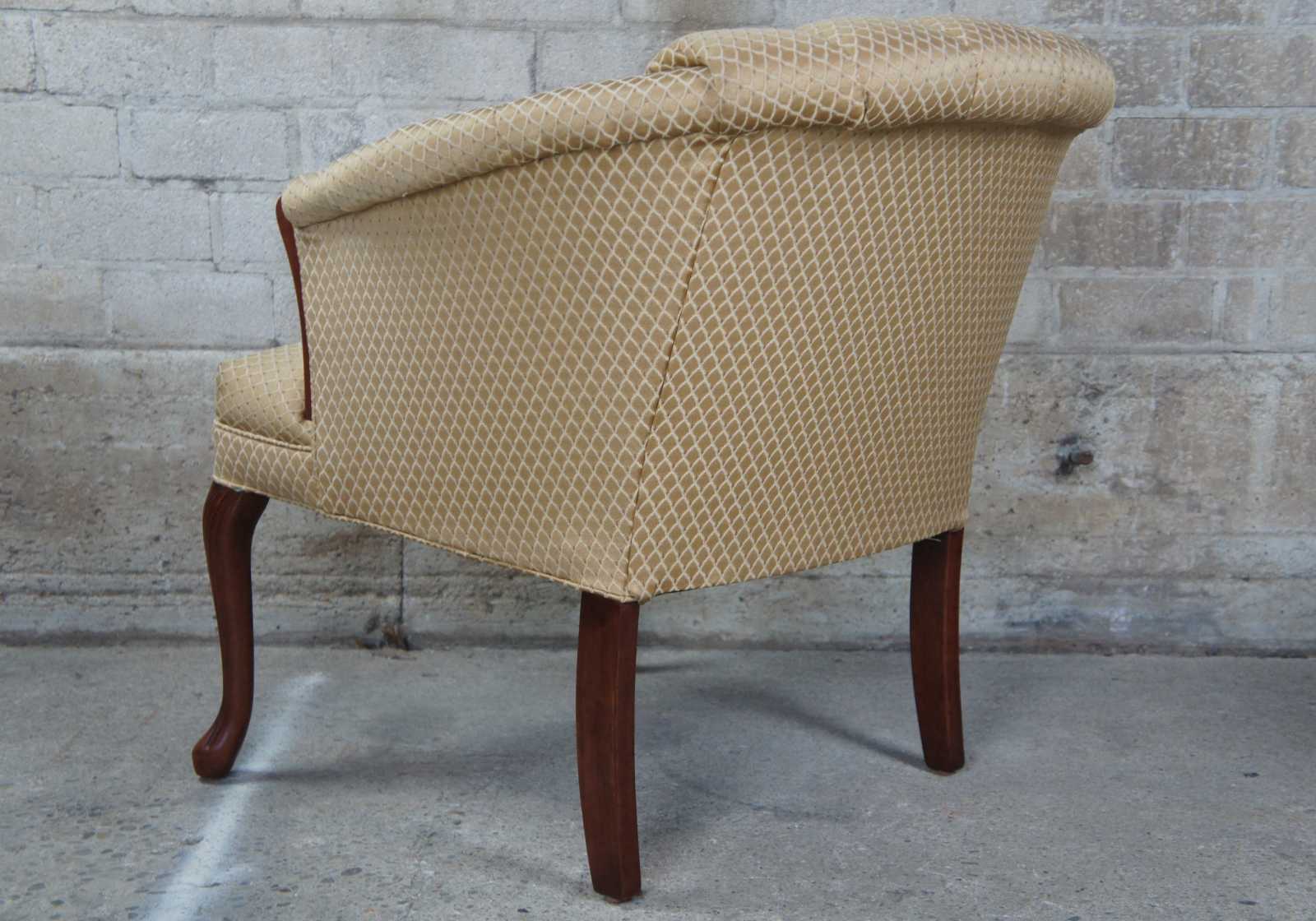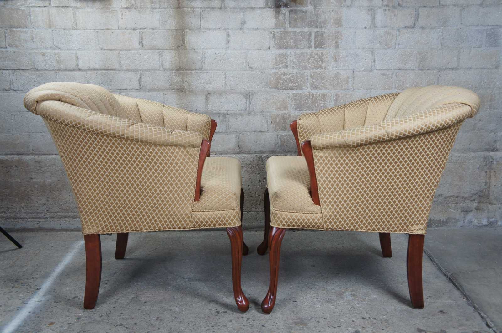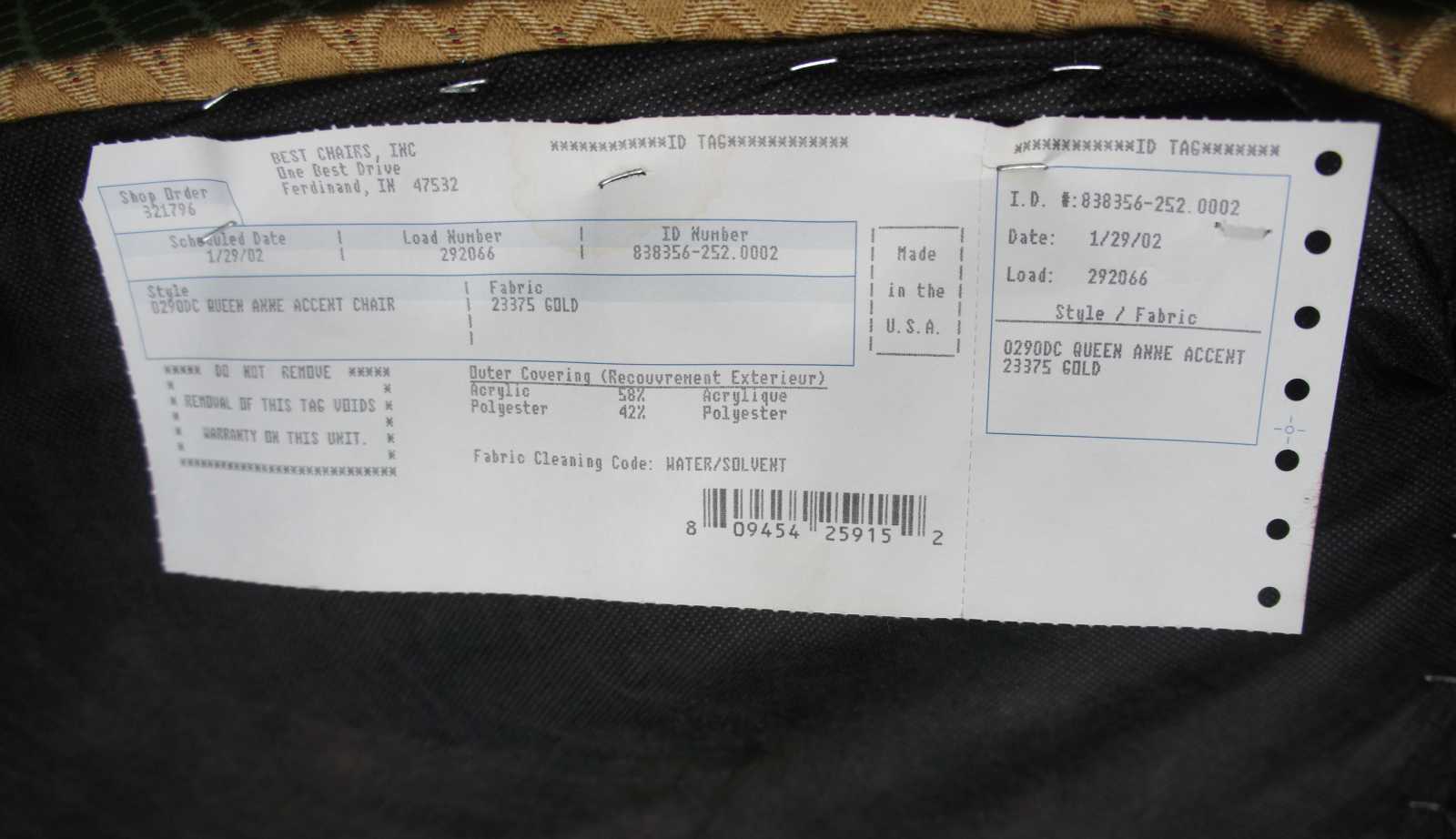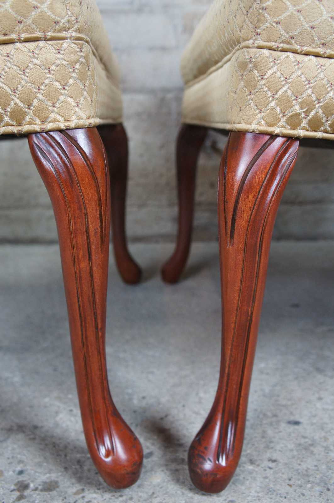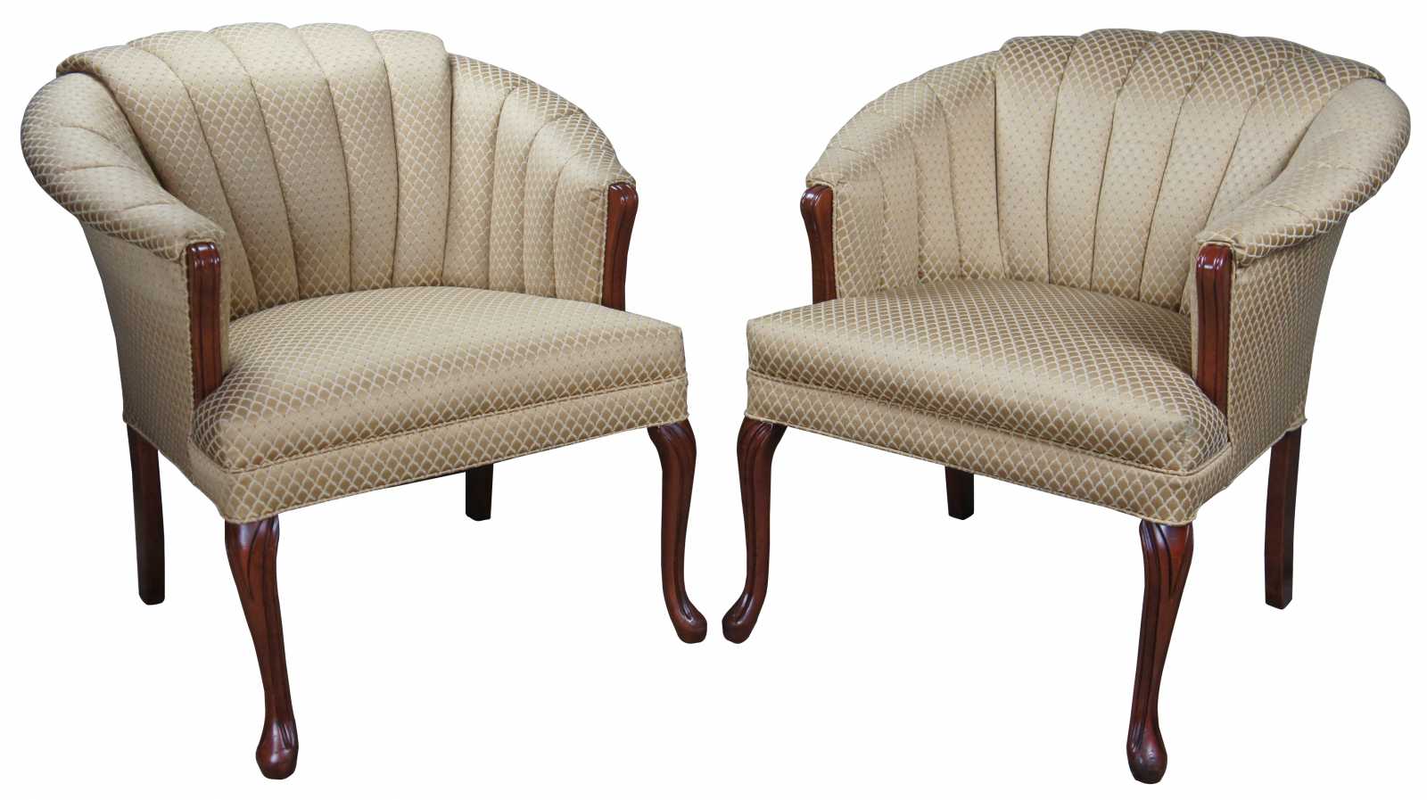 The Queen Anne accent chair by Best Chairs Inc. #0290DC. Features Art Deco styling with channel back upholstered in gold. Each chair features exposed wood frame made from cherry with queen anne legs.