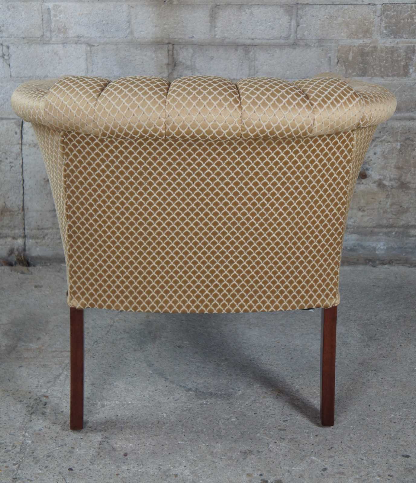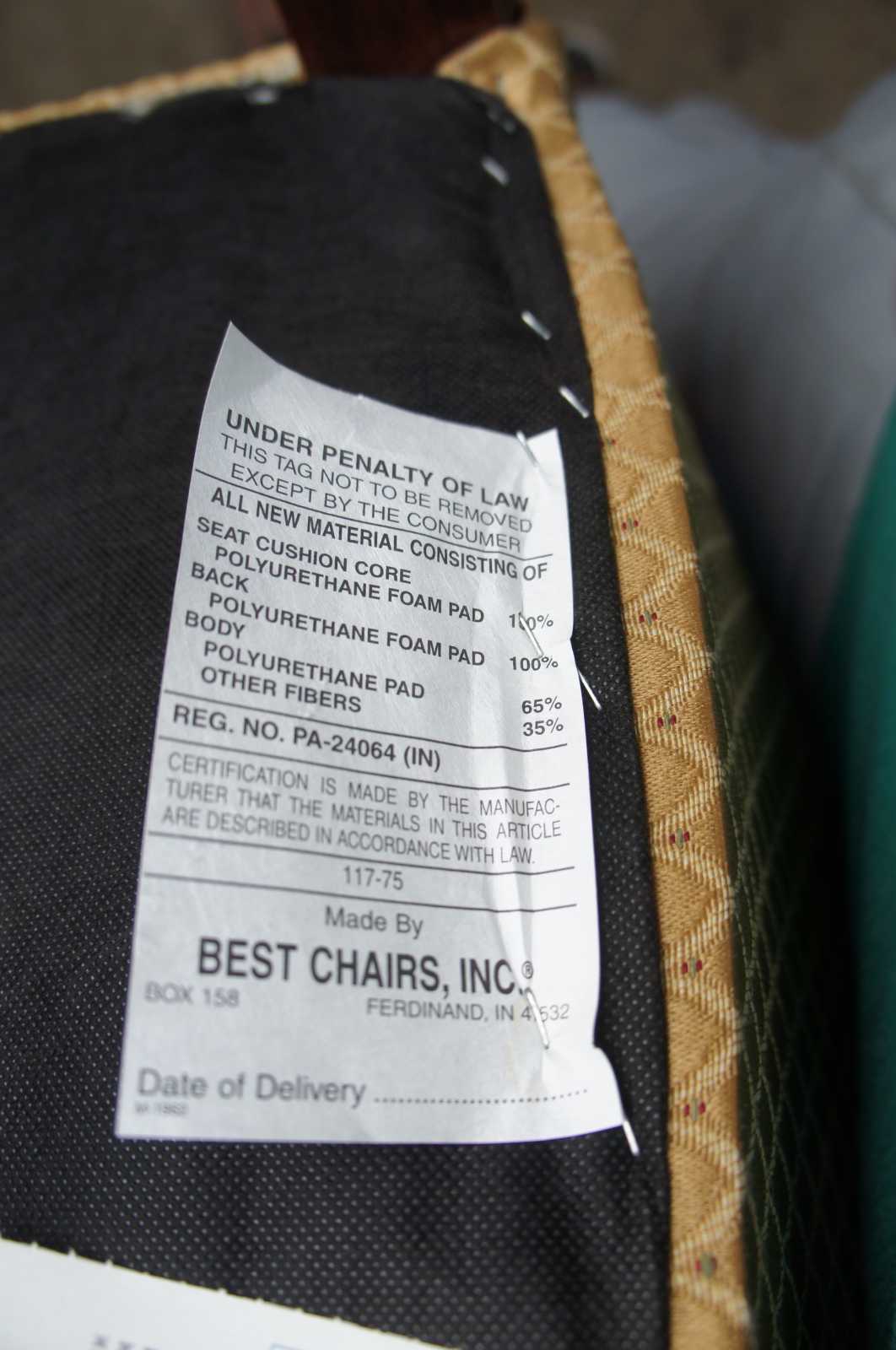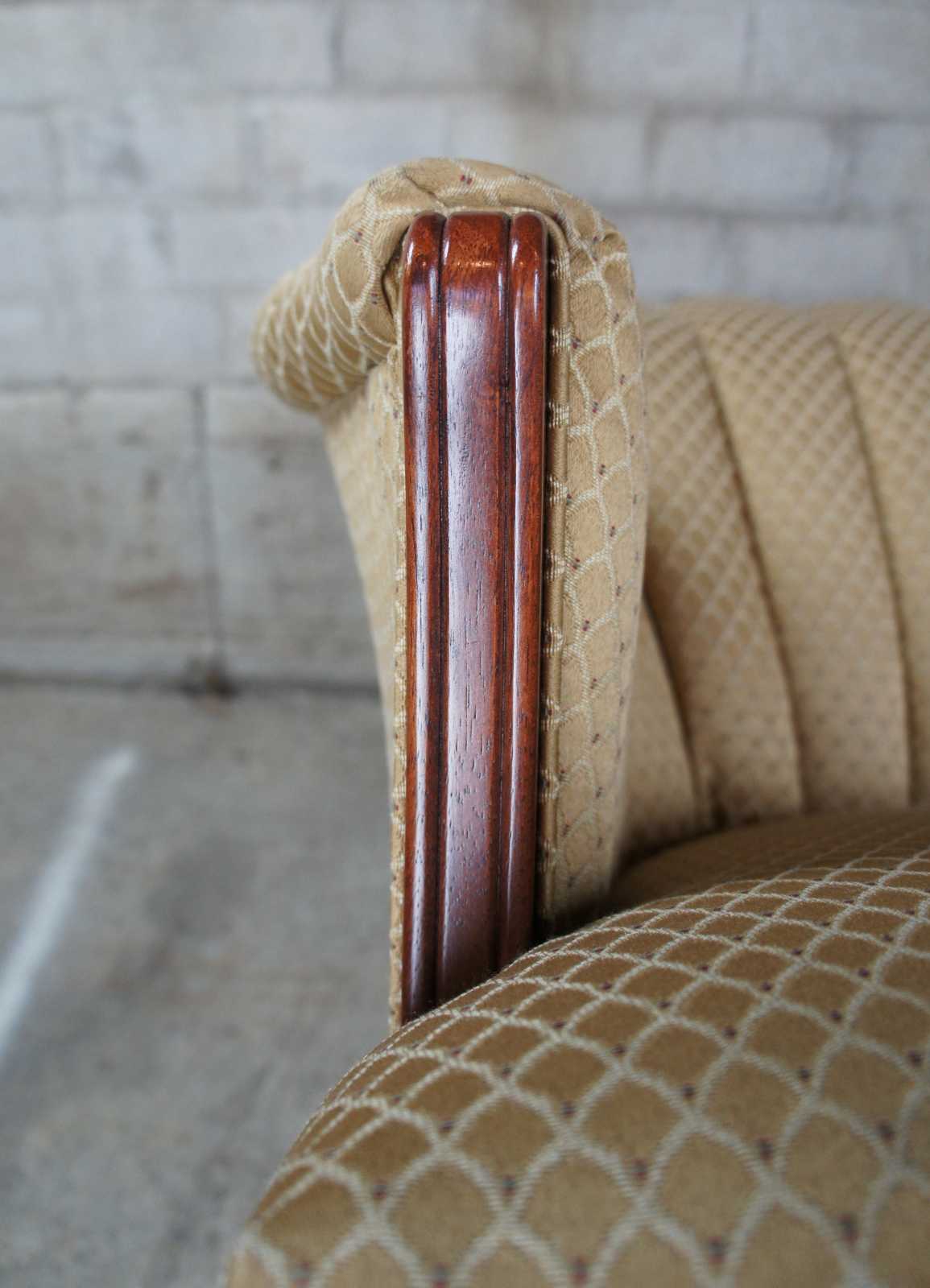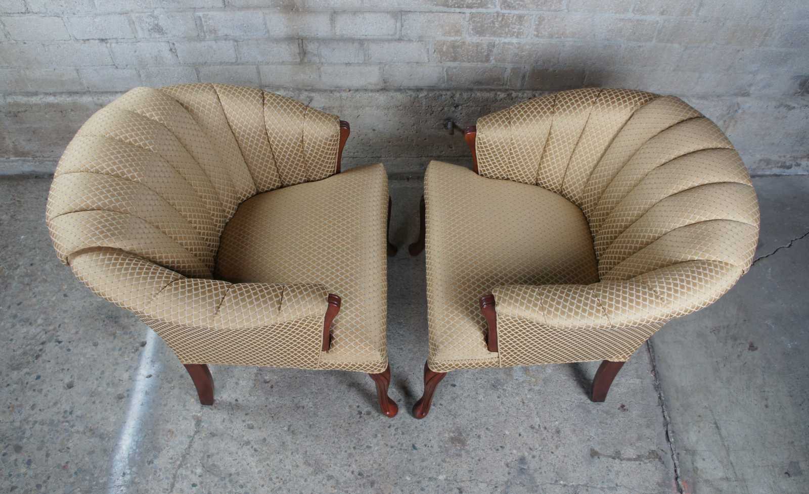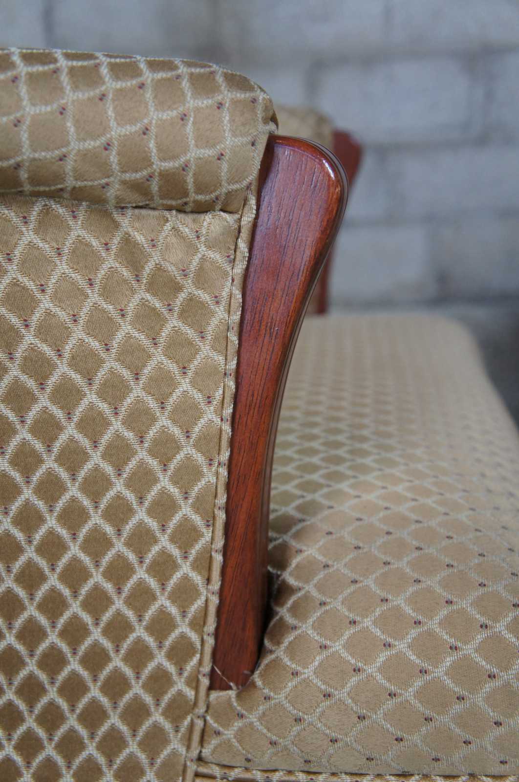 The Queen Anne accent chair by Best Chairs Inc. #0290DC. Features Art Deco styling with channel back upholstered in gold. Each chair features exposed wood frame made from cherry with queen anne legs.