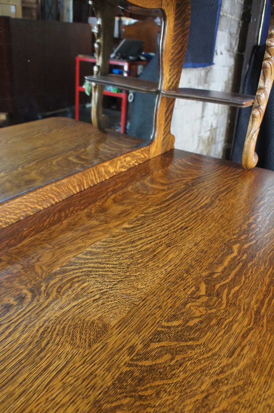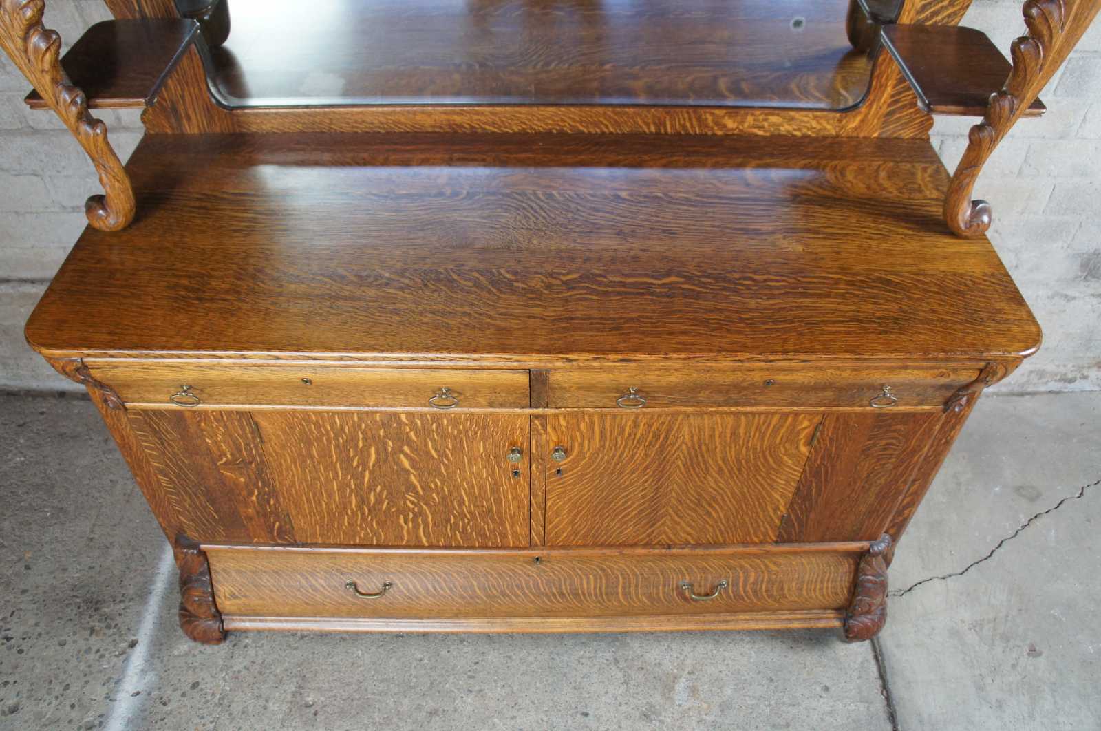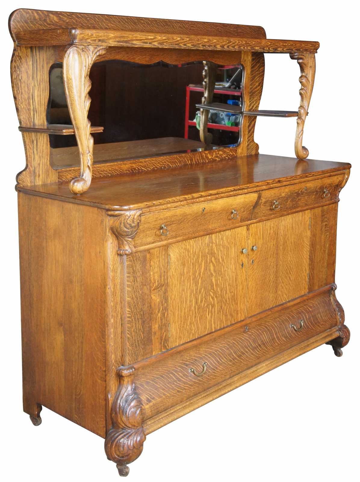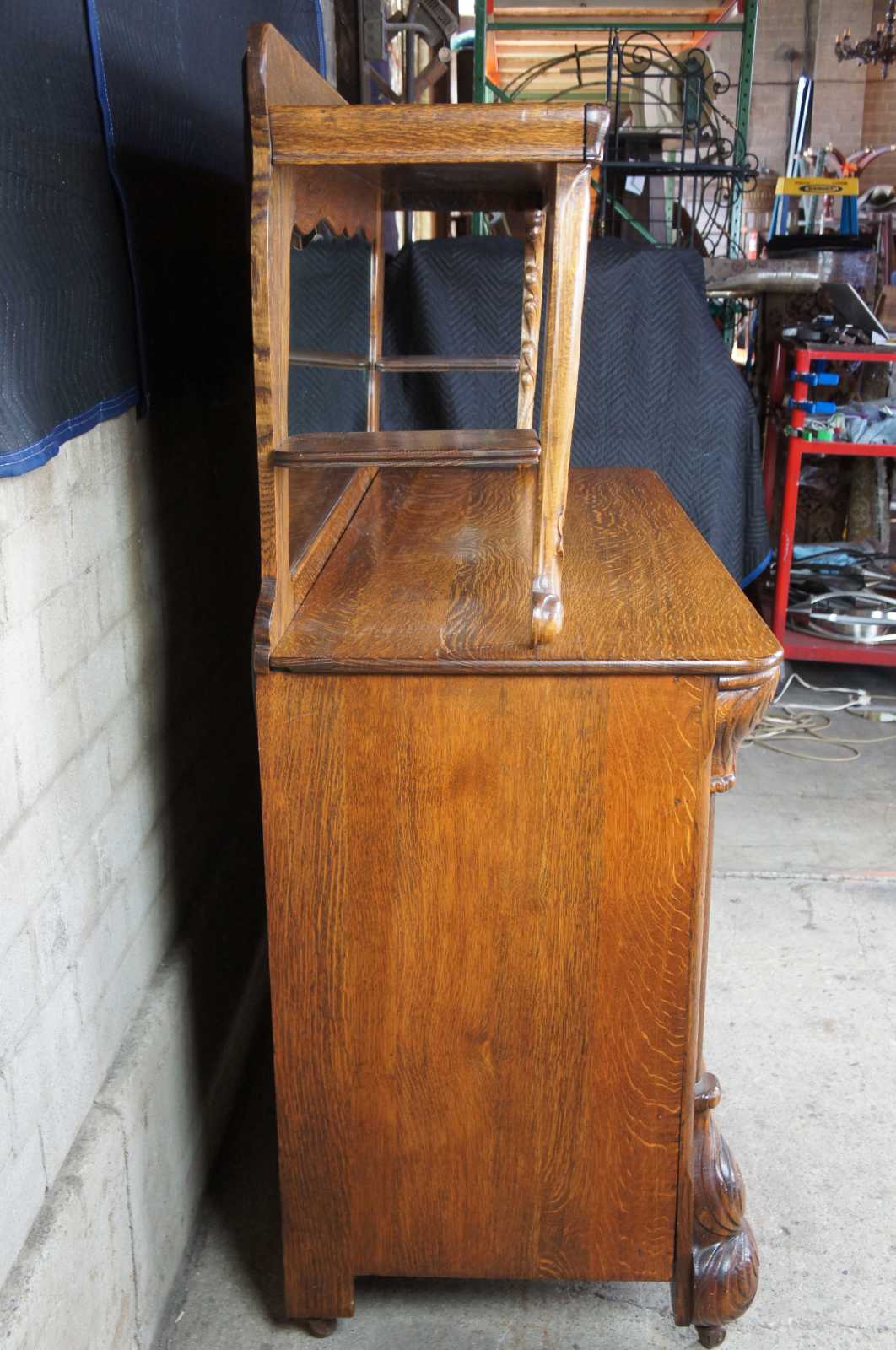 Turn of the 20th century oak sideboard with mirror. Features a large upper surface making it perfect for use as a bar back. Includes three drawers, interior cabinet with shelves and serpentine beveled mirror. On castors for ease of movement.